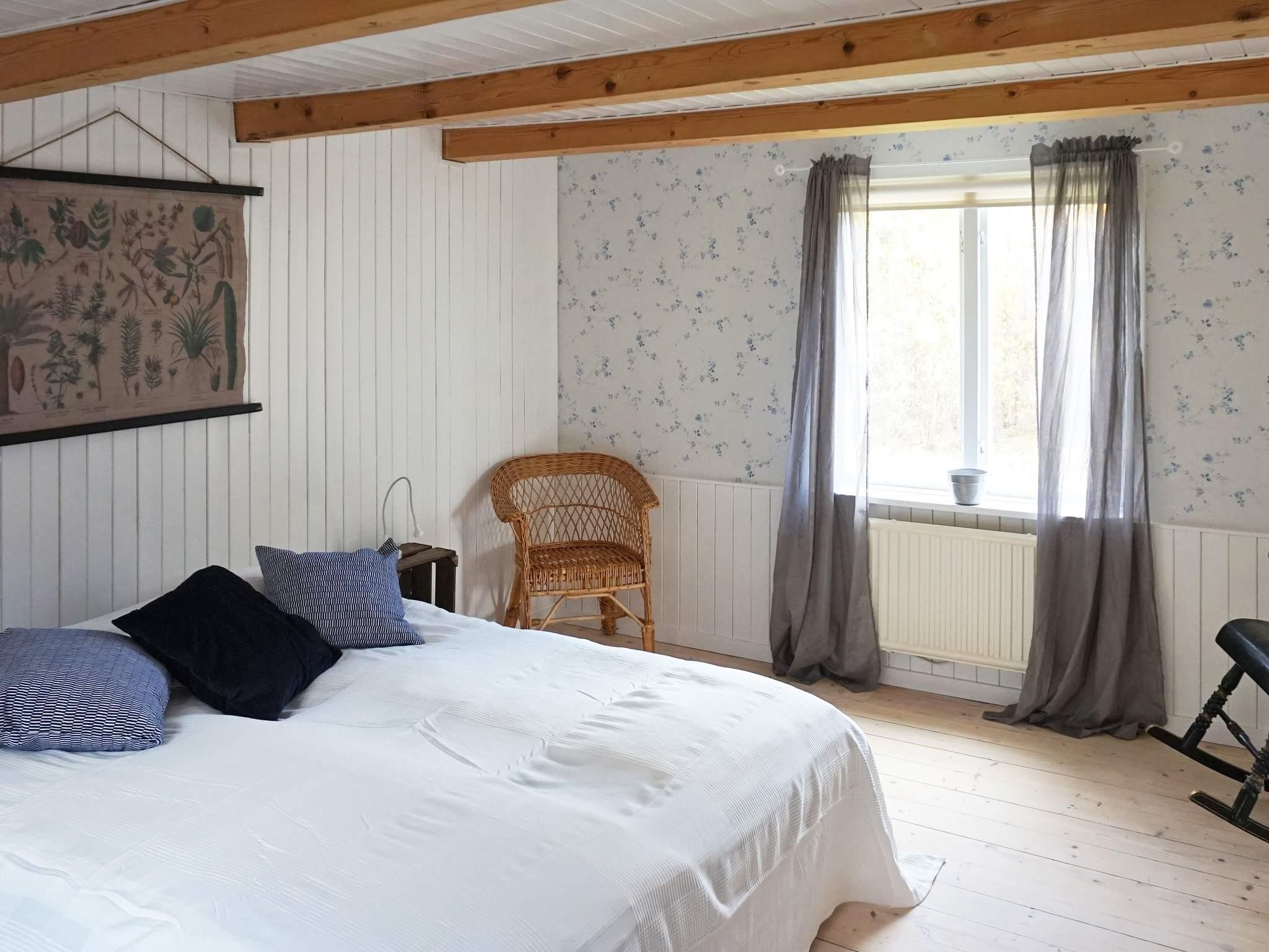 Im Obergeschoss liegen zwei weitere Schlafzimmer. In dem Schlafzimmer mit Ofen sind ein Einzelbett und ein Sofa untergebracht, zudem gibt es dort mehrere Fenster mit Ausblick in verschiedene Himmelsrichtungen. Im zweiten Schlafzimmer stehen zwei Einzelbetten bereit. Das Haus selbst macht generell einen sehr hellen, wohnlichen Eindruck und ist auch im Winter nutzbar. Derzeit wird das Haus mit elektrischen Heizkörpern beheizt.