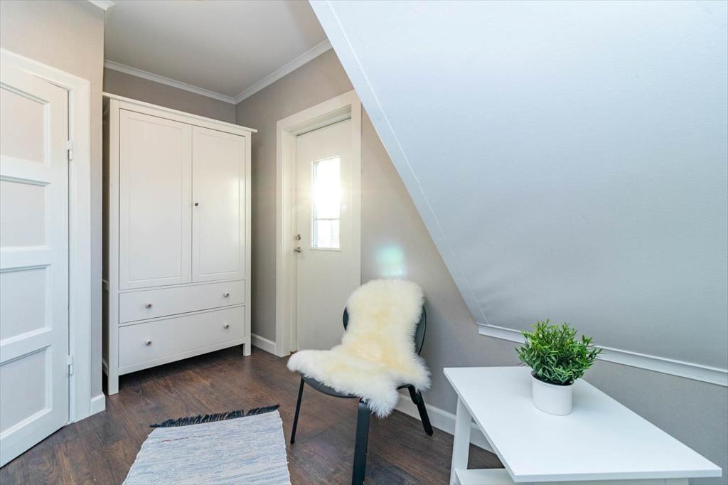 På første sal finder du to soveværelser – det ene med dobbeltseng, det andet med køjeseng. Fra den lille repos har du adgang til en balkon, hvor du kan nyde udsigten ud over det grønne. I kælderen står en vaskemaskine til rådighed. Udendørs venter en møbleret terrasse med grill, perfekt til hyggelige sommeraftener. Parkering findes direkte ved huset, og brænde er inkluderet i prisen.