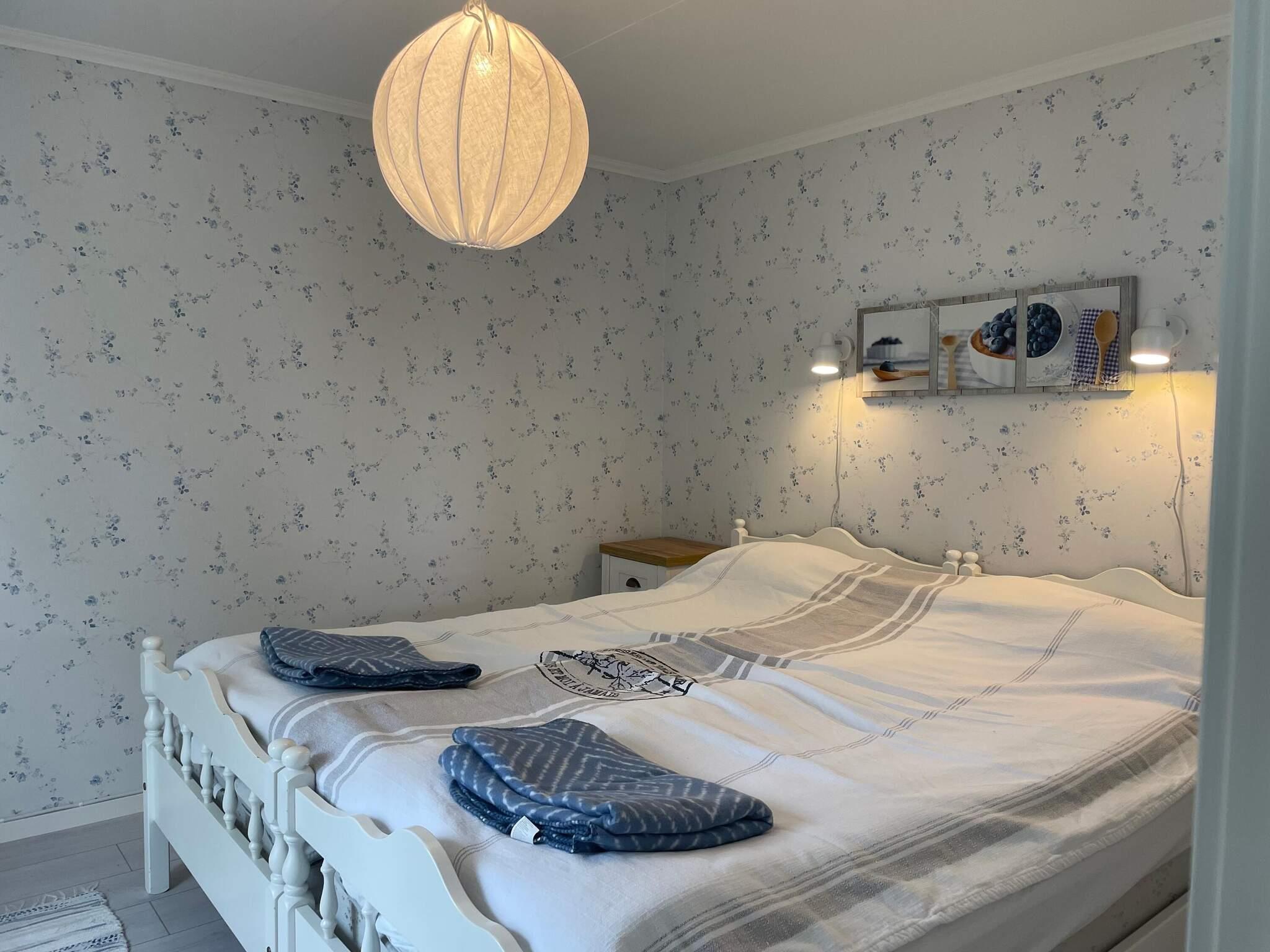 Im Haus helle Diele mit Zugang zum offenen Küchen-/Wohnbereich mit Ess- und Sitzecke für das Familienleben. Der Essbereich verfügt über einen Tisch und Stühle für 4 Personen und mit einem kleinen Fenster zum Schlafzimmer. Alles ist sehr charmant und heimelig. Im Schlafzimmer befindet sich ein 180 cm breites Doppelbett und auch hier haben Sie einen Blick auf den See und das Grundstück. Das Wohnzimmer hat große Fenster, sodass Sie die Natur draußen genießen können. Das Sofa ist ein Schlafsofa mit 140 cm Breite. Hier gibt es auch einen Fernseher mit schwedischen Sendern. Die Küche hat eine Küchenzeile mit zwei Herdplatten, Dunstabzug und Mikrowelle. Es gibt auch einen Kühlschrank mit einem kleinen Gefrierfach. Angrenzend befindet sich das Badezimmer. Das Badezimmer ist geräumig und mit Toilette, Waschbecken und Duschkabine ausgestattet.