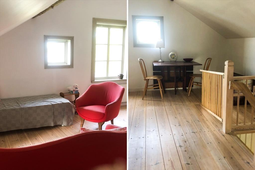 Der über hundert Jahre alte, frühere Bauernhof bietet auf etwa 130 m² Wohnfläche bis zu fünf Erwachsenen mit einem Kind Platz. Im Erdgeschoss findest du die Küche, ausgestattet mit Elektroherd mit Backofen, Kühlschrank mit Gefrierfach, Mikrowelle, Kaffeemaschine, Esstisch und Kinderhochstuhl. In dem an die Küche angrenzenden Esszimmer gibt es einen Kachelofen sowie einen Esstisch und eine Sitzgruppe. Außerdem befinden sich im Erdgeschoss noch ein mit einem Einzelbett möbliertes Schlafzimmer, in das auf Wunsch ein Extrabett zugestellt werden kann, sowie ein Badezimmer mit WC, Dusche, Handwaschbecken und Waschmaschine. Im Obergeschoss gibt es einen offenen Wohnraum mit einem Kaminofen, einer Sitzgruppe und einem Tischfußballspiel. In zwei offenen Abseiten neben dem mit Doppelbett möblierten Schlafzimmer befindet sich jeweils ein Einzelbett. Eine große Spiel- und Liegewiese um das Haus mit diversen Gartenmöbeln und Grill stehen dir ebenso zur Verfügung. Es gibt in diesem Haus kein Internet. Ein Ruderboot kann auf Anfrage genutzt werden. Ein Parkplatz für dein Auto ist vorhanden.