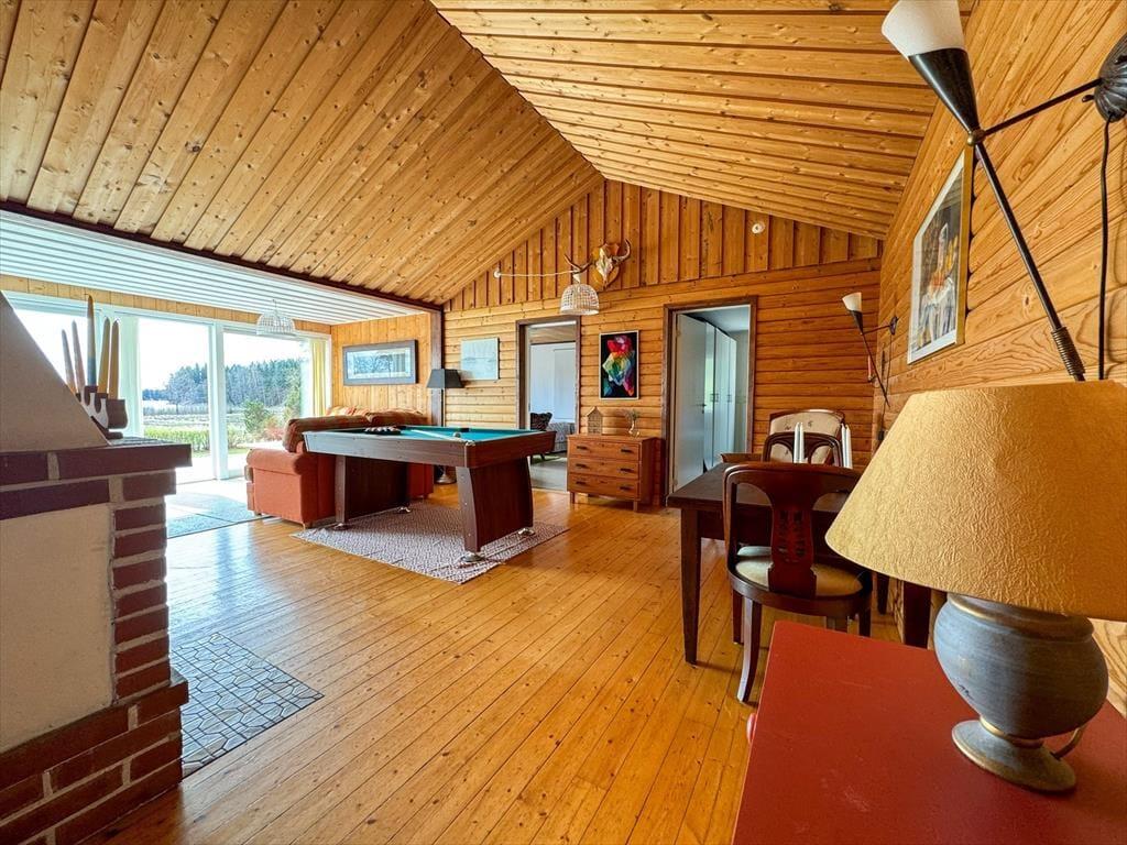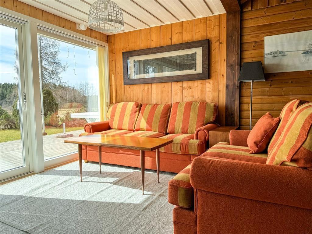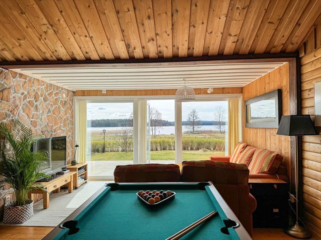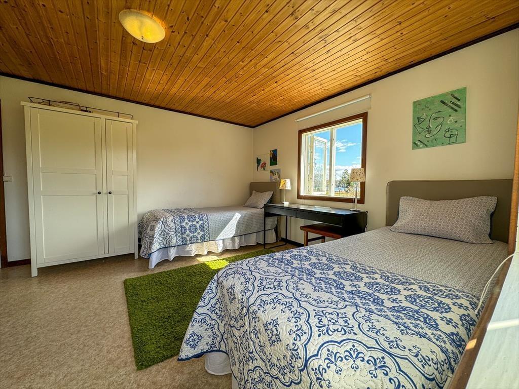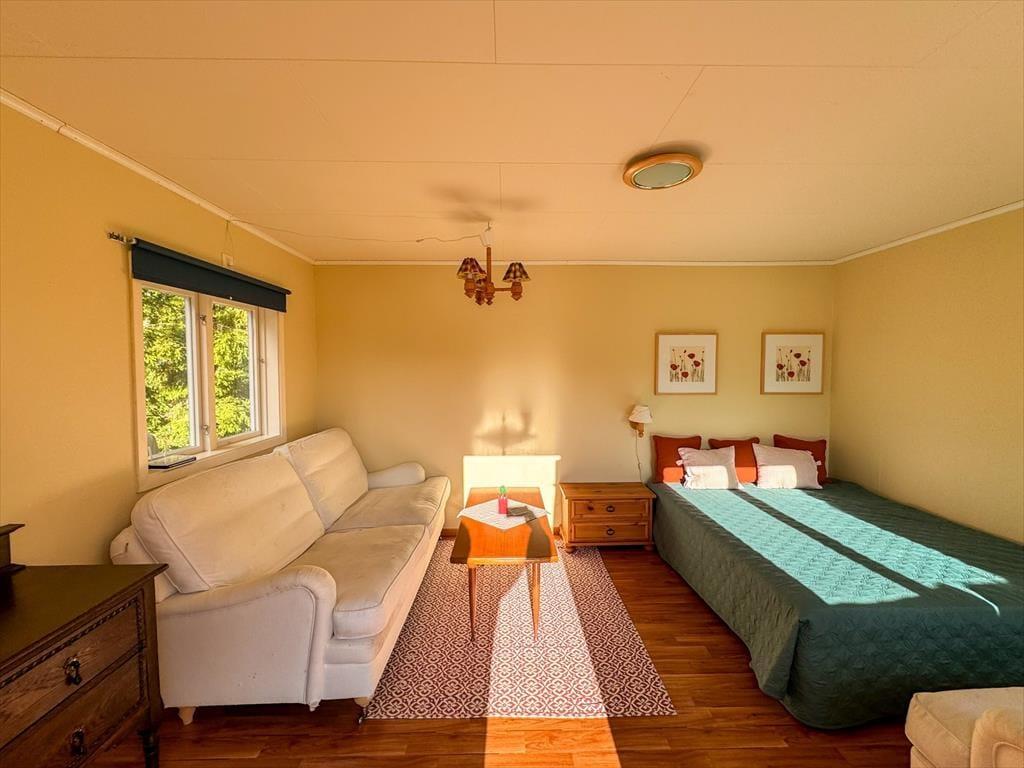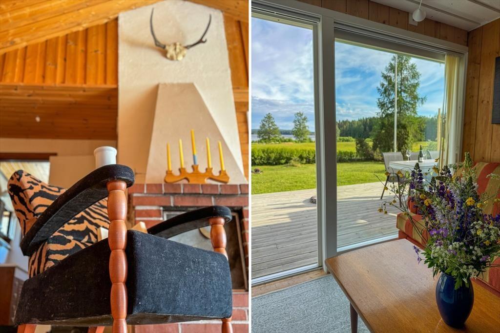 Das Sommerhaus Frövettern wurde im Jahr 1969 erbaut und besteht aus einem Haupthaus und einem Gästehaus. Die Wohnfläche beträgt etwa 95 m² im Haupthaus und etwa 15 m² im Gästehaus. Im Haupthaus findest du zwei Schlafzimmer: eines mit Doppelbett und eines mit einem Etagenbett. Das Gästehaus verfügt über zwei weitere Schlafzimmer. Eines ist ausgestattet mit einem Doppelbett und das andere mit zwei Einzelbetten, hier steht außerdem noch ein Bettsofa, - der Hauseigentümer wünscht jedoch eine Belegung mit bis zu 8 Personen. Die Küche ist geräumig und ausgestattet mit E-Herd, Backofen, Kühl- und Gefrierschrank, Mikrowelle und Kaffeemaschine; der Esstisch in der Küche bietet Platz für 6 Personen. Vom Wohnzimmer aus genießt ihr eine wundervolle Panoramaaussicht auf den See Frövettern. An kühlen Tagen entfacht ihr ein Feuer im offenen Kamin und genießt eure Mahlzeiten an dem großen Esstisch im Wohnzimmer, der Platz für 8 Personen bietet. Außerdem steht zur Unterhaltung ein Billardtisch bereit. Im Badezimmer stehen dir eine Dusche, fließend warmes Wasser, eine Waschmaschine und ein WC zur Verfügung. Zur Außenausstattung gehören Gartenmöbel auf der breiten Veranda mit Seeblick. Das Haus ist ausgestattet mit einem Grill und euer Auto könnt ihr direkt am Haus parken.