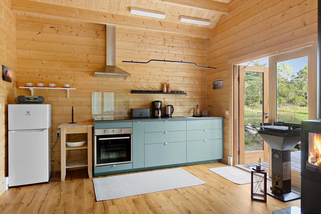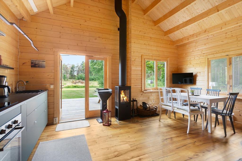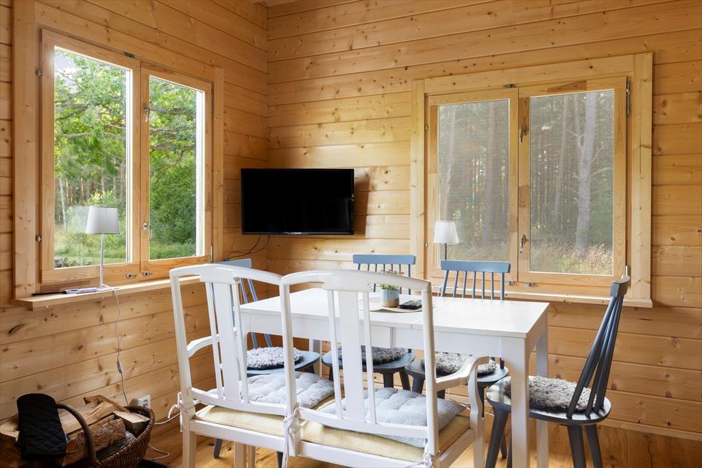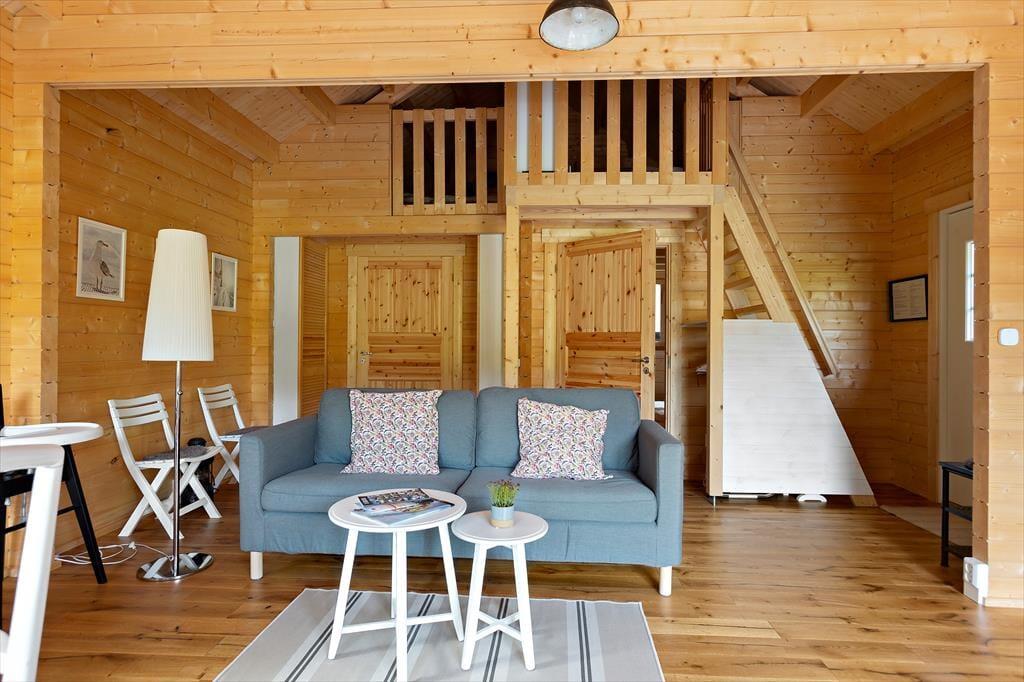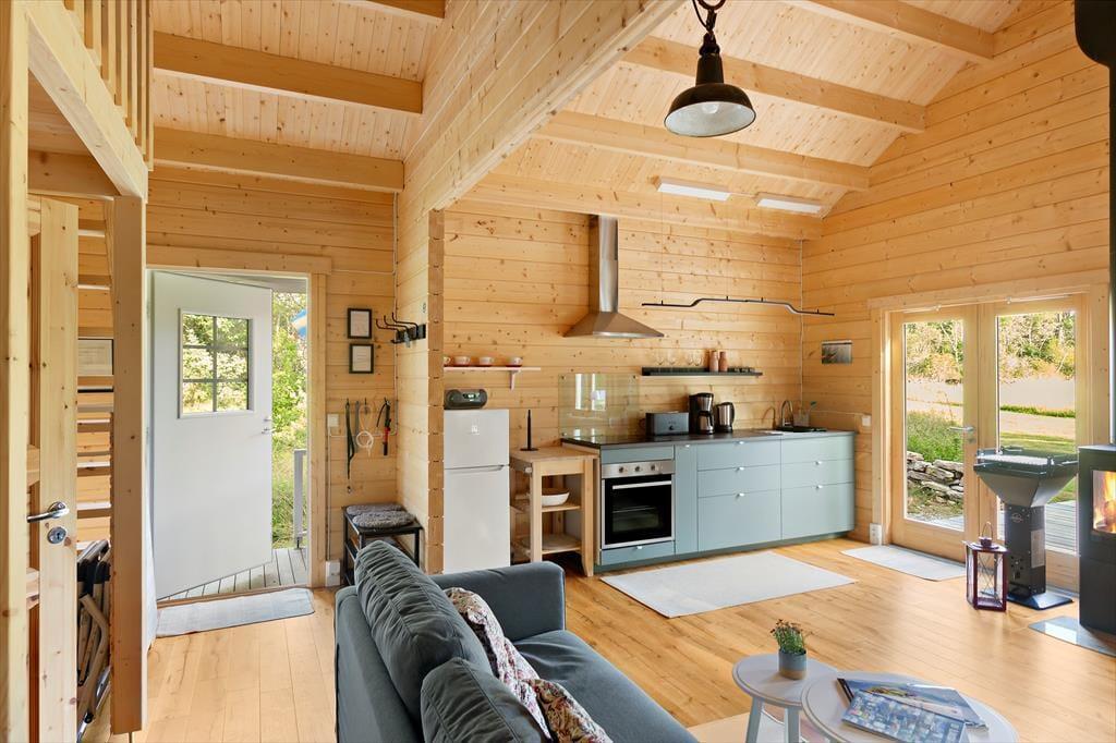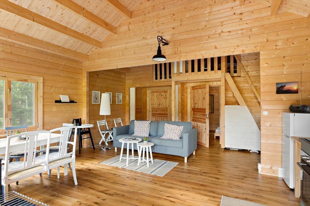 Das erst 2023 auf dem Grundstück der deutschen Vermieter erstellte Gästehaus verfügt über eine Wohnfläche von etwa 63 m² und bietet für bis zu 5 Feriengäste Schlafplätze. Über den Eingangsbereich gelangt man in einen im skandinavischen Stil mit Kiefernholzpaneele vertäfelten offenen „Allrum“ (Familienzimmer) in dem ein gemütlicher Wohn- und Essbereich mit Sofa, Kamin und Flat-TV mit deutschen Programmen sowie ein Esstisch und die Küche untergebracht sind. Die Küche selbst ist mit einem Induktionsherd mit Backofen und Dunstabzugshaube, Kühl- Gefrierkombination, Kaffeemaschine und Wasserkocher ausgestattet. Vom „Allrum“ aus erreicht man auch das geräumige Duschbad mit WC und Handwaschbecken und ein Schlafzimmer mit zwei zu einem Doppelbett zusammengestellten Einzelbett. Drei weitere Betten befinden sich in einem Schlafloft, den man über eine steile Treppe im Eingangsbereich erreicht. Den Gästen stehen weiterhin ein Internetzugang über Glasfaserkabel sowie zwei Fahrräder zur Verfügung.