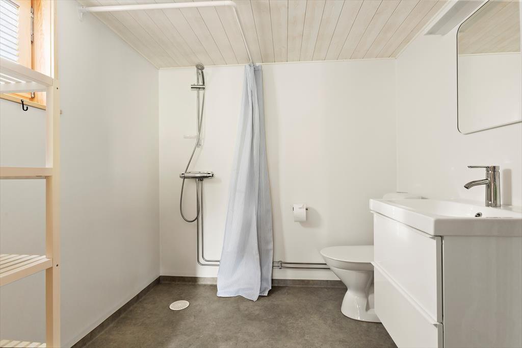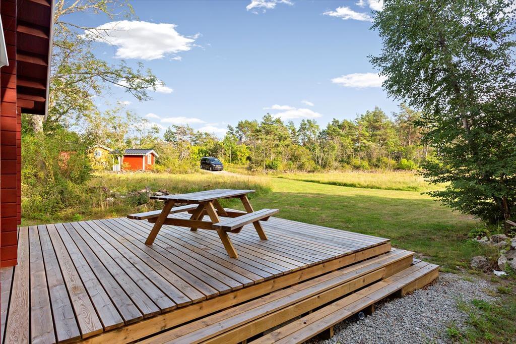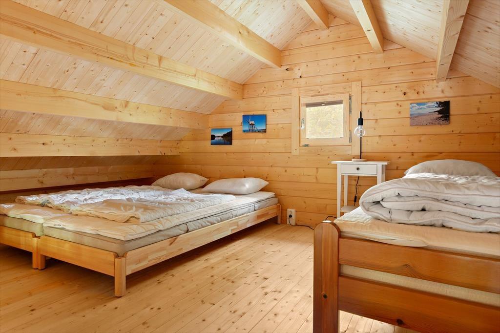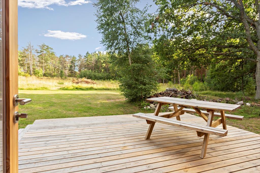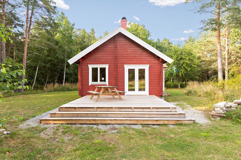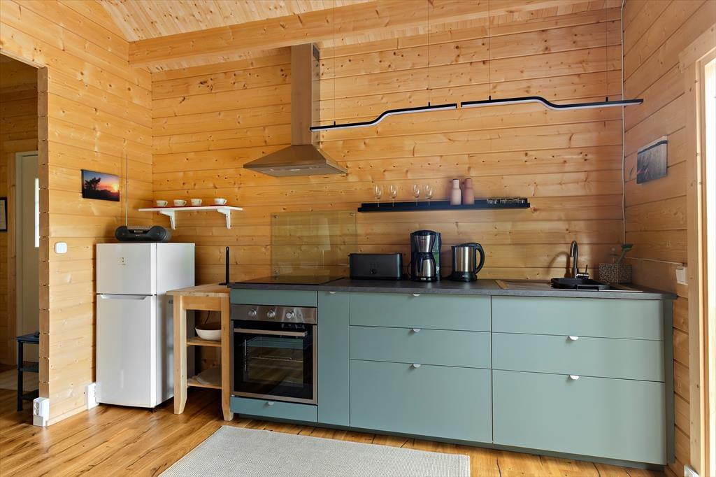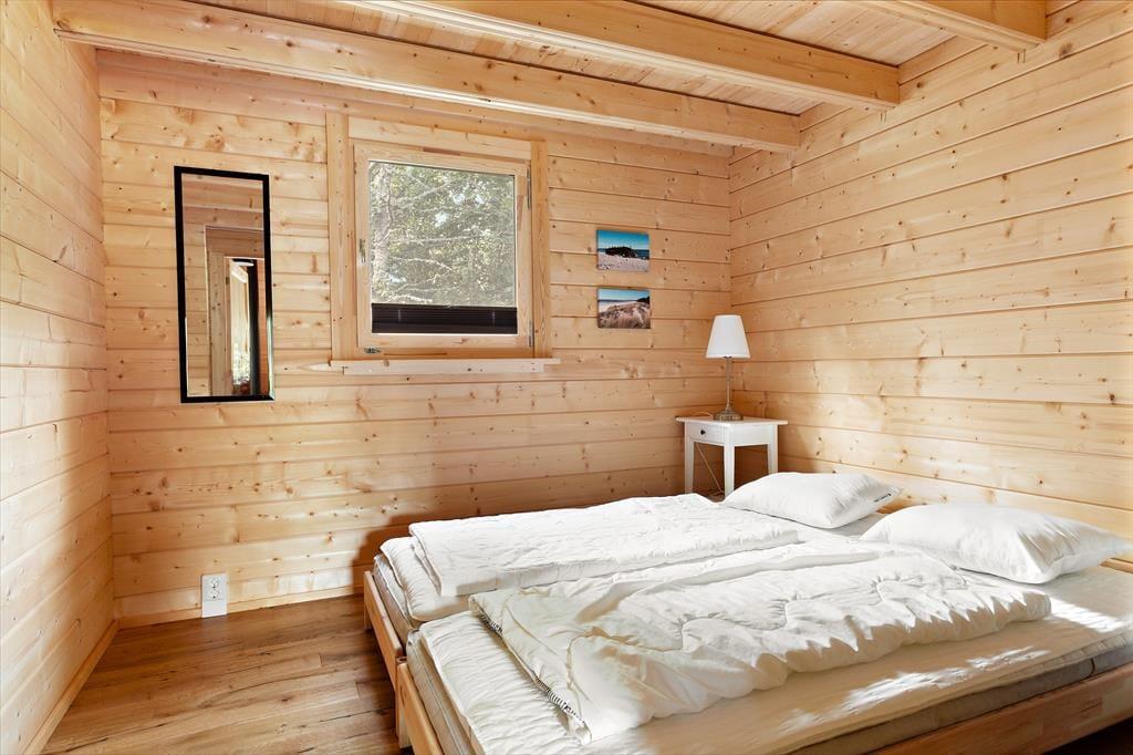 Das erst 2023 auf dem Grundstück der deutschen Vermieter erstellte Gästehaus verfügt über eine Wohnfläche von etwa 63 m² und bietet für bis zu 5 Feriengäste Schlafplätze. Über den Eingangsbereich gelangt man in einen im skandinavischen Stil mit Kiefernholzpaneele vertäfelten offenen „Allrum“ (Familienzimmer) in dem ein gemütlicher Wohn- und Essbereich mit Sofa, Kamin und Flat-TV mit deutschen Programmen sowie ein Esstisch und die Küche untergebracht sind. Die Küche selbst ist mit einem Induktionsherd mit Backofen und Dunstabzugshaube, Kühl- Gefrierkombination, Kaffeemaschine und Wasserkocher ausgestattet. Vom „Allrum“ aus erreicht man auch das geräumige Duschbad mit WC und Handwaschbecken und ein Schlafzimmer mit zwei zu einem Doppelbett zusammengestellten Einzelbett. Drei weitere Betten befinden sich in einem Schlafloft, den man über eine steile Treppe im Eingangsbereich erreicht. Den Gästen stehen weiterhin ein Internetzugang über Glasfaserkabel sowie zwei Fahrräder zur Verfügung.