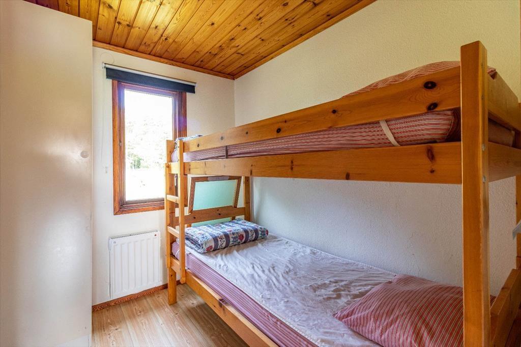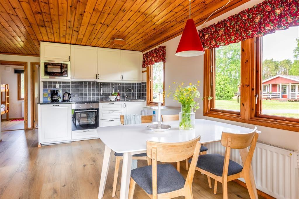 Mit etwa 43 m² Wohnfläche bietet das Ferienhaus Platz für bis zu 4 Personen. Über die kleine, überdachte Terrasse gelangst du in den offenen Wohn-, Ess- und Küchenbereich. Im Wohnbereich laden ein Sofa und ein Sessel zum Entspannen ein, während der TV mit schwedischen Programmen für Unterhaltung sorgt. Der Essbereich bietet einen Tisch für vier Personen. Die Küche ist komplett ausgestattet, unter anderem mit einem 4‑Platten-Induktionskochfeld. Es gibt zwei Schlafzimmer, eines mit zwei Einzelbetten und eines mit einem Etagenbett. Das Badezimmer verfügt über WC und Dusche. Auf der Terrasse kannst du die Gartenmöbel und den Grill nutzen. Zusätzlich stehen Internetzugang, mehrere Waschmaschinen und Trockner im Waschhaus der Anlage, und von Mitte Juni bis Mitte August ein Ruderboot zur Verfügung, sodass es an nichts fehlt.
