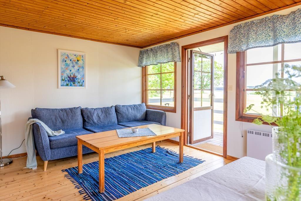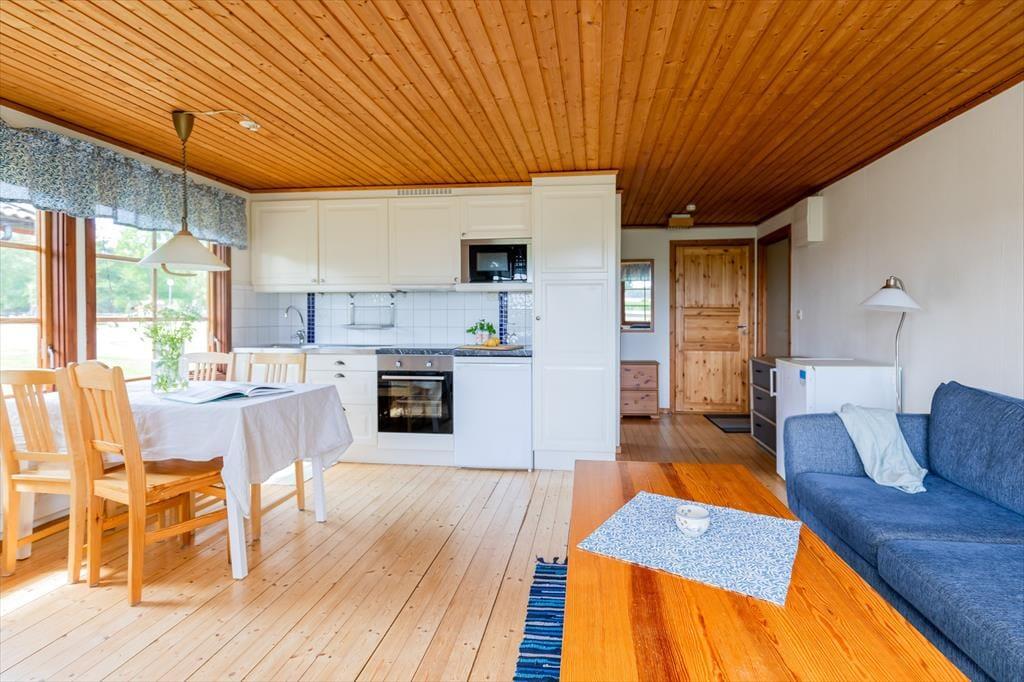 Das Haus misst 43 m² und bietet Platz für maximal 4 Gäste. Über die kleine, überdachte Terrasse gelangst du in den kombinierten Wohn-, Ess- und Küchenbereich. Die Sitzecke ist mit Sofa, Sessel, einem Fernseher mit schwedischen Sendern sowie kostenfreiem Internet ausgestattet. Ein Esstisch für vier Personen verbindet Wohnzimmer und Küche miteinander.