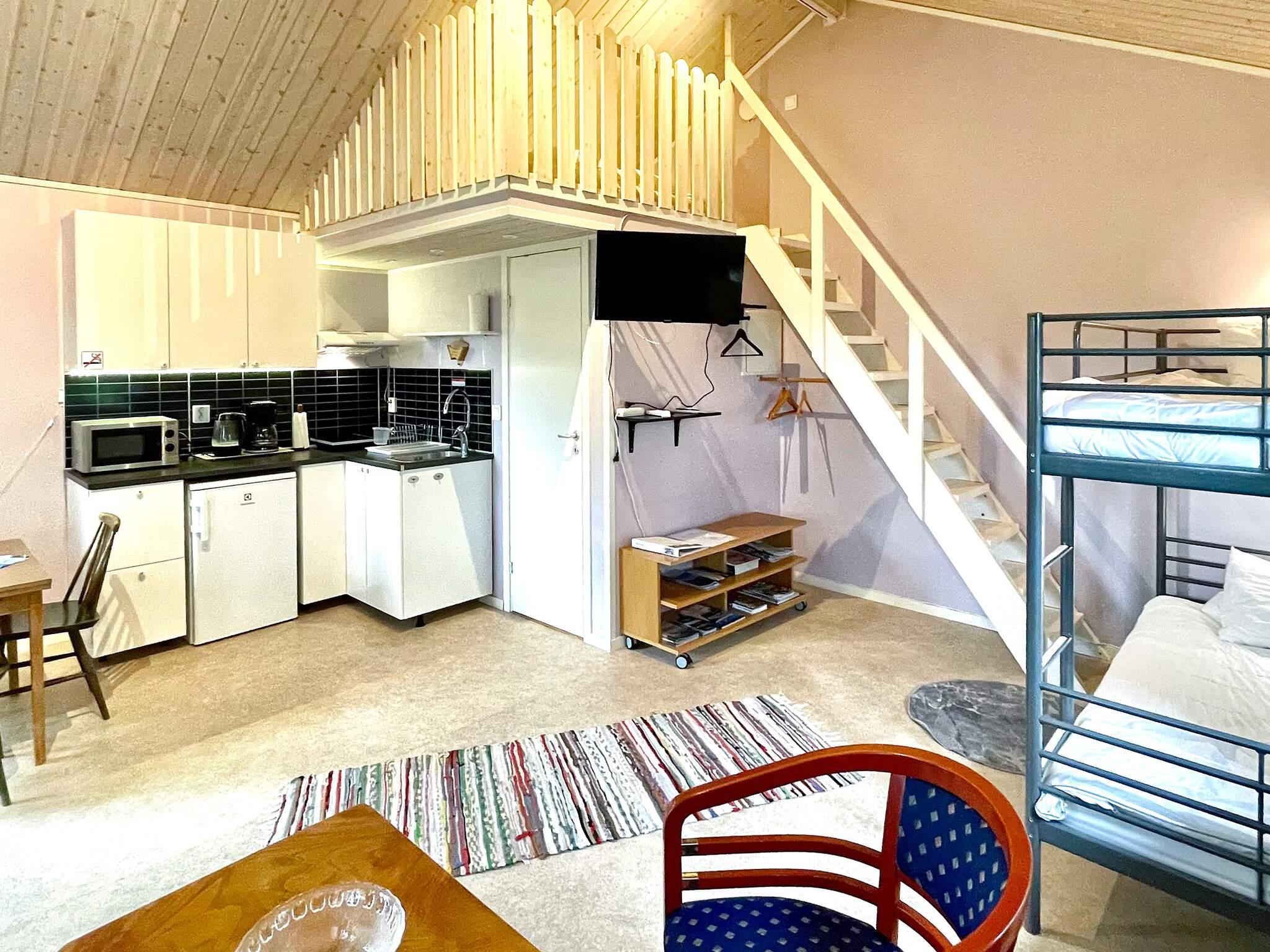 Das Häuschen steht auf einem großen, gemeinschaftlichen Grundstück mit ausreichend Fläche für Spiel und Spaß im Freien. Innen erwartet Sie ein offener, zweckmäßig eingerichteter Küchen-/Wohnbereich mit Zugang zur Terrasse, wo man die Mahlzeiten des Tages einnehmen kann. Im Wohnbereich sind auch eine Essecke, eine Schlafcouch und ein Etagenbett untergebracht. Das Häuschen verfügt über Fußbodenheizung und Wärmepumpe für ein zu jeder Jahreszeit angenehm temperiertes Innenklima. Eine recht steile Treppe führt hinauf auf den offenen Hems mit 2 Schlafplätzen auf einer 140 cm breiten Matratze unter der Dachschräge. Zudem helles Bad mit Dusche/WC und kleiner Waschmaschine im Haus.