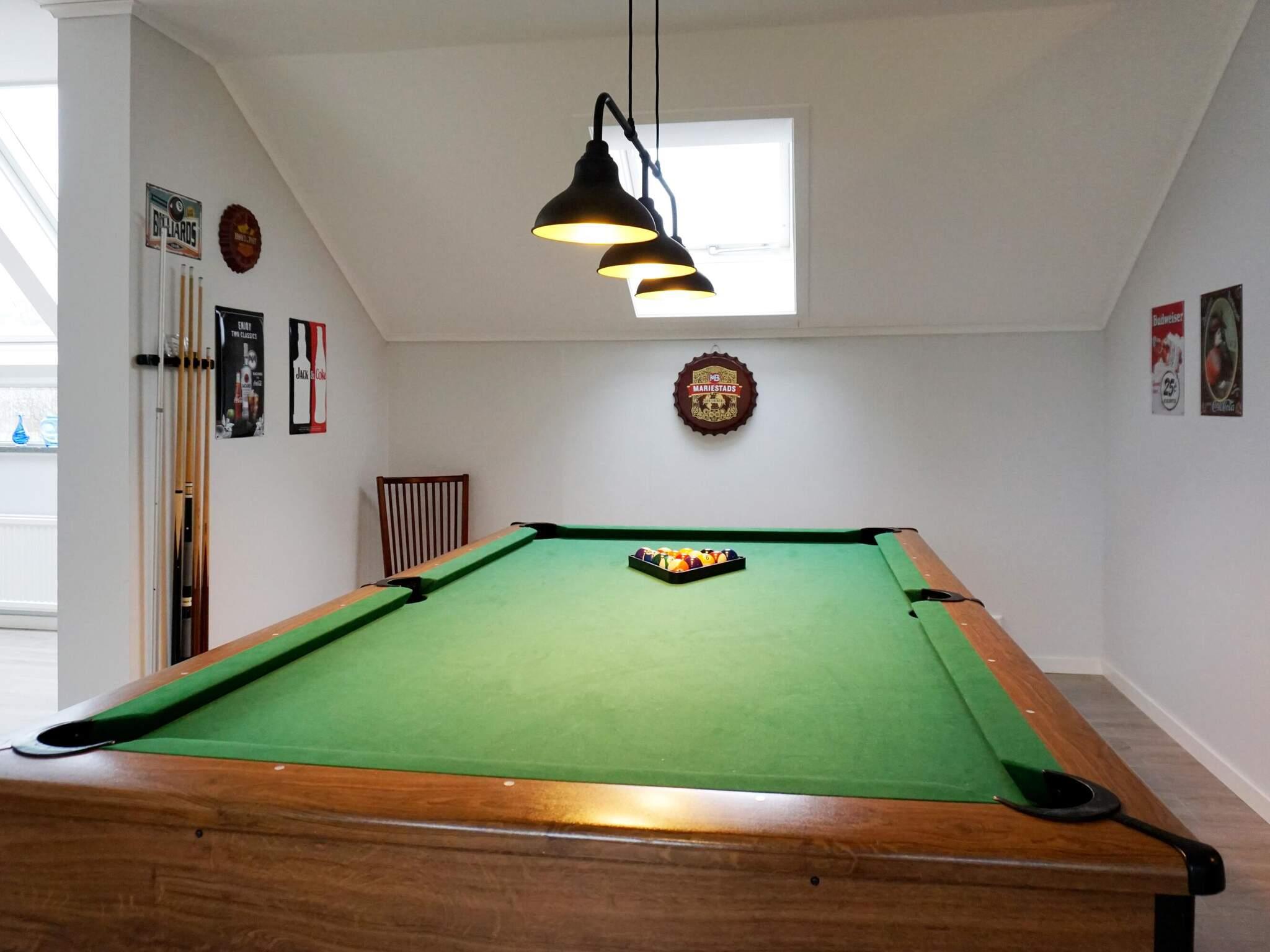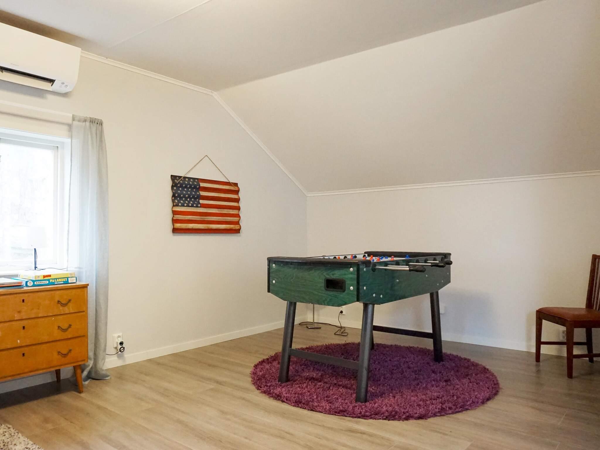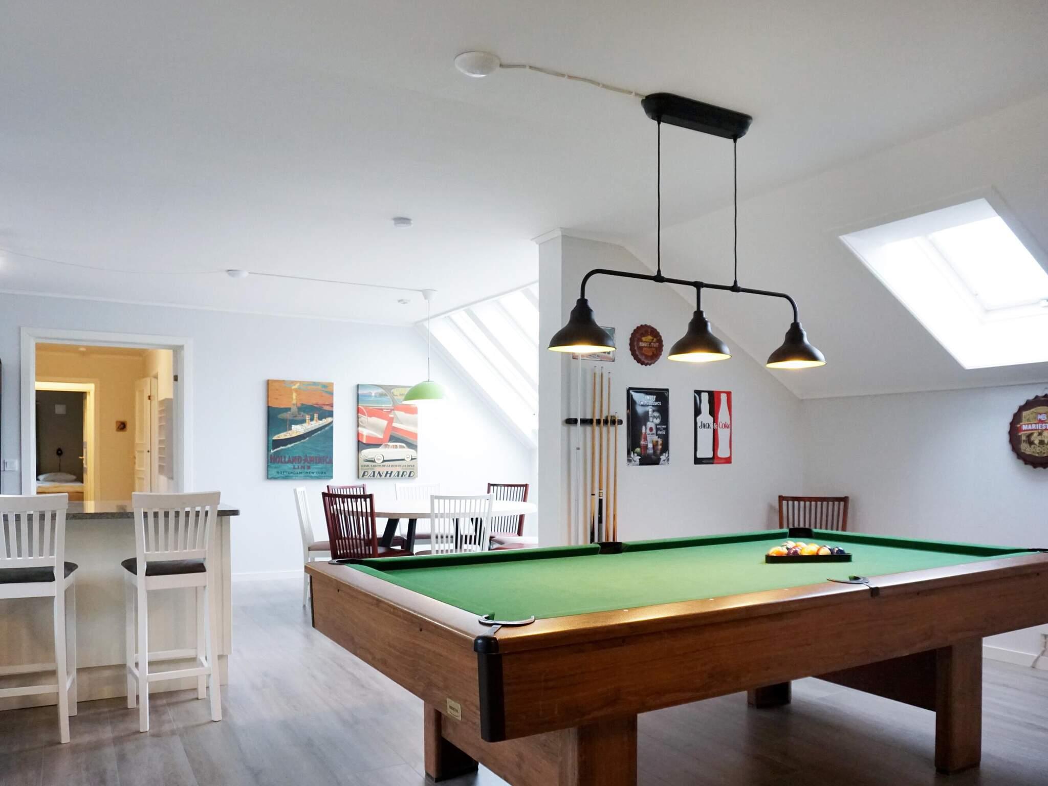 Das Wohnzimmer ist großzügig geschnitten, es gibt eine Fernsehecke mit einem bequemen Sofa, eine Ecke mit einem Tischfußballspiel, zwischen diesen und dem Küchenbereich befindet sich ein Billardtisch, an dem Sie Ihre Fähigkeiten unter Beweis stellen können. Neben dem Billardtisch befindet sich eine Leseecke mit bequemen Sesseln. Von dieser Ecke aus gelangen Sie hinaus auf eine kleine Sitzfläche für eine Tasse Kaffee. Von dort führt auch eine Treppe hinunter zur Terrasse des Ferienhauses mit Sommermöbeln und Grill, ideal für sonnige Tage. Die praktische Wascküche im Erdgeschoss, mit Waschmaschine und Trockner, teilen Sie sich mit einer kleinen Wohnung im Erdgeschoss, die ebenfalls vermietet wird.