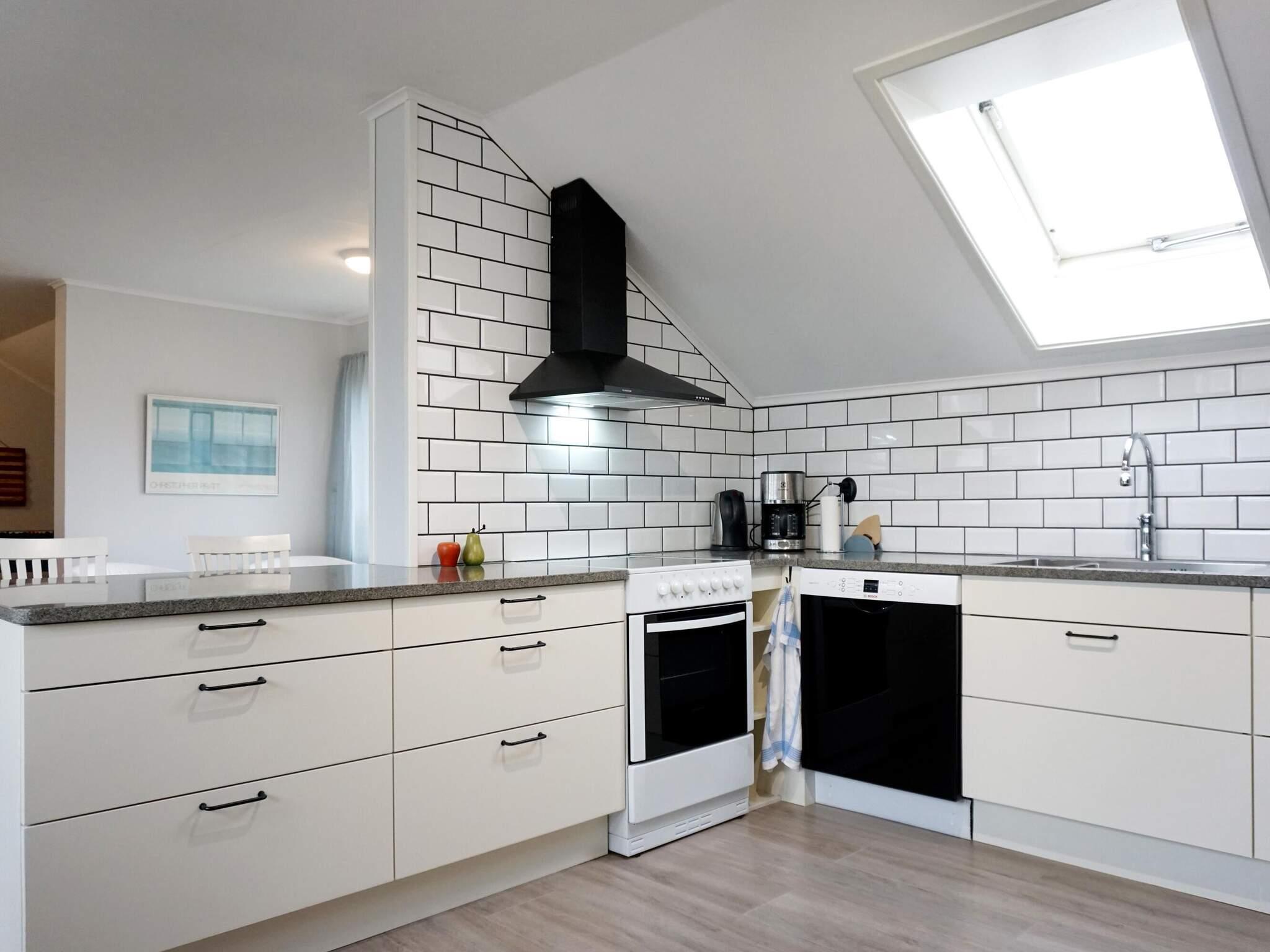 Durch den Eingang des Hauses gelangen Sie in eine einladende Halle mit Treppe in das Obergeschoss. Im Erdgeschoss finden Sie große, offene und helle Räume, bestehend aus einer offenen Küche mit Herd, Mikrowelle, Kühl-/Gefrierschrank, Kaffeemaschine und Geschirrspüler, großem Essbereich mit Küchenmöbeln und Hochstuhl. Es gibt drei Schlafzimmer im Haus; eines mit zwei Einzelbetten, ein zweites mit einem großen bequemen Doppelbett und einem Einzelbett, ein drittes mit einem Etagenbett und einem Doppelbett (2x90cm). Von einem der Schlafzimmer haben Sie direkten Zugang zu einem kleinen Balkon, auf dem Sie die Abendsonne genießen können. Badezimmer mit Fußbodenheizung und Dusche im Erdgeschoss. Oben im 1. Stock befindet sich neben dem Flur das zweite Badezimmer des Ferienhauses mit Dusche.