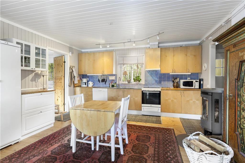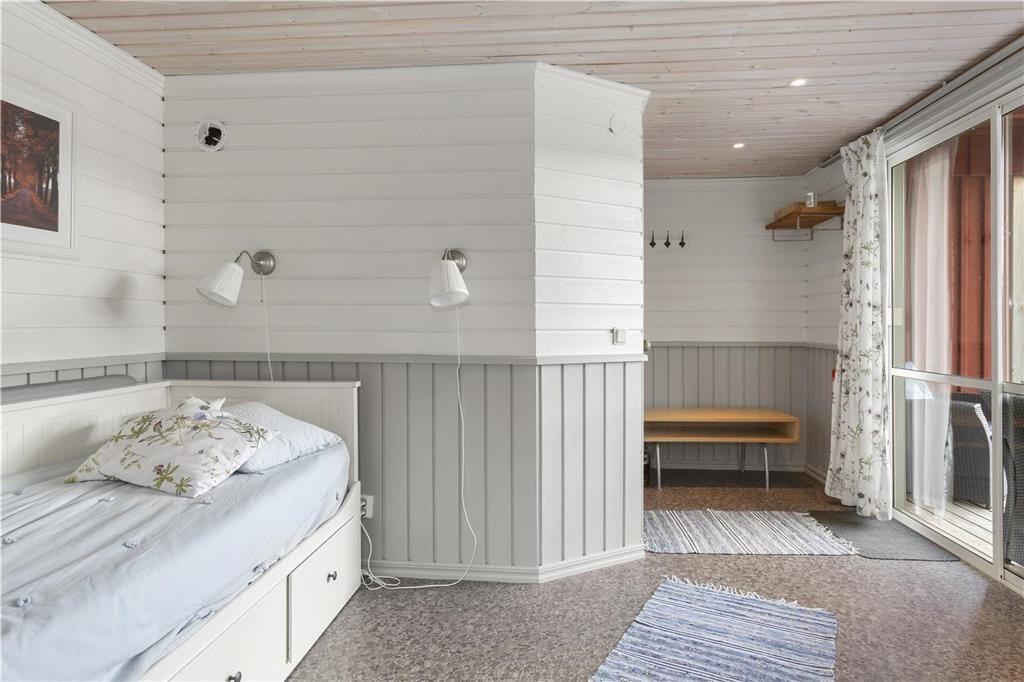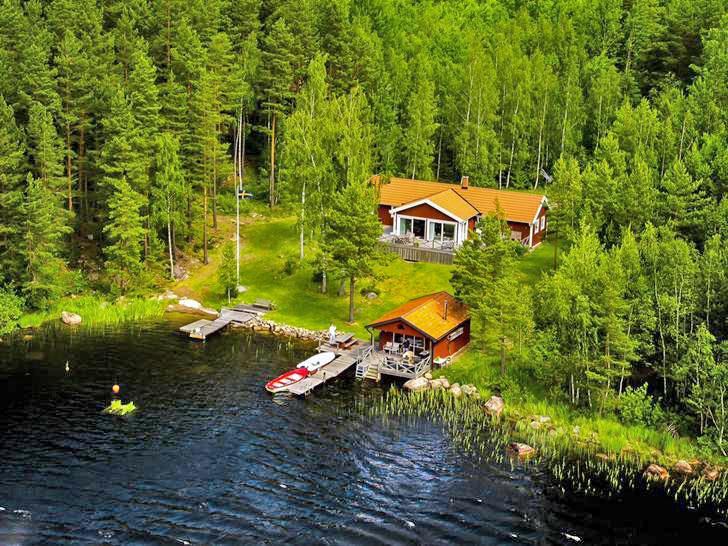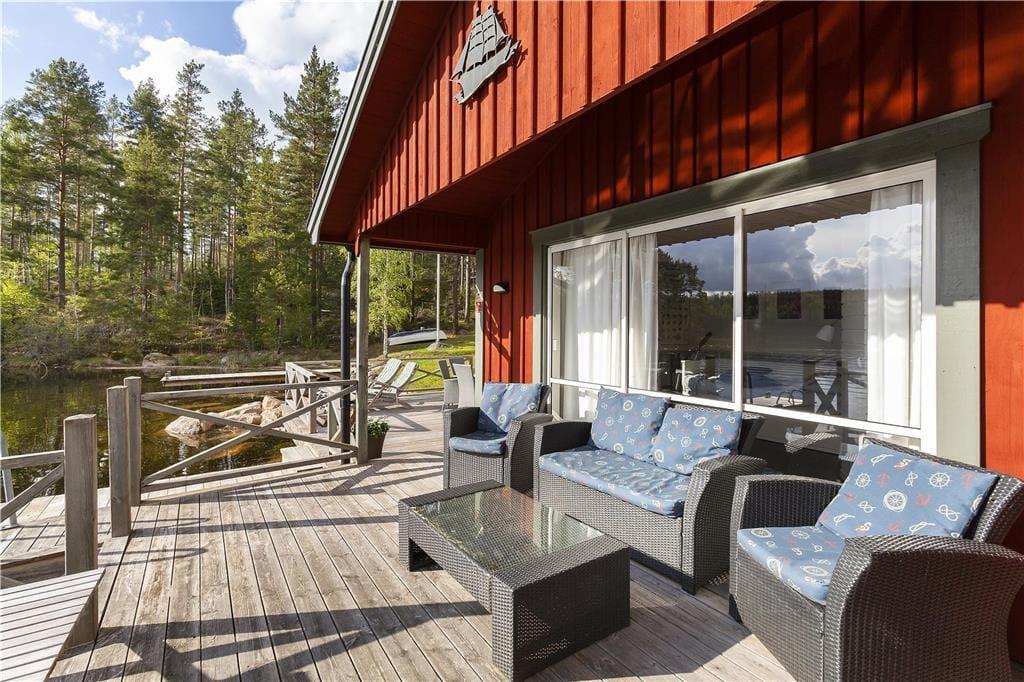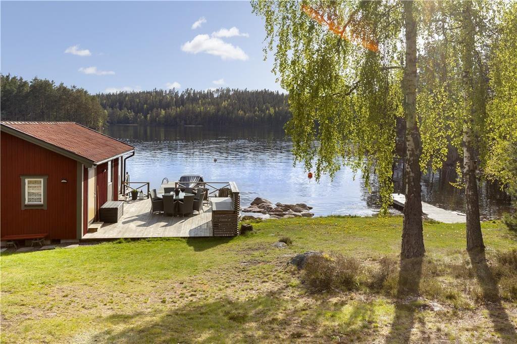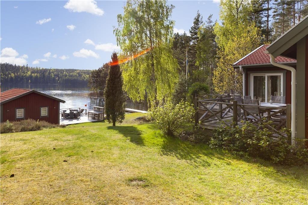 Das allein an einer kleinen Bucht auf einem etwa 2.000 m² großen Seegrundstück liegende, moderne Ferienhaus hat eine Wohnfläche von etwa 115 m². Vom in der Hausmitte liegenden Eingangsbereich gelangt man rechter Hand in einen attraktiven, geräumigen Wohn- und Küchenbereich mit Sitzecke, Kaminofen und großem Esstisch und hat von hier einem herrlichen Blick auf den See. Die Küche selbst ist mit Kühl- und Gefrierschrank, Elektroherd mit Backofen, Dunstabzug, Mikrowelle, Kaffeemaschine, Wasserkocher und Geschirrspüler ausgestattet. An diesen "Mittelpunkt" des Hauses schließt sich ein mit einem Doppelbett möbliertes Schlafzimmer an sowie ein Badezimmer mit Duschbad, WC und Fußbodenheizung. Darüber hinaus gibt es hier noch einen Hauswirtschaftsraum mit Waschmaschine. In der anderen Haushälfte befinden sich ein gemütliches Fernsehzimmer (mit Satellitenfernsehen mit deutschen Programmen) sowie zwei von diesem abzweigende Schlafzimmer, eines davon mit zwei Betten, das andere mit einem Bett möbliert. Ein zweites Badezimmer mit WC und Dusche ist vom Eingangsflur aus zugänglich. In dem kleinen Gästehaus am See ist ein mit einem Doppelbettsofa möbliertes Gästezimmer (ohne Heizung) untergebracht sowie eine mit Holz zu beheizende Sauna. Den Gästen stehen weiterhin Sommermöbel und Grill sowie ein Ruderboot mit Elektromotor zur Verfügung. Auf Wunsch können ein Kinderbett und ein Hochstuhl gestellt werden.