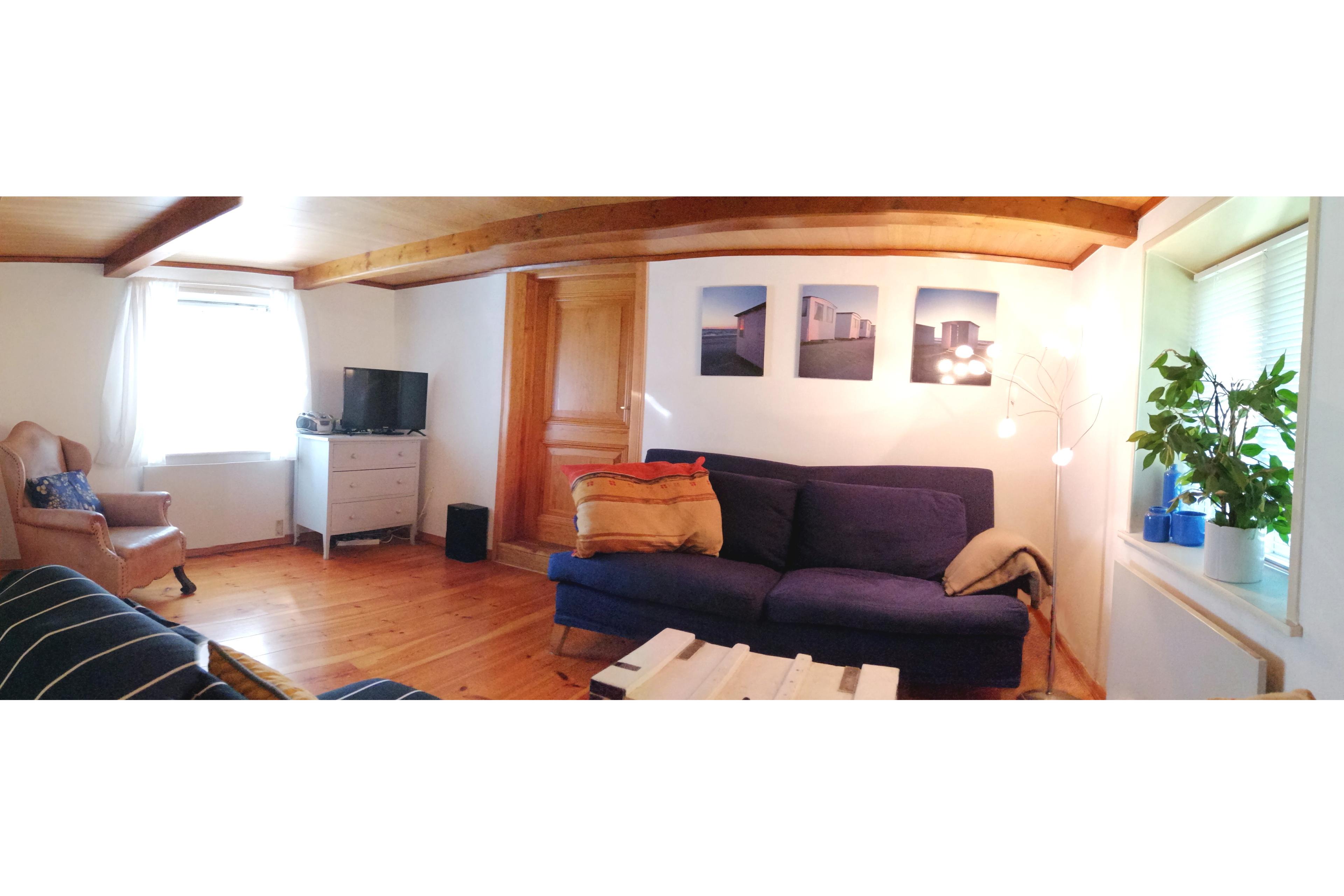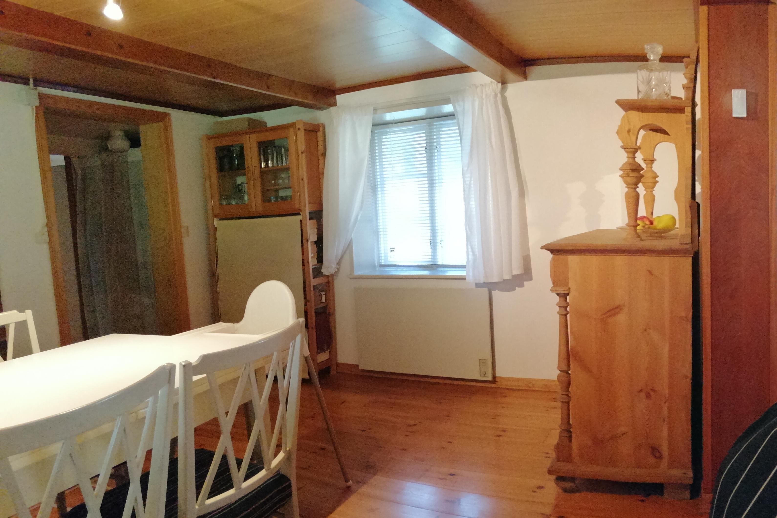 Im Wohn- und Esszimmer befindet sich ein geräumiger, ausziehbarer Esstisch (auch als Arbeitsplatz nutzbar) mit 6 Stühlen und ein Kinder-/Babyhochstuhl, sowie 2 Sofas für bis zu 6 Personen und ein Sessel und 1 Couchtisch. 1 Eckschrank mit Gläsern, 1 Wandschrank mit Büchern, die gerne während des Aufenthalts gelesen werden können. Außerdem ein Schrank mit Spiegel, in dem sich Geschirr befindet. Wand- und Deckenleuchte und Stehlampe. Elektrische Heizung. Kaminofen. Holz-Boden. 4 Fenster mit Jalousien und 1 Fliegengitter. Deutsche Fernseh- und Radiokanäle werden per Satellit empfangen (Astra 19,2 Grad Ost, mit vielen weiteren Kanälen, auch anderer Länder; kein Pay-TV / kein HD+, die vollständige Senderliste bietet die Astra-Internetseite). Es ist ein 32-Zoll-Flachbild-TV, ein CD-MP3-Player, sowie ein DVD-Player und Lautsprecher vorhanden.