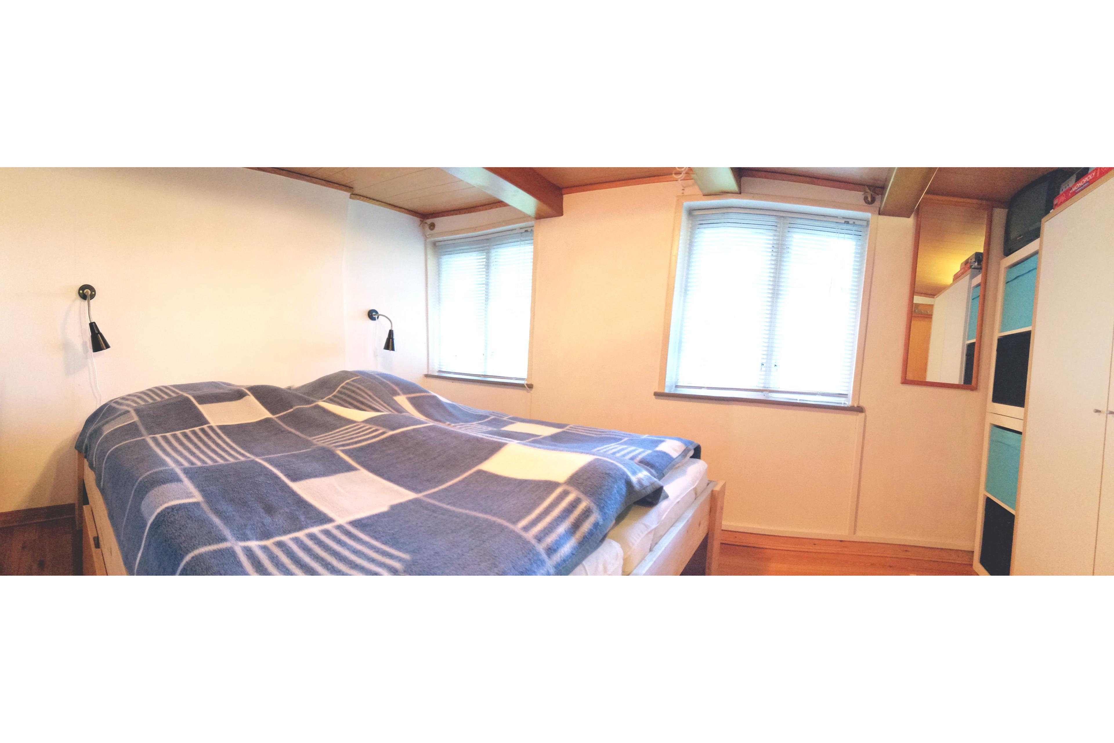 Das Schlafzimmer Nr. 1 enthält 1 Doppelbett (180 x 200 cm) mit 2 Matratzen à 90 x 200 cm, 2 Matratzenschoner, 2 Bettdecken (135 x 200 cm) und 2 Kissen (80 x 80 cm). Außerdem ist ein Kleiderschrank vorhanden. Holz-Boden. Decken- und Wandleuchte und 2 Wand-Lese-Lampen. 2 Fenster mit Jalousien und Verdunkelungsstoff und 1 Fliegengitter. Elektrische Heizung. 1 Wandspiegel. 1 Föhn.
