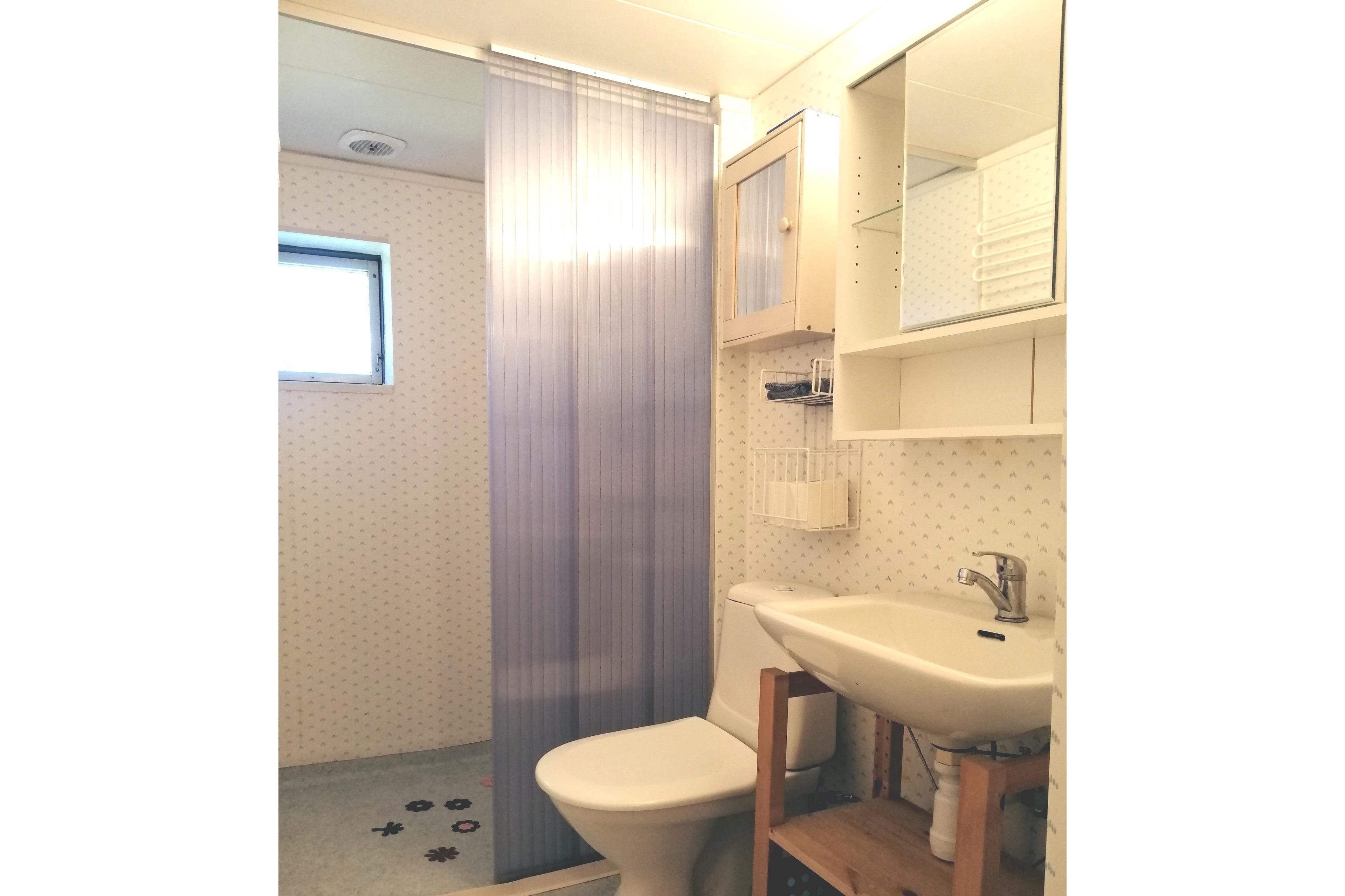 Das Bad bietet 1 Handwaschbecken und 1 Dusche (jeweils heißes und kaltes Wasser). 1 Toilette. 1 Wandspiegelschrank. Flüssig-Seife im Spender. Mehrere Wand-/Türhaken für Handtücher bzw. Klamotten. Mülleimer, WC-Bürste. 2 Tritthocker in verschiedenen Höhen für Kinder (z.B. vor dem Waschbecken). 1 kleines Fenster (in Deckennähe). 1 Wandleuchte. Elektrische Heizung. Im Badezimmer gibt es keine 230 Volt-Steckdose (wie in Schweden üblich). PVC-Boden ("Plastmatta").