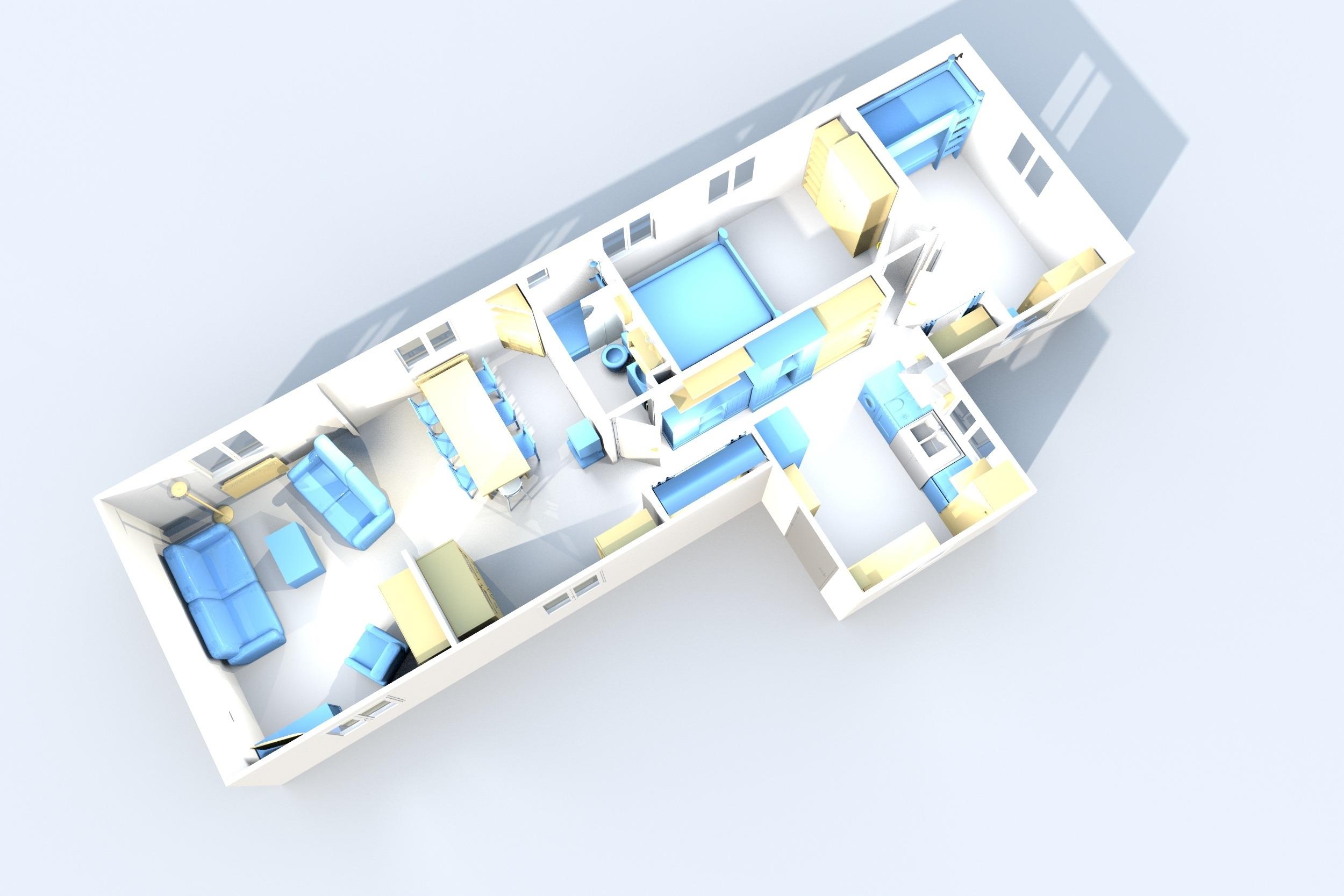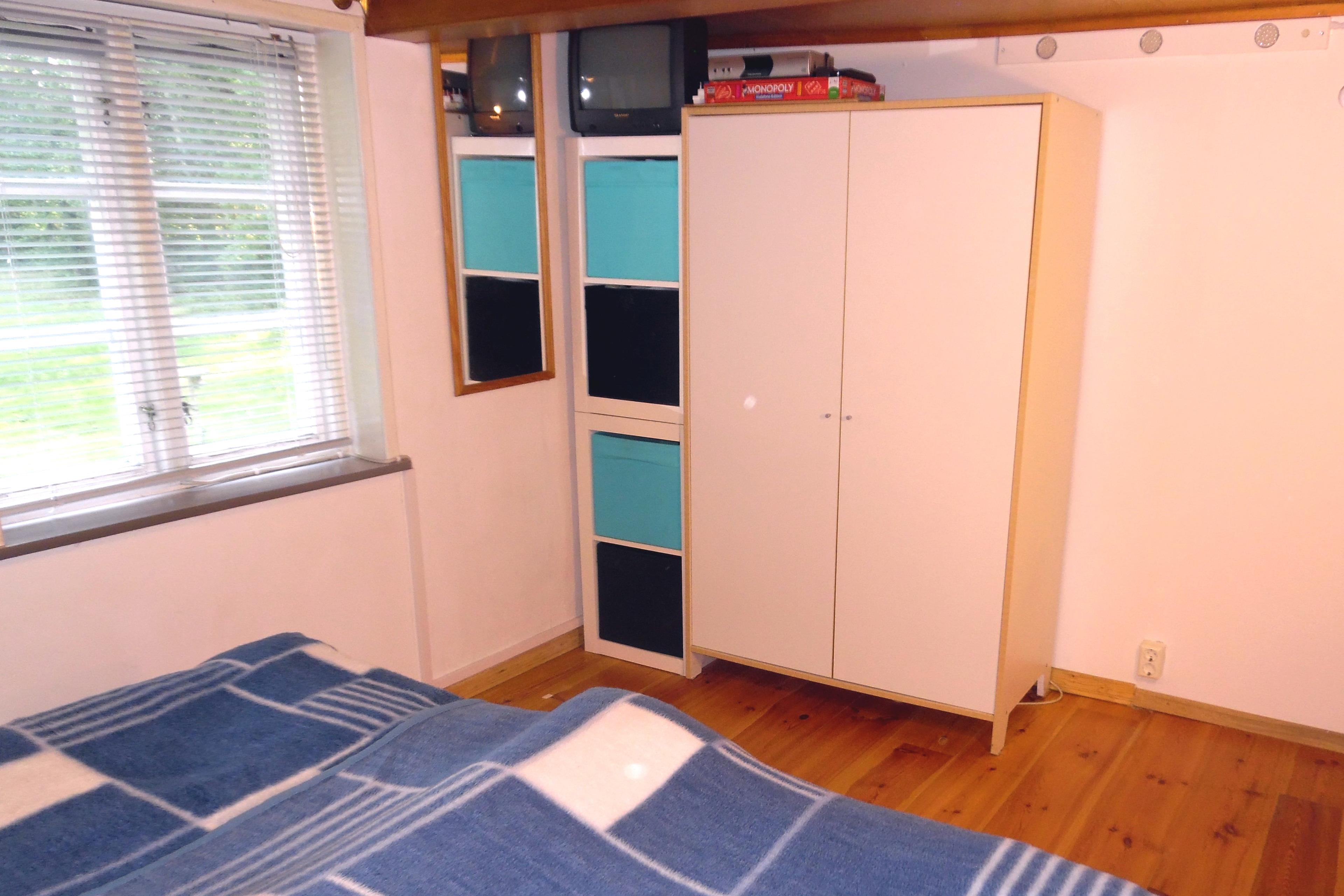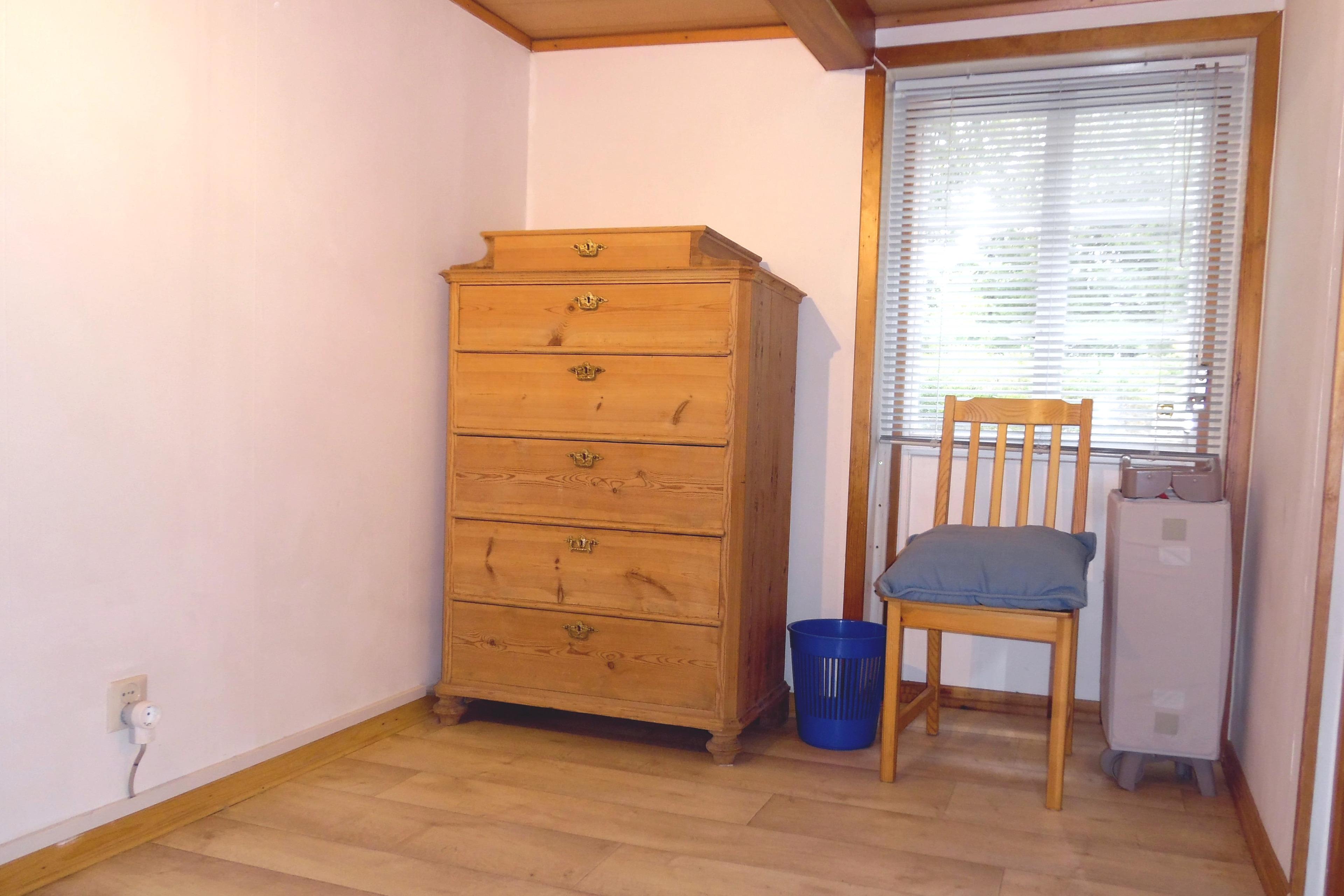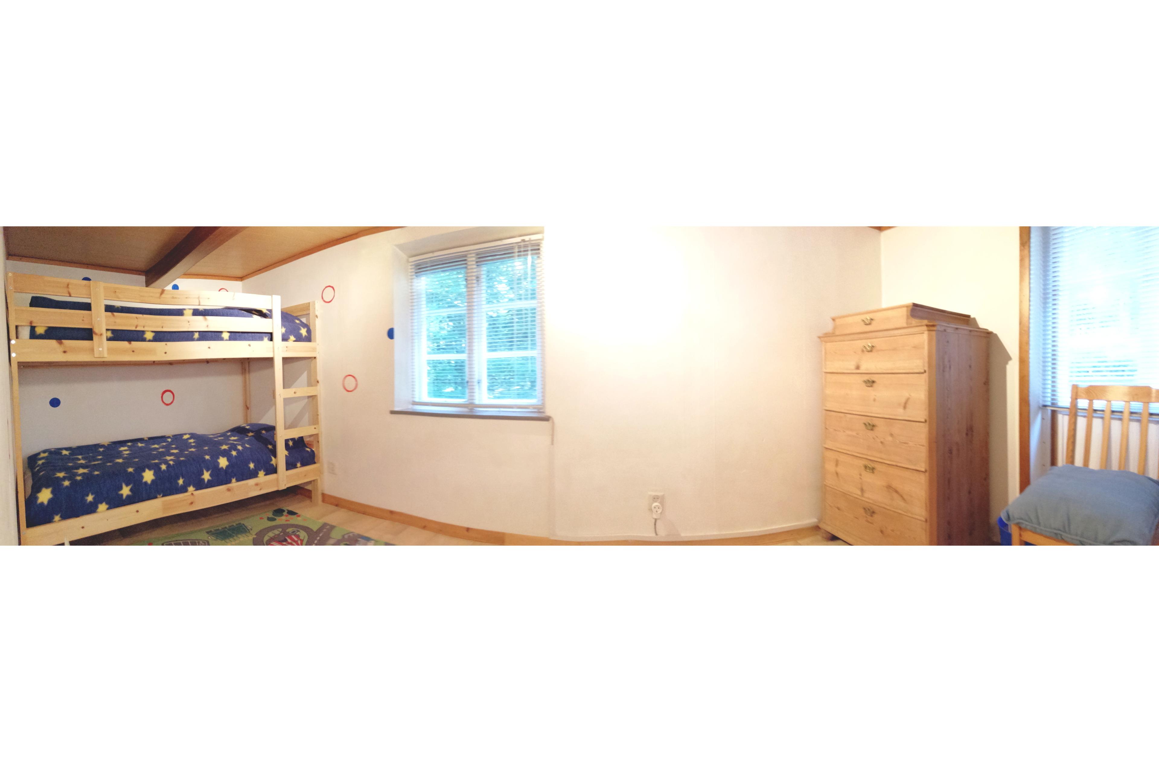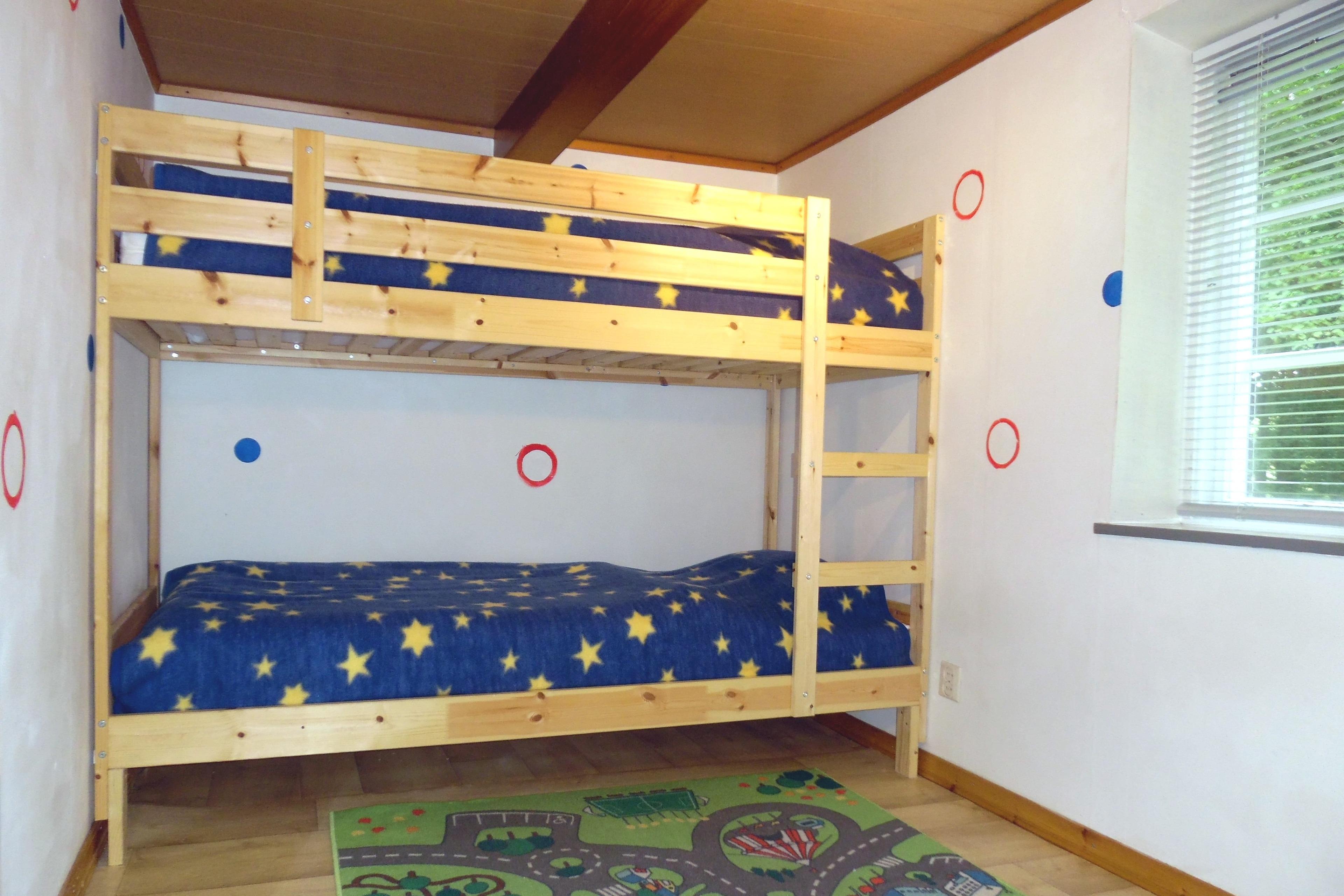 Das Schlafzimmer Nr. 2 enthält 1 Stock-/Etagenbett mit 2 übereinander liegenden Betten (90 x 200 cm) mit jeweils 1 Matratze, 1 Matratzenschoner, 1 Bettdecke (135 x 200 cm) und 1 Kissen (80 x 80 cm). Außerdem steht ein Kinder-/Babybett mit Schaumstoffmatratze (ca. 120 x 60 cm) zur Verfügung. Das Babybett kann in jedem Raum platziert werden und gerne kann eine eigene Matratze genutzt werden. Außerdem ist ein Schubladenschrank vorhanden. PVC-Boden und 1 Spielteppich und 1 Windeleimer. 1 Deckenleuchte und 2 Wand-Lese-Lampen. 2 Fenster mit Jalousien und Verdunkelungsstoff und 1 Fliegengitter. Elektrische Heizung. 1 Wandspiegel.