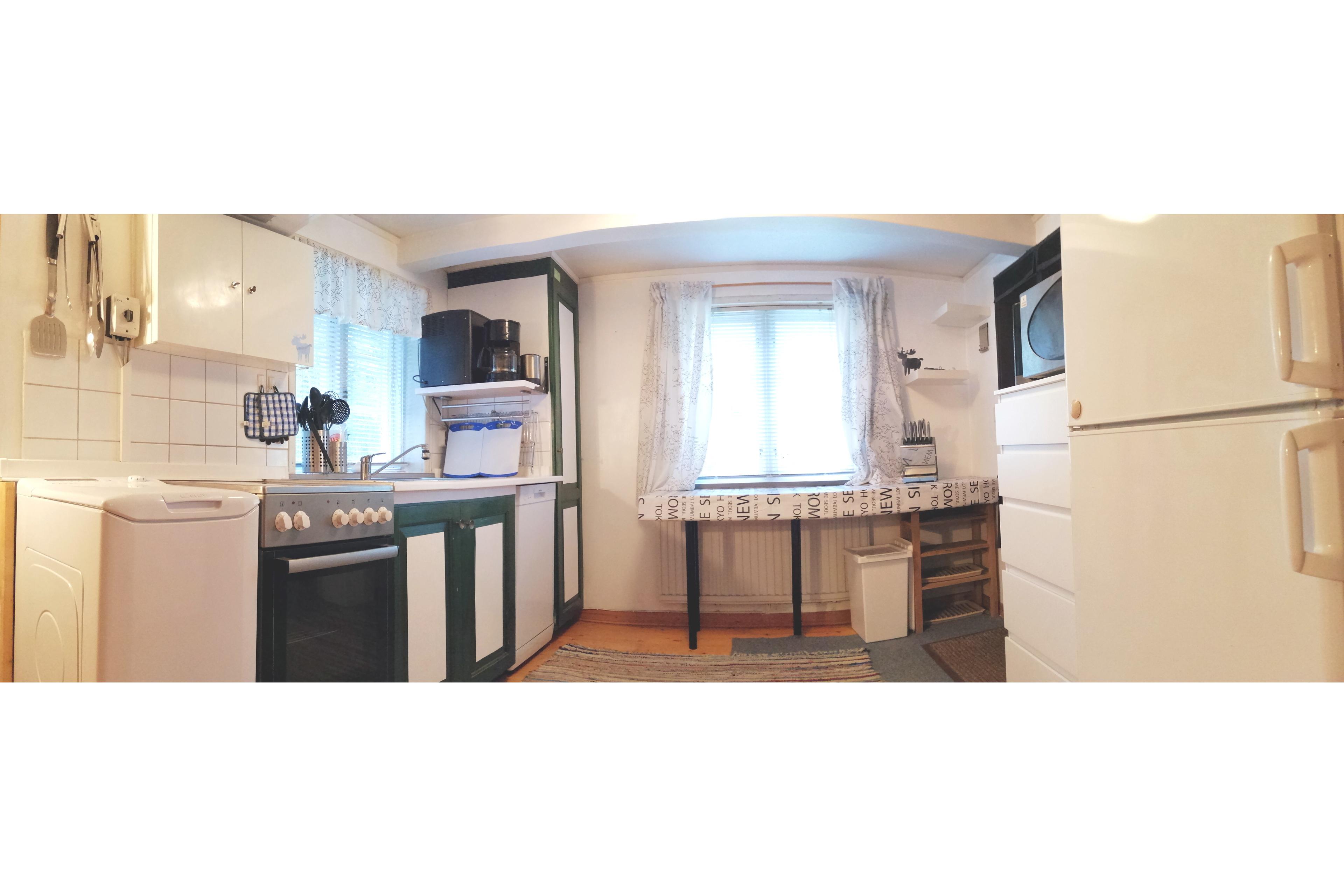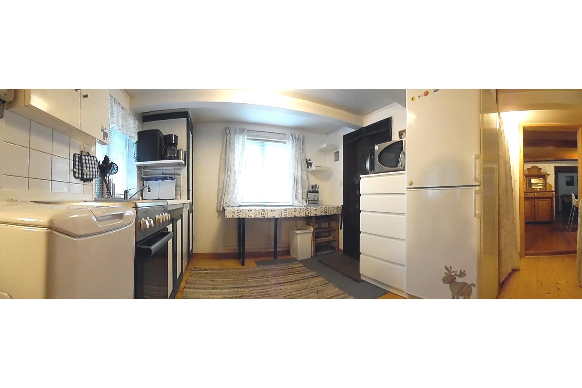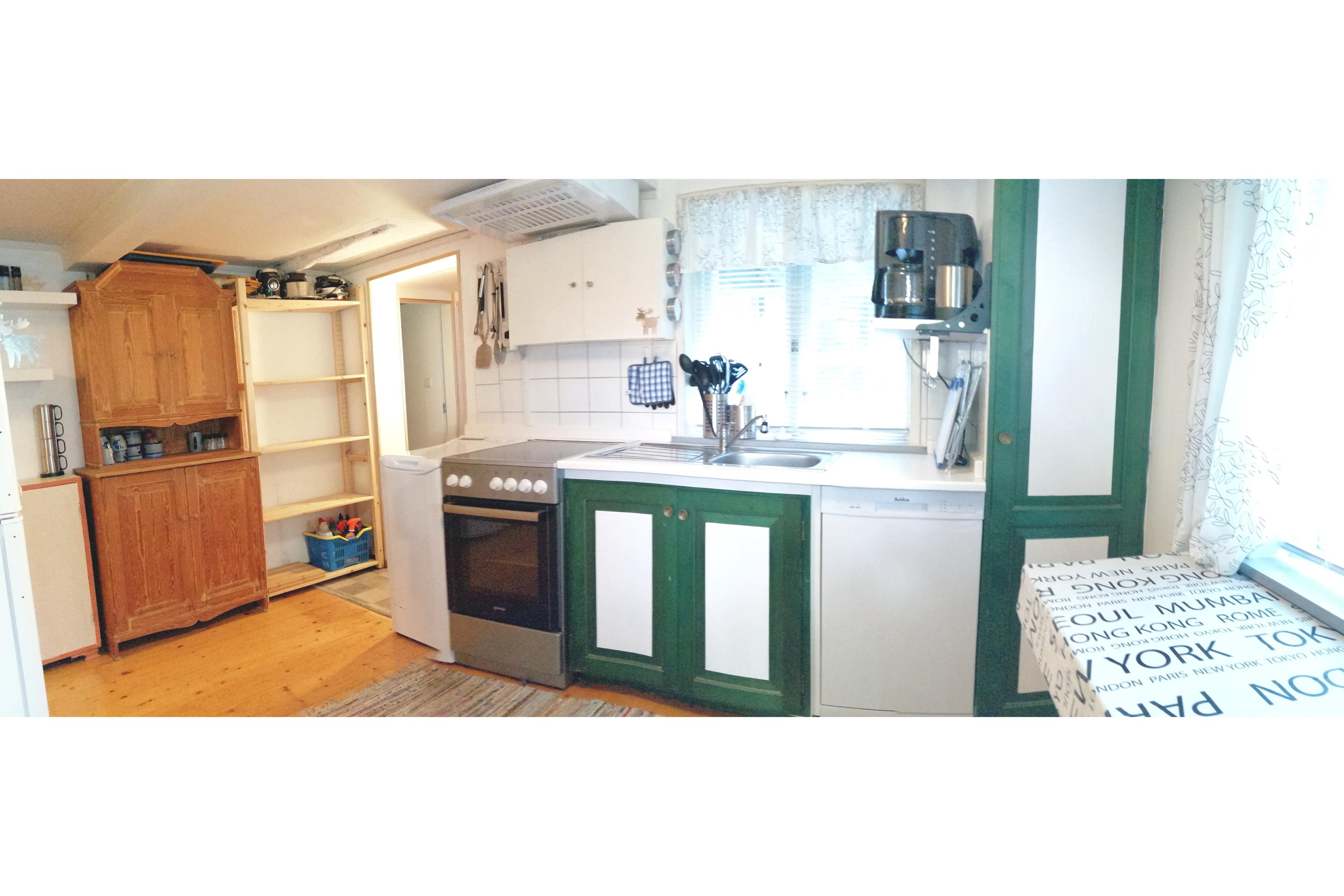 Die Küche bietet 1 Herd mit 4 Kochfeldern und 1 Backofen (beide elektrisch). 1 Dunstabzugshaube über dem Herd. 1 Kombinationsgerät mit Kühlschrank und Gefrierschrank. Mikrowelle. Waschmaschine. Spülmaschine. Zur Info: Waschmaschine und Spülmaschine können nicht gleichzeitig, sondern nur separat, betrieben werden. Pulver-Kaffeemaschine (Filter Gr. 4). Dolce-Gusto-Kapsel-Kaffeemaschine. Wasserkocher. Handmixer. Toaster. Töpfe, Pfannen, Besteck, Geschirr (Teller etc.), Gläser, Schüsseln, usw., sind vorhanden. 2 Arbeitsplatten. 1 Spülbecken mit 1 schwenkbaren Wasserhahn (heißes und kaltes Wasser) mit Tropffläche und 1 Geschirr-/Abtropfkorb. 1 Deckenleuchte, 1 Arbeitsplattenleuchte. Elektrische Heizung. 2 Fenster mit Jalousien und 1 Fliegengitter. PVC- und Holz-Boden (der bunte Teppichläufer ist bereits entfernt). Hauszugang. Mülleimer. Staubsauger. Besen. Schuhablage. Wäscheständer (dieser kann auch gerne auf der Terrasse verwendet werden). Schaufel und Kehrbesen. Bodenwischer und Eimer. Reinigungsmittel. Spülschwamm/-tuch. Spülmittel. Waschmittel (meist Pulver), Spülmaschinen-Tabs. Im Gang zwischen Küche und Wohn- und Essbereich befindet sich eine Garderobe (inkl. Kleiderbügel) und eine Schuhablage.