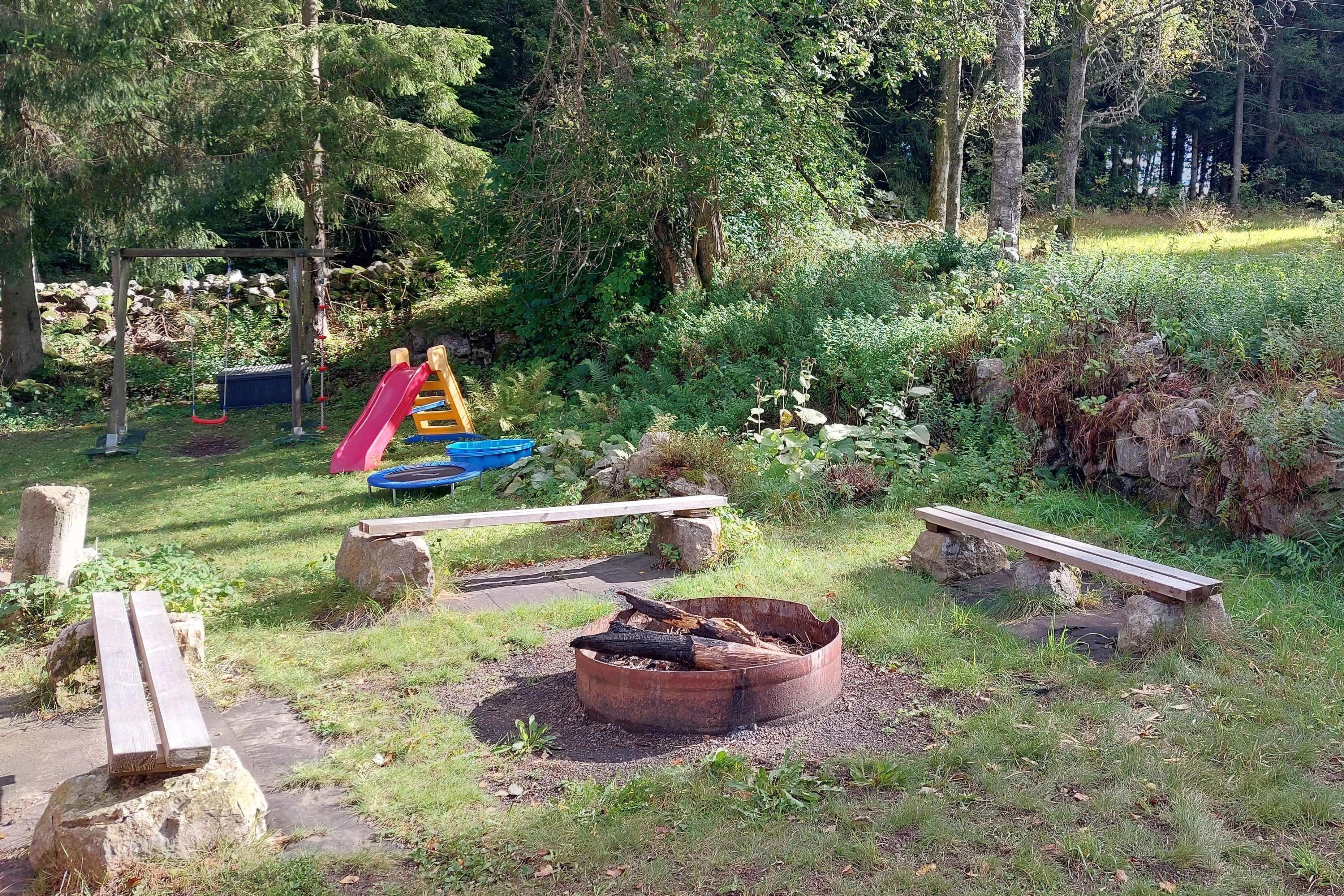 Neben dem Haus gibt es einen Spielbereich und vor dem Haus befindet sich eine Feuerstelle mit 3 Sitzbänken und daneben eine regengeschützte, beleuchtete Terrasse mit zwei Tischen und bis zu 10 Sitzplätzen (2 Bänke für je bis zu 3 Personen und 4 Stühle), sowie ein Holzkohle-Grill.