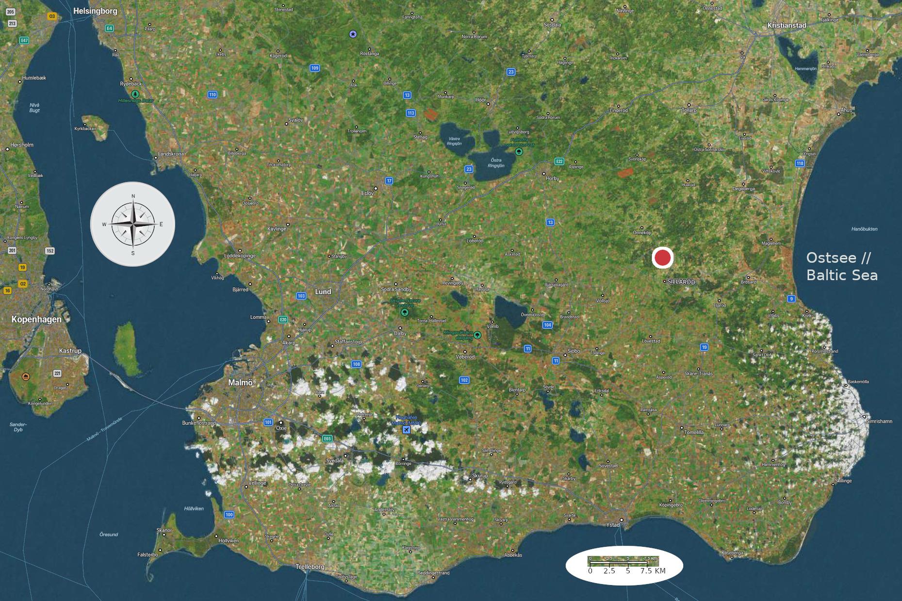 Das Ferienhaus liegt in der südlichsten schwedischen Provinz 'Skåne', direkt am Waldrand am Ende einer kleinen Siedlung, östlich von Malmö, etwa 17 KM westlich vom Meer (Luftlinie), zwischen Ystad im Süden & Kristianstad im Norden, in der Region Österlen - liebevoll "die Toskana Schwedens" genannt.