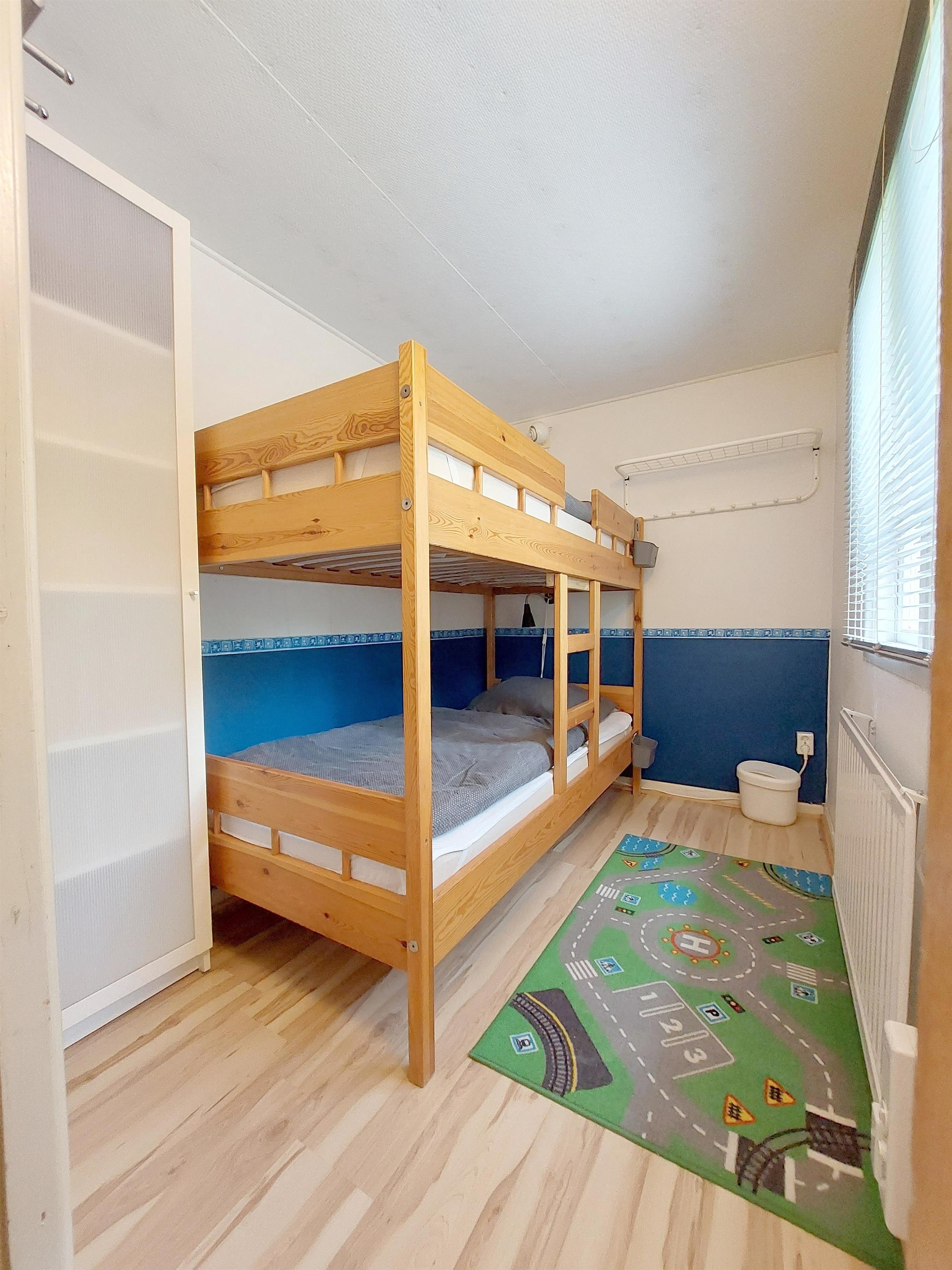 Das Schlafzimmer Nr. 2 enthält 1 Stock-/Etagenbett mit 2 übereinander liegenden Betten (90 x 200 cm) mit jeweils 1 Matratze, 1 Matratzenschoner, 1 Bettdecke (135 x 200 cm) und 1 Kissen (80 x 80 cm). Außerdem steht ein Babybett mit Schaumstoffmatratze (ca. 120 x 60 cm) zur Verfügung. Das Babybett kann in jedem Raum platziert werden und gerne kann eine eigene Matratze genutzt werden. Außerdem ist ein Schrank vorhanden. Laminat-Boden und 1 Spielteppich und 1 Windeleimer. 1 Wandleuchte und 2 Wand-Lese-Lampen. 1 Fenster mit Jalousie und Verdunkelungsstoff und 1 Fliegengitter. Elektrische Heizung.