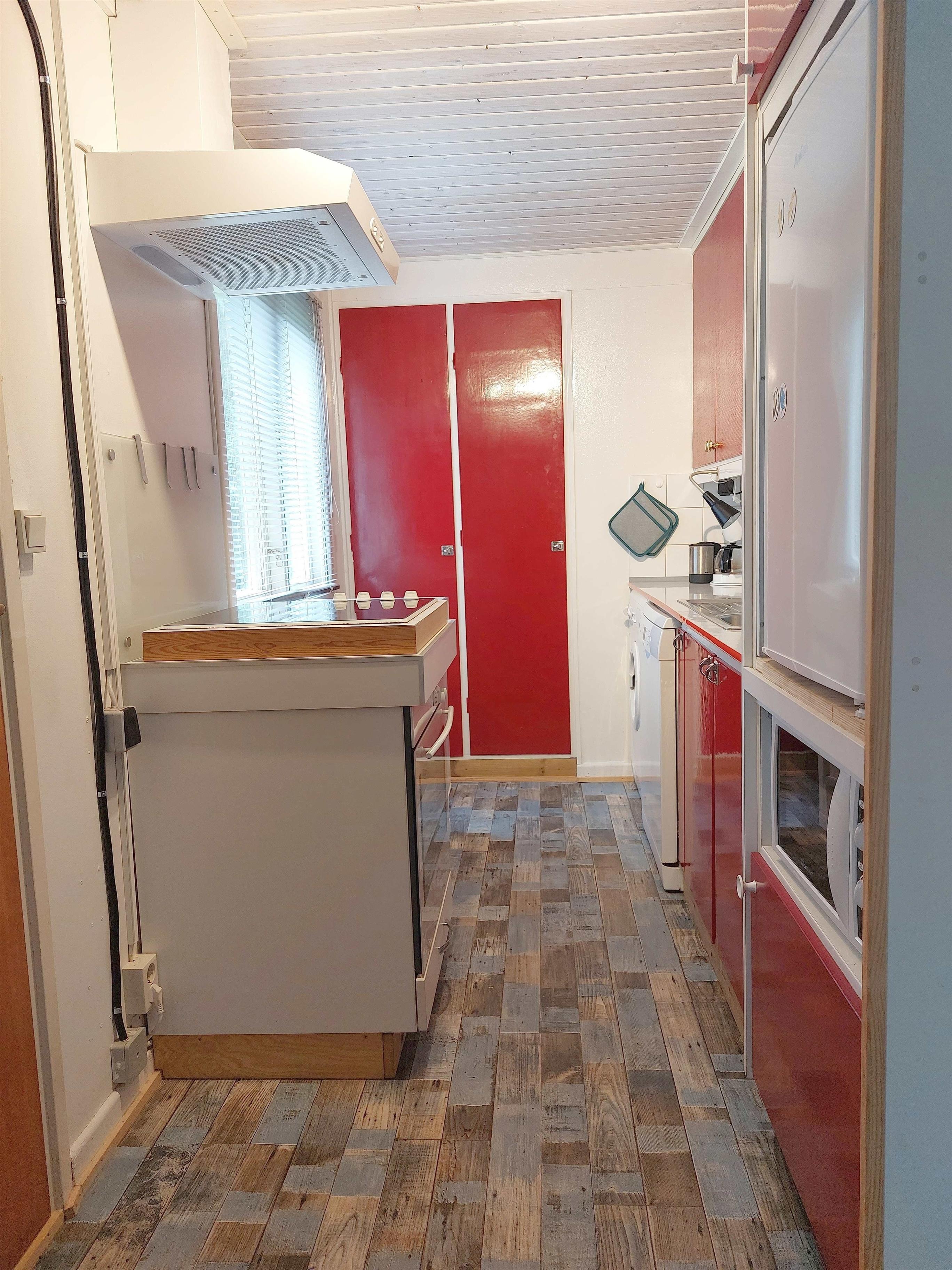 Die Küche bietet 1 Herd mit 4 Kochfeldern und 1 Backofen (beide elektrisch). 1 Dunstabzugshaube über dem Herd. 1 Kühlschrank und 1 kleinen Gefrierschrank. Mikrowelle. Waschmaschine. Spülmaschine. Zur Info: Waschmaschine, Spülmaschine und Mikrowelle können nicht gleichzeitig, sondern nur separat, betrieben werden. Pulver-Kaffeemaschine (Filter Gr. 4). Dolce-Gusto-Kapsel-Kaffeemaschine. Wasserkocher. Handmixer. Toaster. Töpfe, Pfannen, Besteck, Geschirr (Teller etc.), Gläser, Schüsseln, usw., sind vorhanden. 2 Arbeitsplatten. 1 Spülbecken mit 1 schwenkbaren Wasserhahn (heißes und kaltes Wasser) mit Tropffläche und 1 Geschirr-/Abtropfkorb. 1 Deckenleuchte, 1 Arbeitsplattenleuchte. Elektrische Heizung. 1 Fenster mit Jalousie und 1 Fliegengitter. PVC-Boden. Mülleimer. Staubsauger. Besen. Schaufel und Kehrbesen. Bodenwischer und Eimer. Reinigungsmittel. Spülschwamm/-tuch. Spülmittel. Waschmittel (meist Pulver), Spülmaschinen-Tabs.