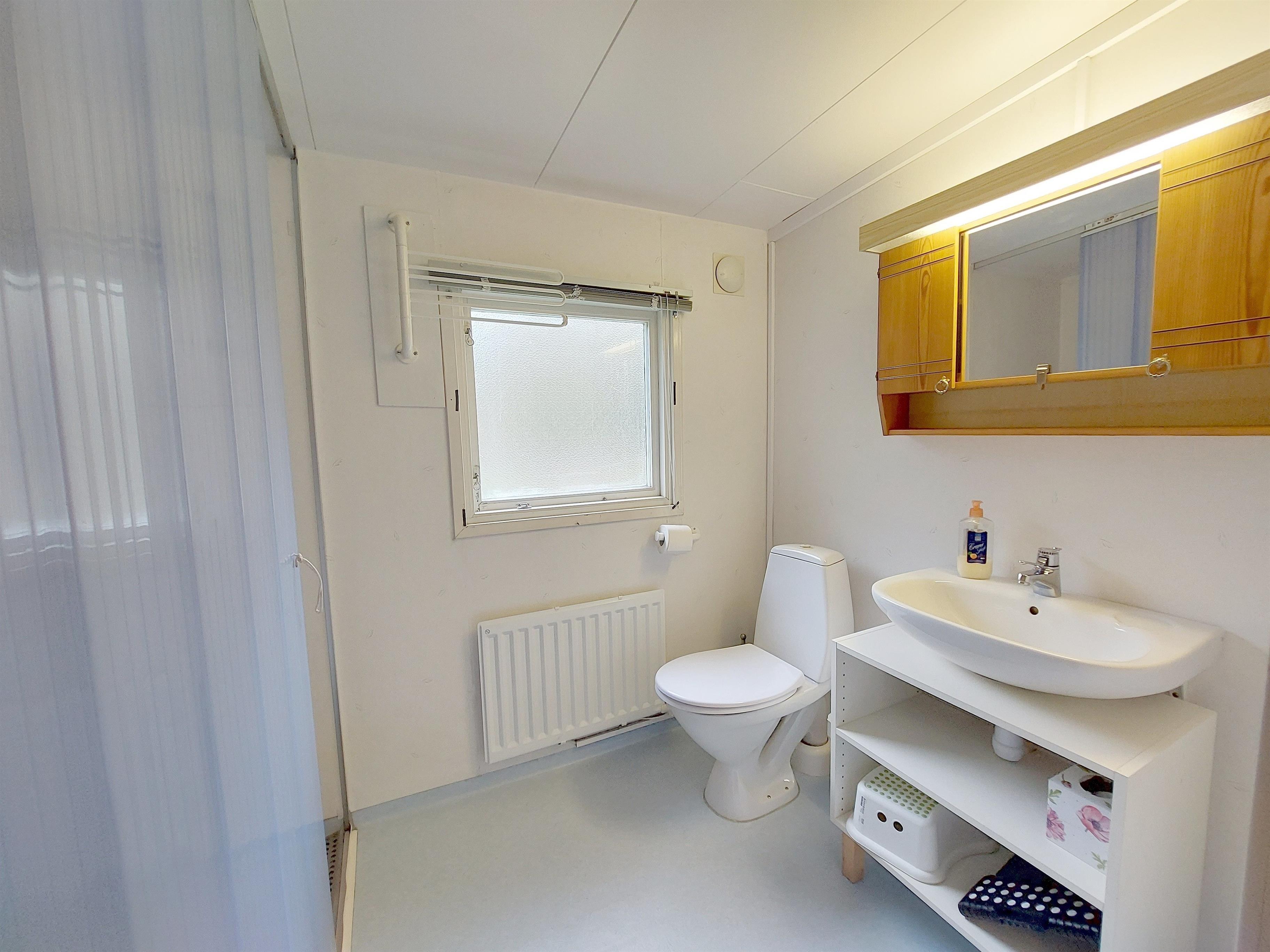 Das Bad bietet 1 Handwaschbecken und 1 Dusche (jeweils heißes und kaltes Wasser). 1 Toilette. 1 Wandspiegelschrank. Flüssig-Seife im Spender. Mehrere Wand-/Türhaken für Handtücher bzw. Klamotten. Mülleimer, WC-Bürste. 2 Tritthocker in verschiedenen Höhen für Kinder (z.B. vor dem Waschbecken). 1 Fenster mit Milchglas und Jalousie und 1 Fliegengitter. 1 Leuchte im Wandspiegelschrank. Wäscheständer (dieser kann auch gerne auf der Terrasse verwendet werden). Elektrische Heizung. Im Badezimmer gibt es keine 230 Volt-Steckdose (wie in Schweden üblich). PVC-Boden ('Plastmatta').