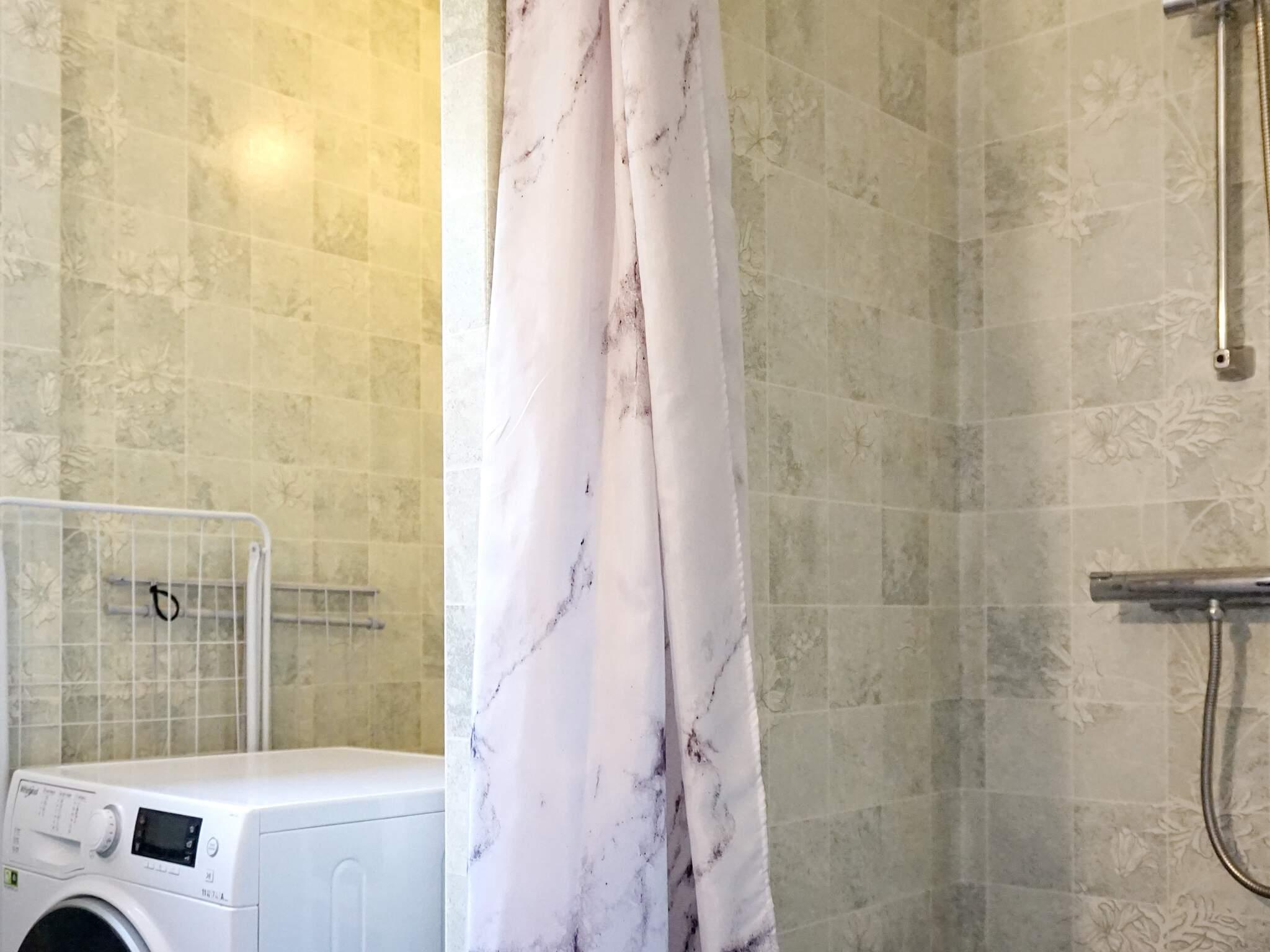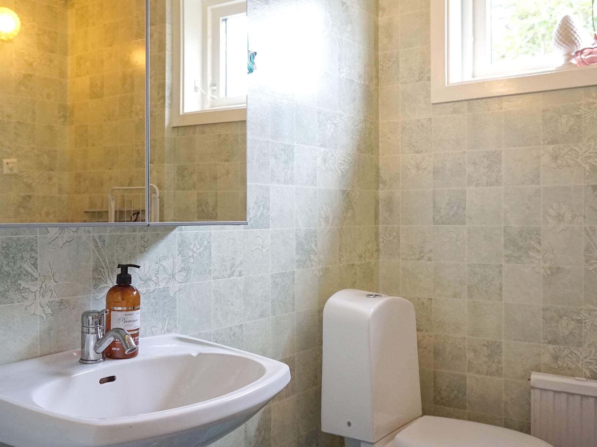 Großes Wohnzimmer im Haus mit u.a. zwei bequemen Schlafsofas und Fernseher mit SVTplay. WLAN vorhanden. Badezimmer mit Dusche und kombiniertem Waschtrockner.