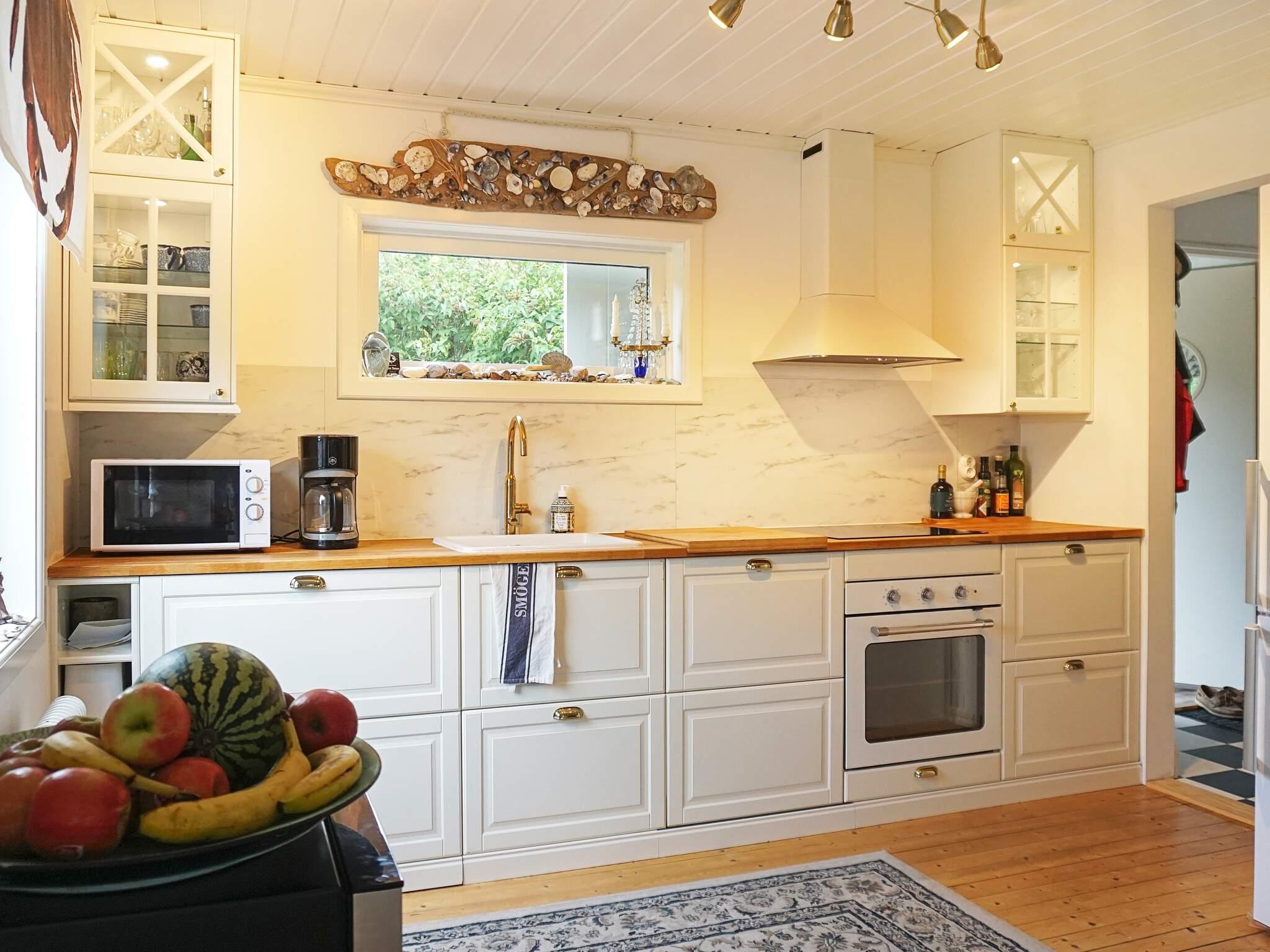 Vom Eingang des Ferienhauses erreichen Sie einen einladenden Vorraum. Dahinter erwartet Sie die geräumige Küche mit Essecke, Herd, separatem Backofen, Kühl-/Gefrierschrank, Mikrowelle, Kaffeemaschine und Geschirrspüler. Hochstuhl von TripTrap für die Kleinen.