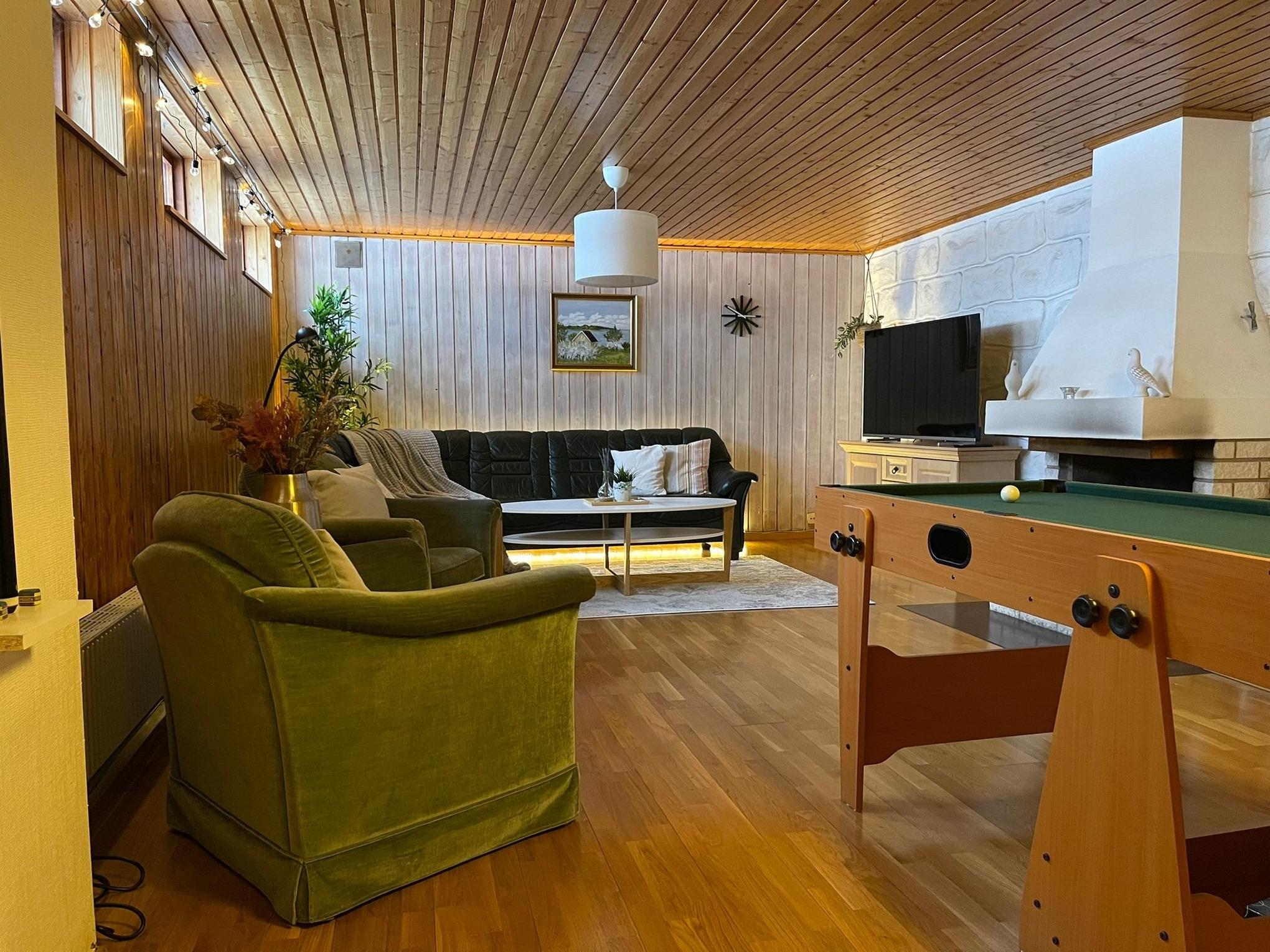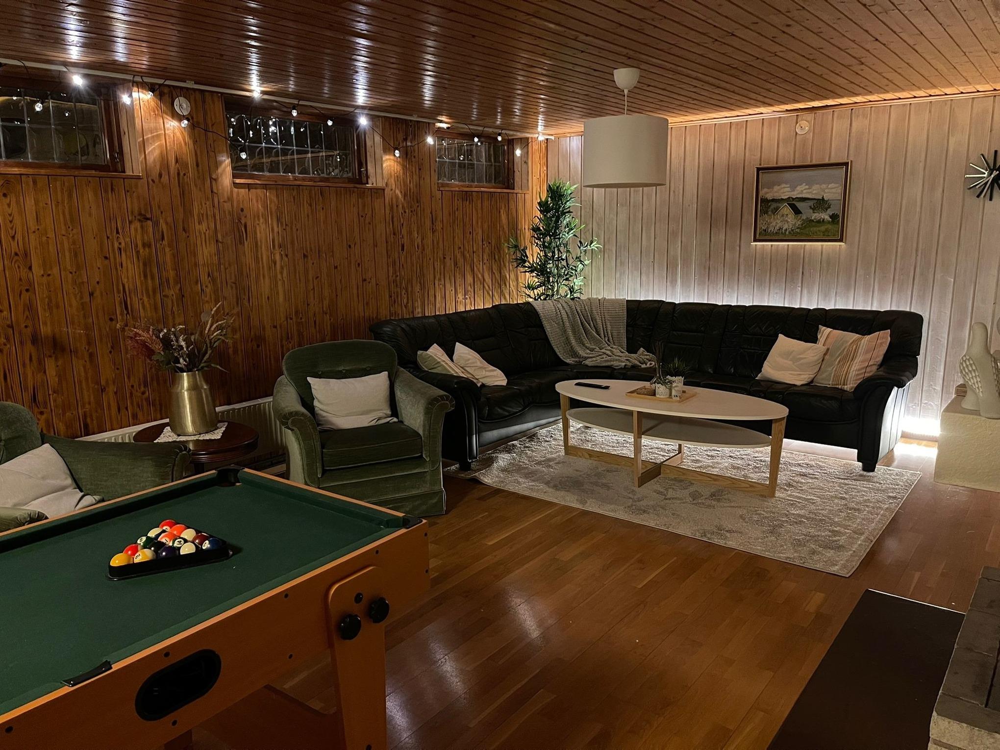 Im Sideboard finden Sie verschiedene Brett- und Kartenspiele, eine Playstation 3 inklusive Spiele, ein paar Spielfiguren und Schlümpfe sowie einen Verkehrsteppich. Außerdem haben Sie die Möglichkeit, entweder Billard oder Air Hockey sowie Darts zu spielen.