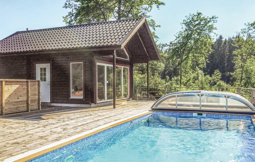Ausgezeichnete Aussicht auf den See Dalsjön. Ferienhaus mit großem Whirlpool und Salzwasserpool. Beide sind über dem Niveau platziert und bieten eine enorme Aussicht auf den see. Eine kleine Treppe führt zum See mit dem privaten Steg, dort liegt auch das Boot vertäut. Große Terrasse zum Sonnen. Das Haus ist außergewöhnlich. Große Fenster zum See hin, Kaminofen und Weinkühler machen das Beieinander perfekt. Der Schlafboden ist über eine Treppe erreichbar und hat 2 gute Betten und 2 dicke Matratzen. Internetverbindung. Im Nordende des Sees können Sie baden. Im See können Sie auf Hecht und Barsch angeln, Sie dürfen nicht mit Netz fischen und eine Angellizenz ist erforderlich. Es gibt auch ein gutes Vorkommen an Krebsen, diese dürfen von August bis Oktober gefangen werden. Sehenswürdigkeiten: Tierpark von Borås und die Stadt Göteborg.