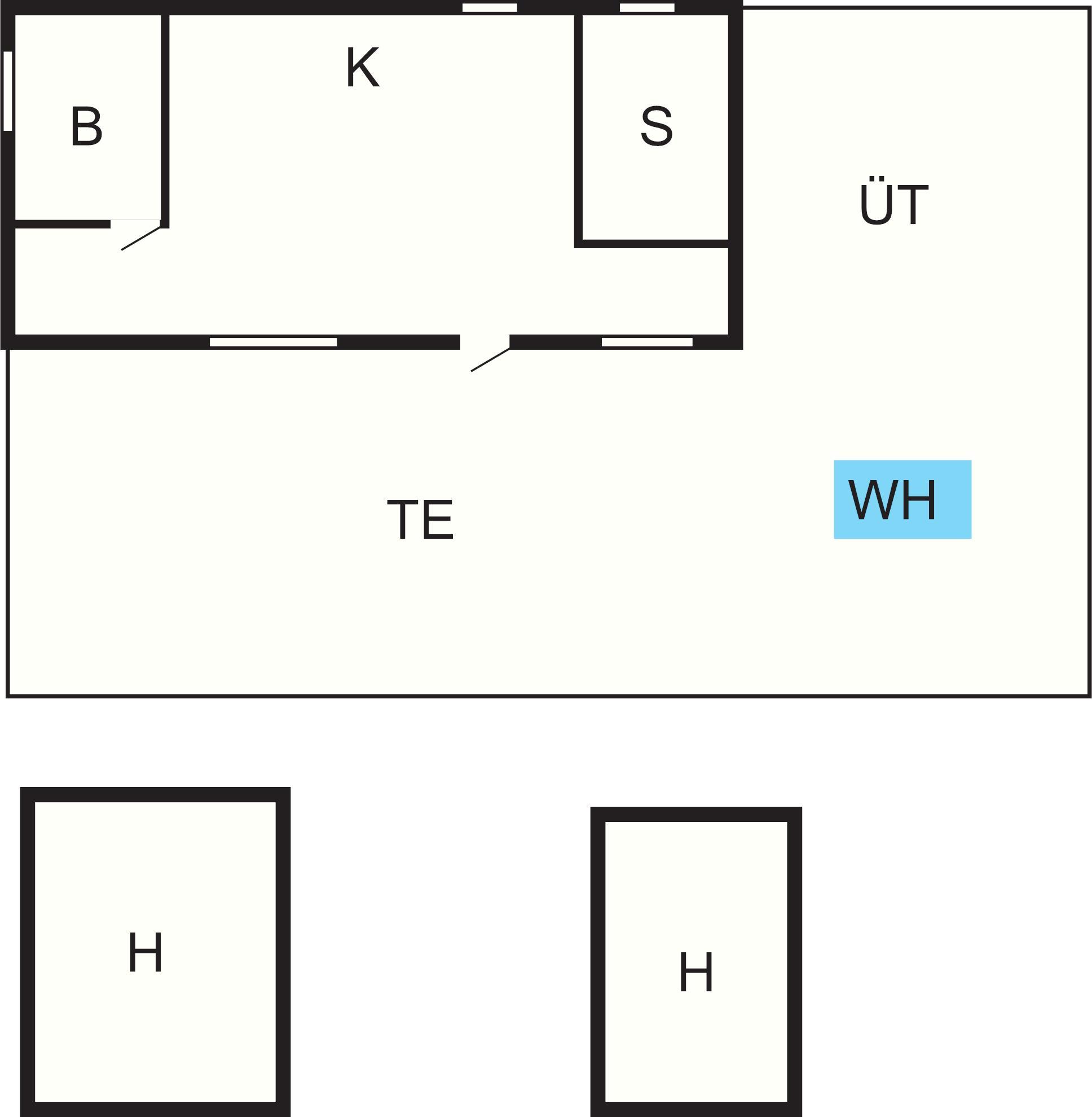 Off. Küche: E-Kochpl., Kühlschr. m. Gefrierfach, Mikrow., Abzugsh., Kaffeem.