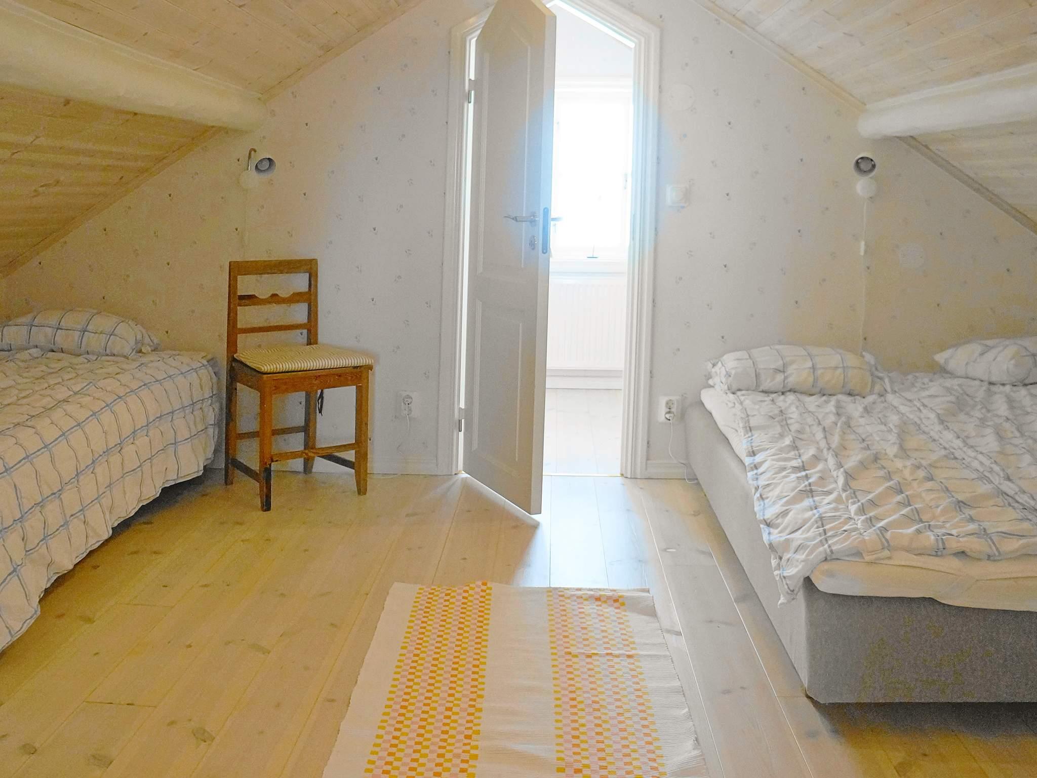 Von der zugehörigen Veranda genießt man herrlichen Meerblick! Innen wurde das Ferienhaus hell und ansprechend eingerichtet und stellt zwei Wohnebenen zur Verfügung: Unten liegen die offene, gut ausgestattete Küche mit Essecke sowie der moderne Wohnbereich, in dem u.a. ein Kaminofen und ein TV, mit etwa 30 schwedischen/englischen Sendern zur Auswahl, untergebracht sind. Ein Schlafzimmer mit Einzelbett befindet sich ebenfalls im Erdgeschoss. In der oberen Etage erwarten Sie zwei luftige Schlafzimmer mit Dachschrägen (kein Aufrechtstehen an den Seiten möglich), eines davon mit drei Schlafplätzen.