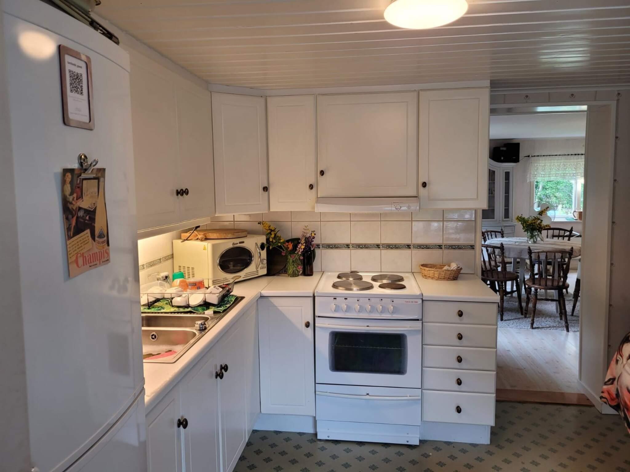 Das modernisierte Ferienhaus mit wohnlichem Charme hat eine Küche, die mit einem Kühlschrank, einem Gefrierschrank und einem Elektroherd ausgestattet ist, in der auch der alte, holzbefeuerte Gusseisenofen erhalten geblieben ist. Entzünden Sie am Abend ein Feuer im Ofen und genießen Sie die Wärme, die sich dann schnell im Haus ausbreitet. Das Holz wird vom Hausbesitzer großzügig zur Verfügung gestellt.