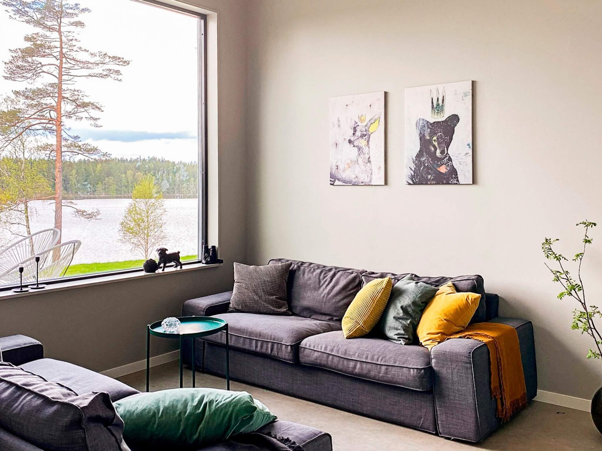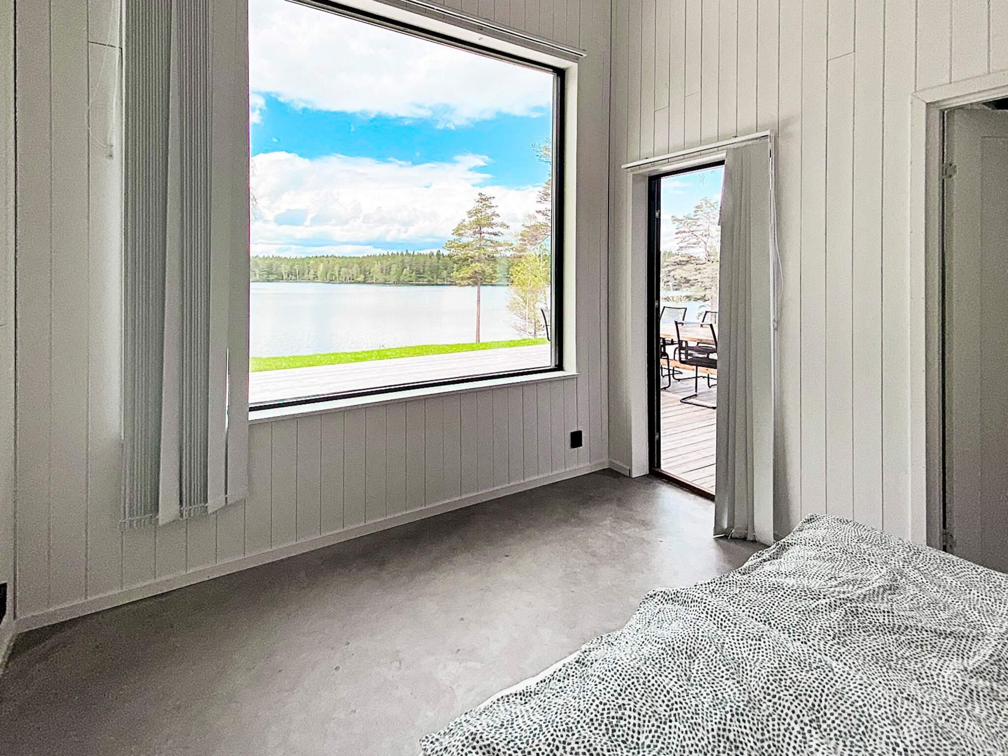 Ganz modern und offen gestaltetes Ferienhaus mit großartiger Aussicht in die Natur ringsum und zum nahen See durch die großen Panoramafenster des Hauses! Die bodentiefe Fensterfront erstreckt fast über die komplette Seeseite des Hauses und lässt sich an warmen Sommertage teilweise öffnen, wobei sich innen und außen Dank der großen Holzterrasse dann vereinen. Wer möchte hier nicht seine Urlaubstage mit unverstelltem Seeblick entspannt genießen?