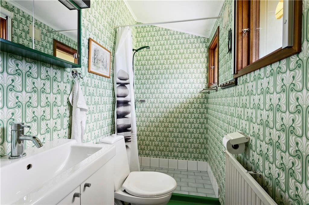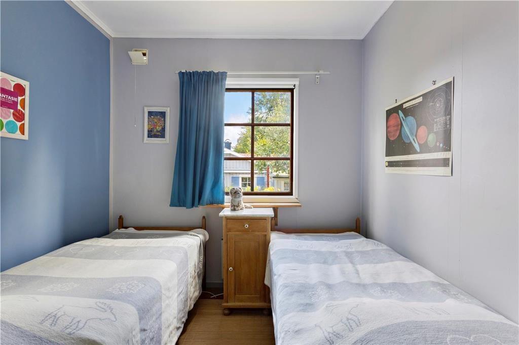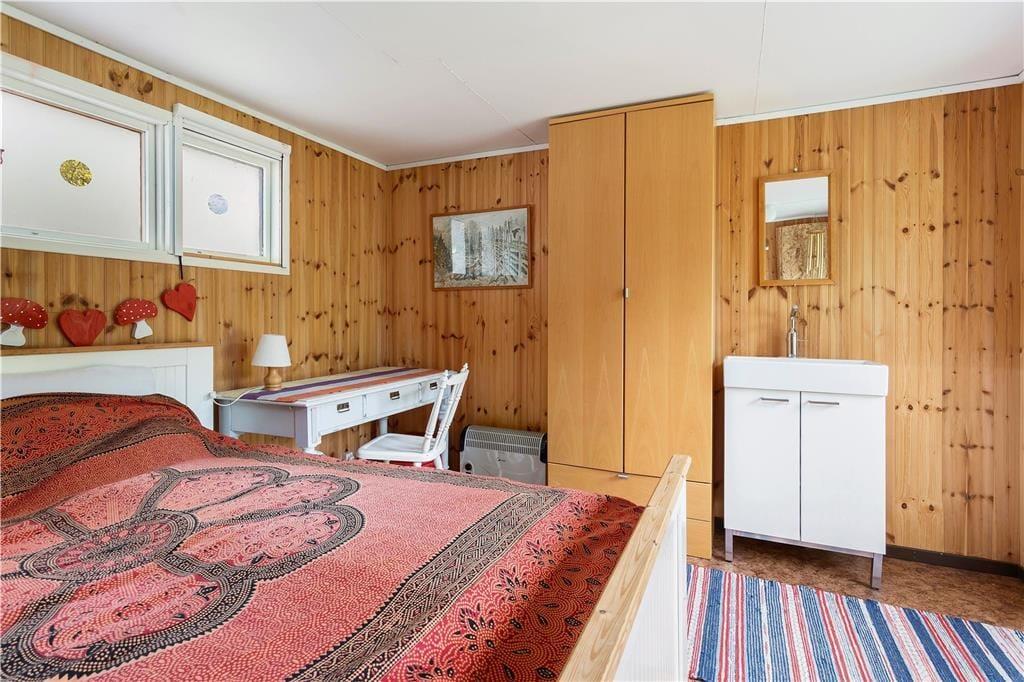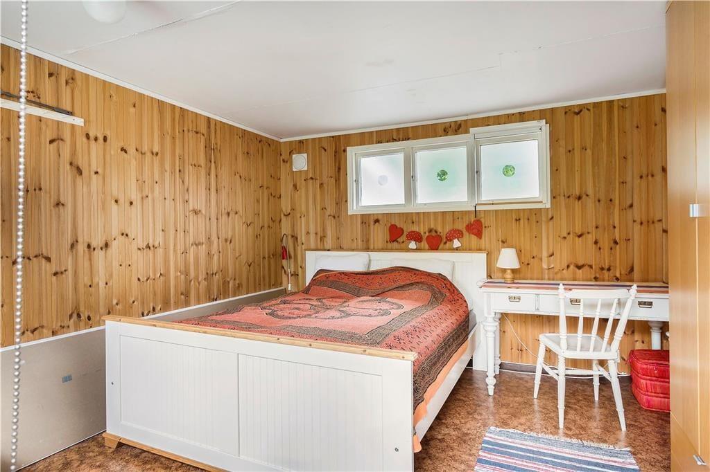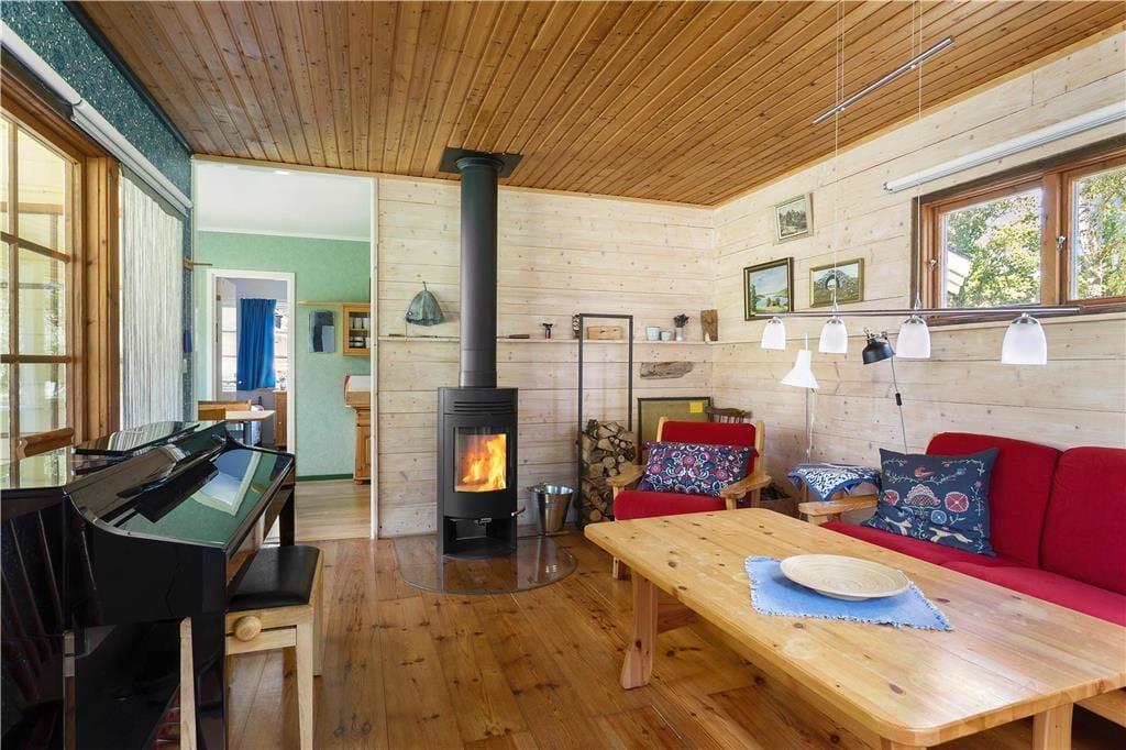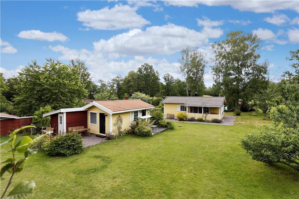 Die auf einem großen Wiesengrundstück nahe beieinander liegenden Ferienhäuser bieten Platz für insgesamt sechs Personen. Das größere Haupthaus hat eine Wohnfläche von etwa 40 m² mit zwei Schlafzimmern, von denen eines mit einem 160 cm breiten Doppelbett möbliert ist, das andere mit zwei Einzelbetten. Beide Schlafzimmer, wie auch das Duschbad, sind mit modernen Insektenrollos ausgestattet, so dass die Fenster auch bei Nacht und bei Beleuchtung geöffnet bleiben können. Beide Schlafzimmer verfügen außerdem über jeweils zwei Kleiderschränke. Das helle Wohnzimmer mit der vorgelagerten Südveranda ist mit bequemen Sitzmöbeln, einem Kaminofen und einem im Schrank verborgenen SAT-TV ausgestattet. Zudem befindet sich hier ein E-Piano der Marke Yamaha und eine Ibanez-Gitarre. Beide Instrumente stehen den Gästen ebenfalls zur Verfügung, ebenso die kleine Bibliothek und die vorhandenen Gesellschaftsspiele. Die traditionell im schwedischen Stil ausgestattete Küche ist reichlich mit Koch- und Essgeschirr ausgestattet. Auch Espresso und Milchschaum kann mit den vorhandenen Geräten hergestellt werden.