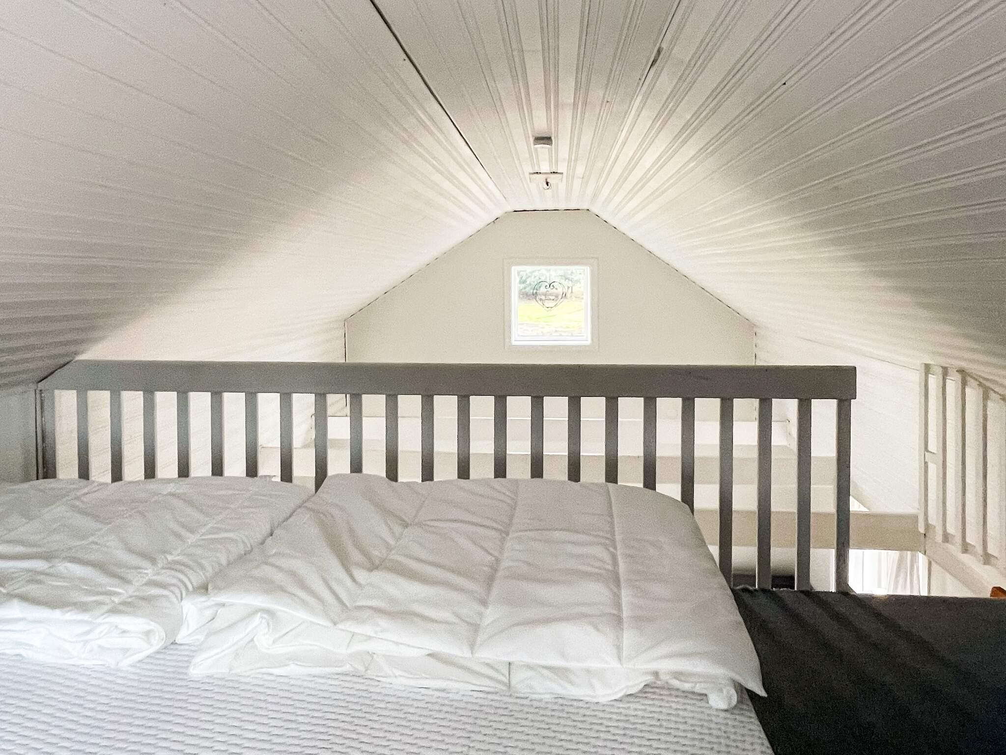 Über eine steile Treppe gelangt man zum Schlafboden unter dem First in einem komfortablen Doppelbett.