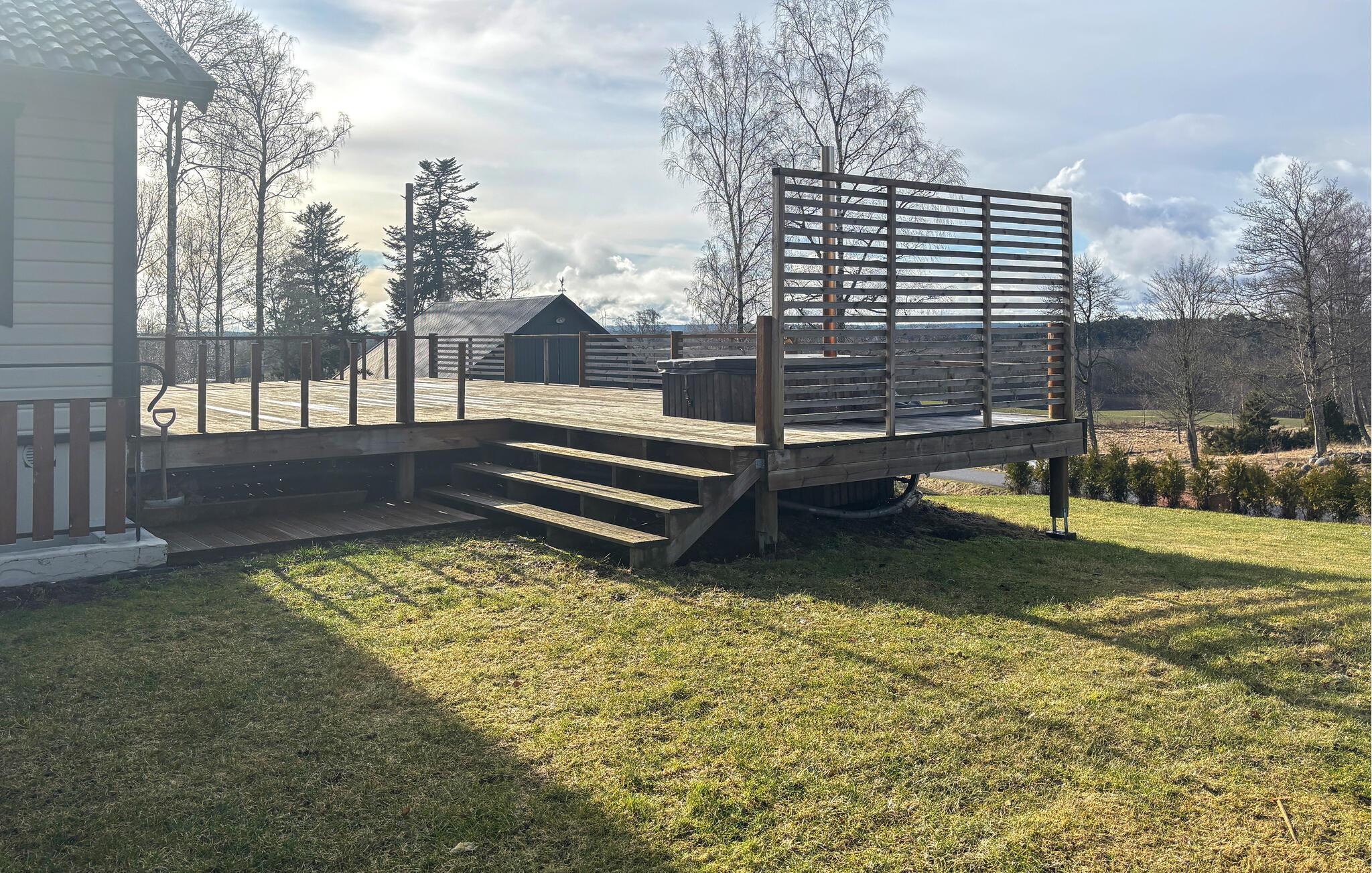 Der Außenbereich besticht durch eine große Holzterrasse und einen wunderschönen Blick auf die umliegende Idylle. Genießen Sie entspannte Stunden im Whirlpool unter freiem Himmel, veranstalten Sie stimmungsvolle Grillabende und verbringen Sie lauschige Stunden bei Wein und Kerzenschein.