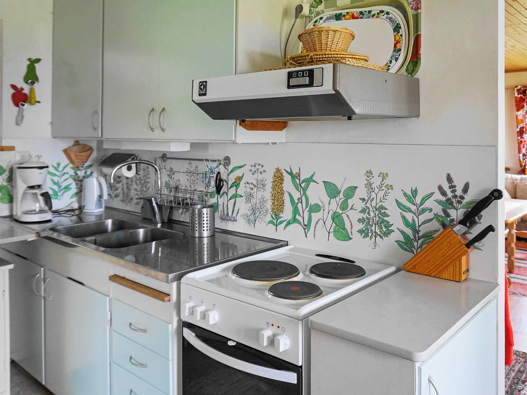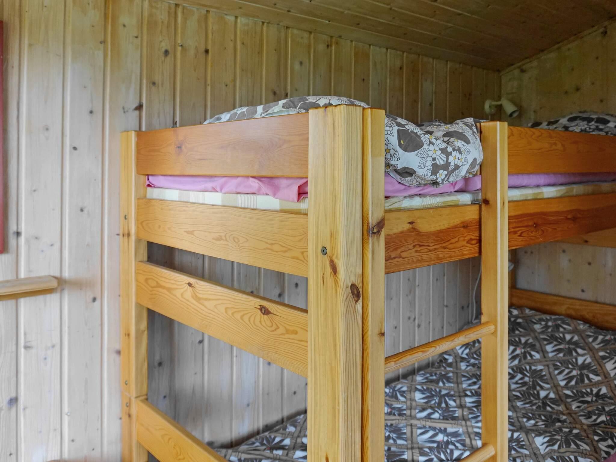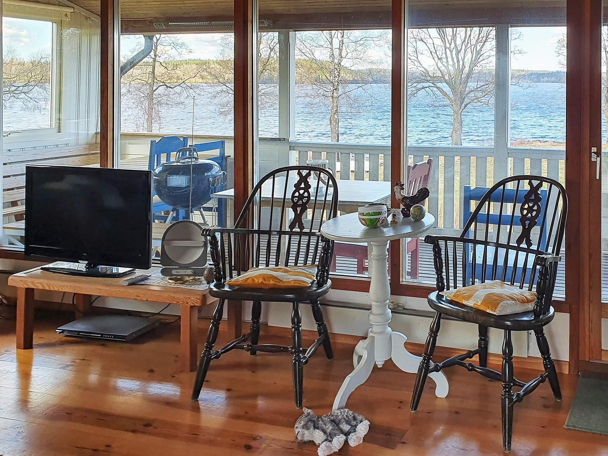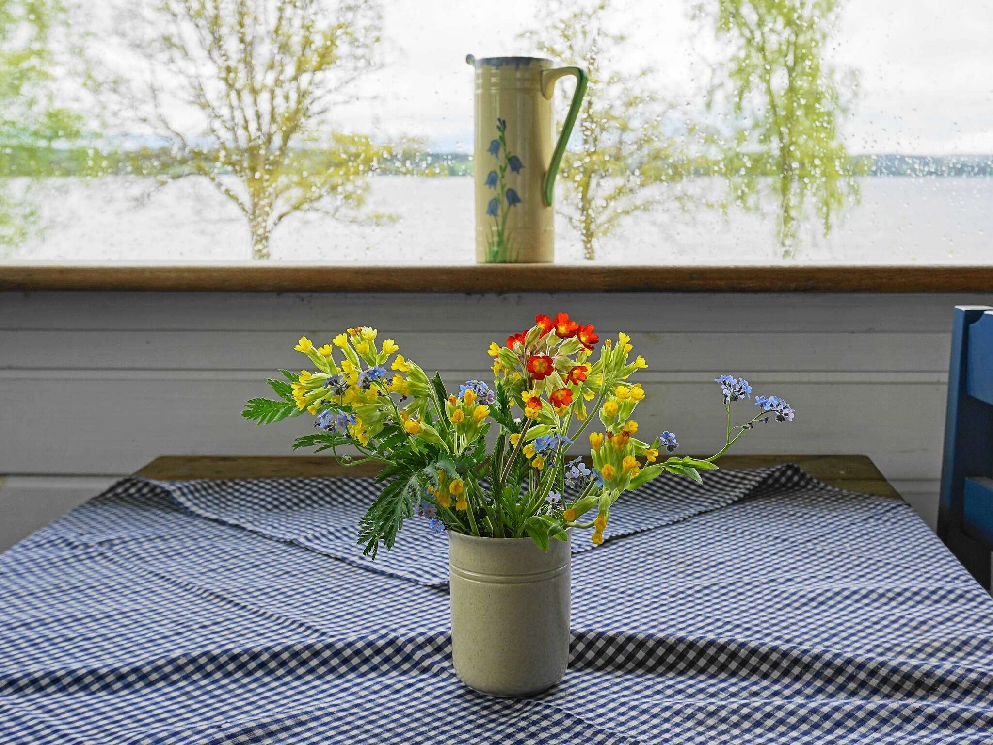 Das Ferienhaus liegt leigt erhöht auf einem schönen Ufergrundstück und verfügt über zwei Schlafzimmer mit jeweils zwei Einzelbetten. Küche mit Essbereich mit herrlichem Seeblick. Wohnzimmer mit Sofa und wärmendem Holzofen für kühlere Abende. Auch hier hat man einen Seeblick, schön wie auf einem Gemälde. Ausgang zur überdachten Terrasse, wo Sie mit Seeblick grillen und den langen Sommerabend genießen können. Badezimmer mit Duschkabine und WC.