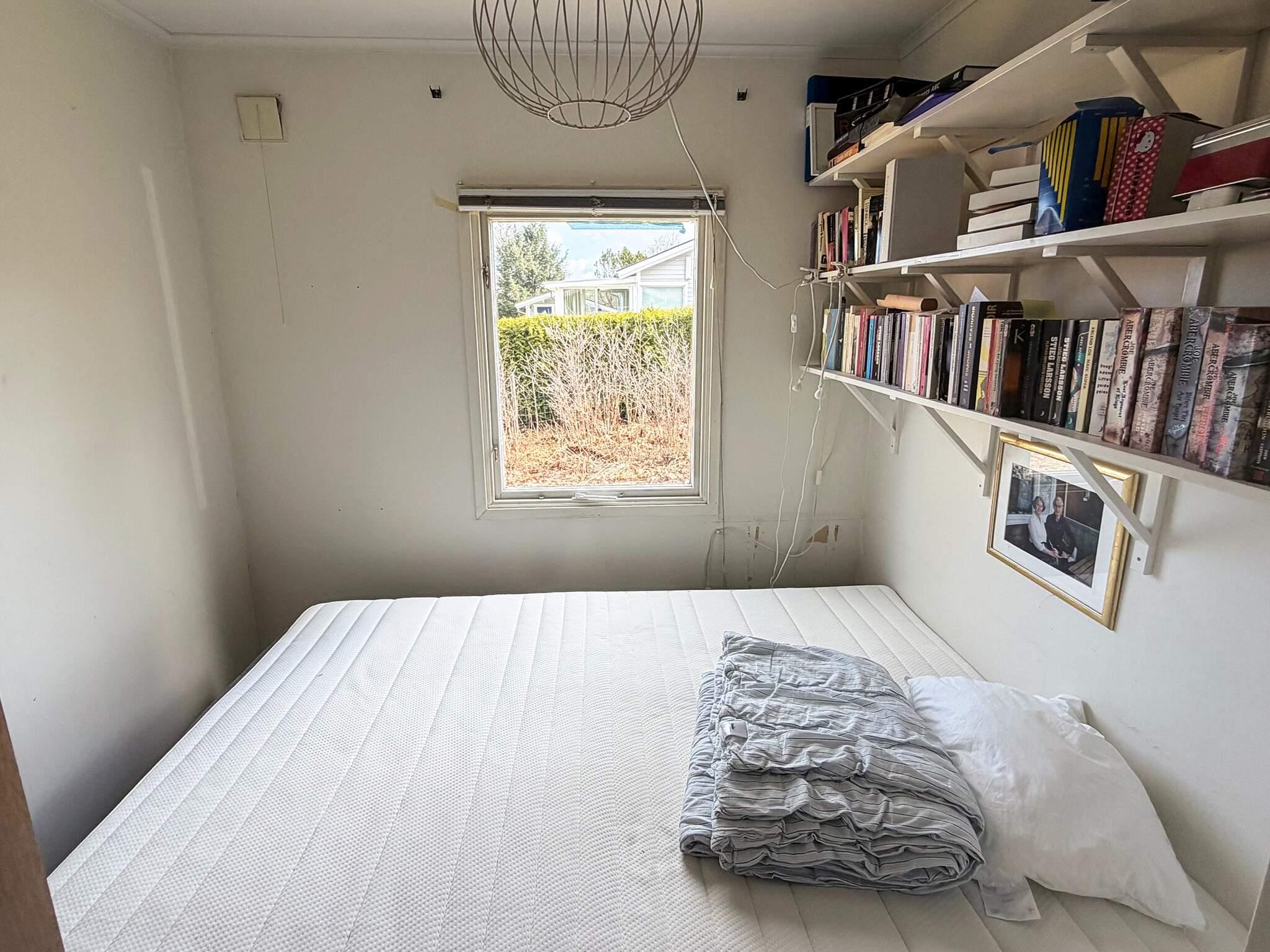 The living room, with its beautiful natural light, features large windows facing the terrace, where you can relax in the outdoor furniture and perhaps enjoy something from the grill. The cottage has a bedroom with a double bed, as well as a fresh bathroom with WC, shower, and washing machine.