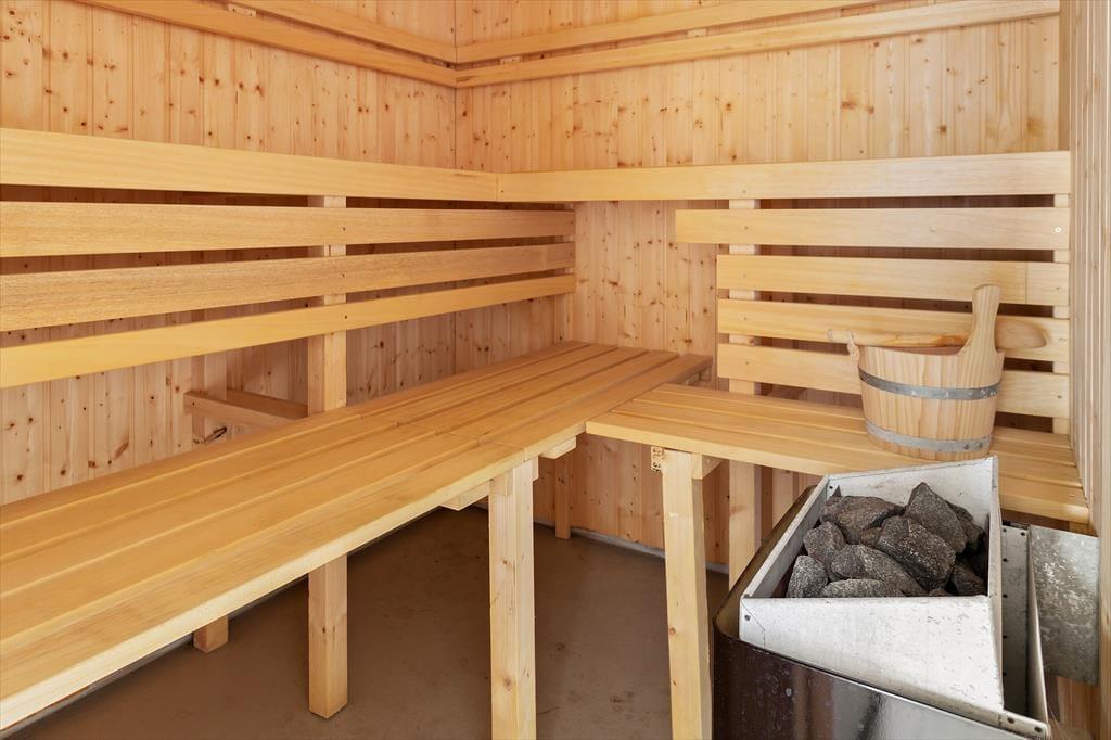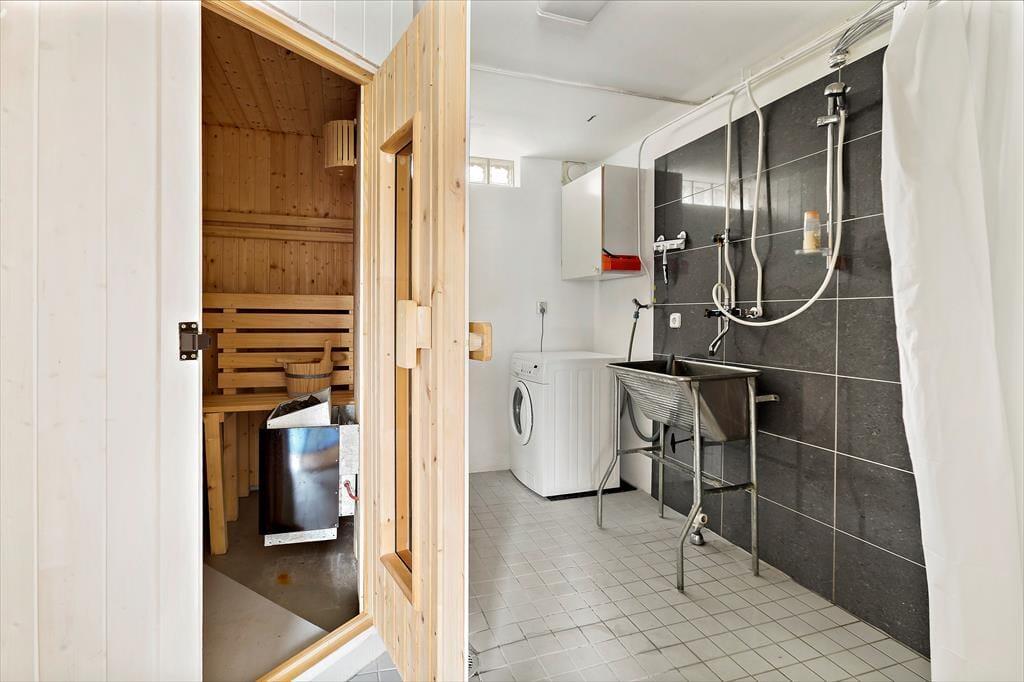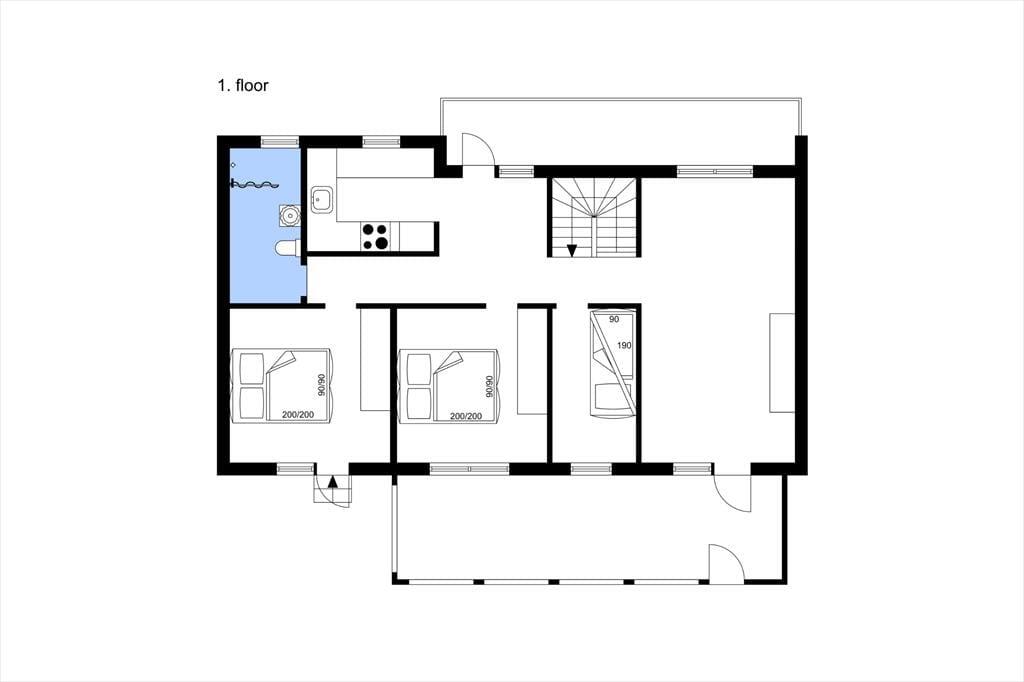 Ein modernes, geräumiges Ferienhaus für bis zu sechs Personen mit sehr guter Ausstattung. Das am Hang liegende, zweigeschossige Ferienhaus hat eine Wohnfläche von etwa 140 m². Der Hauseingang befindet sich ebenerdig auf der Straßenseite. Im Erdgeschoss des Hauses findet man ein geräumiges Wohnzimmer, ausgestattet mit gemütlichen Sitzmöbeln, Kaminofen und Sat-TV (deutsche Programme) sowie, im ehemaligen Hauswirtschaftsraum, eine Sauna mit Dusche und Waschmaschine und eine separate Toilette. Drei Schlafzimmer, zwei davon mit Doppelbetten, eines mit einem Etagenbett ausgestattet, sowie die Küche, ein Esszimmer und ein Duschbad mit WC befinden sich im Obergeschoss, an das sich zur Straßenseite ein von der Küche und vom Flur aus begehbarer Balkon anschließt und man auf der Hausrückseite über den mit gepolsterten Gartenmöbeln ausgestatteten Wintergarten in den höher gelegenen hinteren Teil des Grundstücks gelangt, wo sich auf der Rasenfläche eine Wäschespinne befindet. In der modernen Küche gibt es einen Elektroherd mit Backofen sowie eine Kühl- Gefrierkombination und eine Kaffeemaschine. Das Haus hat ganzjährig kommunale Wasser- und Abwasserversorgung und kann elektrisch beheizt werden. In der über den Saunaraum erreichbaren ehemaligen Garage befinden sich Gartengeräte sowie drei Fahrräder. Den Gästen des Hauses stehen weiterhin zwei Sonnenliegen, ein Kugelgrill sowie ein Ruderboot zur Verfügung, das, wenn das Haus nicht bewohnt ist, im Carport aufbewahrt wird.