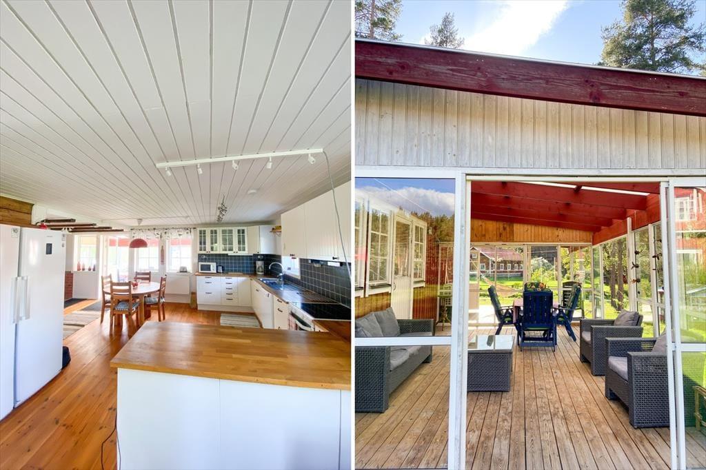 Das im Jahr 1850 errichtete Ferienhaus verfügt über etwa 130 m² große Wohnfläche. Der große Wohnraum im Erdgeschoss bietet eine sehr gut ausgestattete Wohnküche mit E-Herd, Backofen, Holzofen, Kühl- und Gefrierkombination, Geschirrspüler, Mikrowelle, Kaffeemaschine und Esstisch. Eine gemütliche Sitzecke lädt zum Entspannen ein. Der Fernseher bietet schwedische Programme, außerdem gibt es WLAN im Haus. Das geräumige Badezimmer mit zwei Duschen, zwei WCs und Doppelwaschbecken bietet außerdem eine Waschmaschine und einen Trockner. Die Schlafzimmer befinden sich im Dachgeschoss. Im größeren Zimmer stehen drei Einzelbetten und eine Sofagarnitur, und im zweiten Schlafzimmer befindet sich ein bequemes Doppelbett. Der große Wintergarten mit Seeblick verlängert die Sommersaison – der perfekte Ort, um den Morgenkaffee zu genießen.