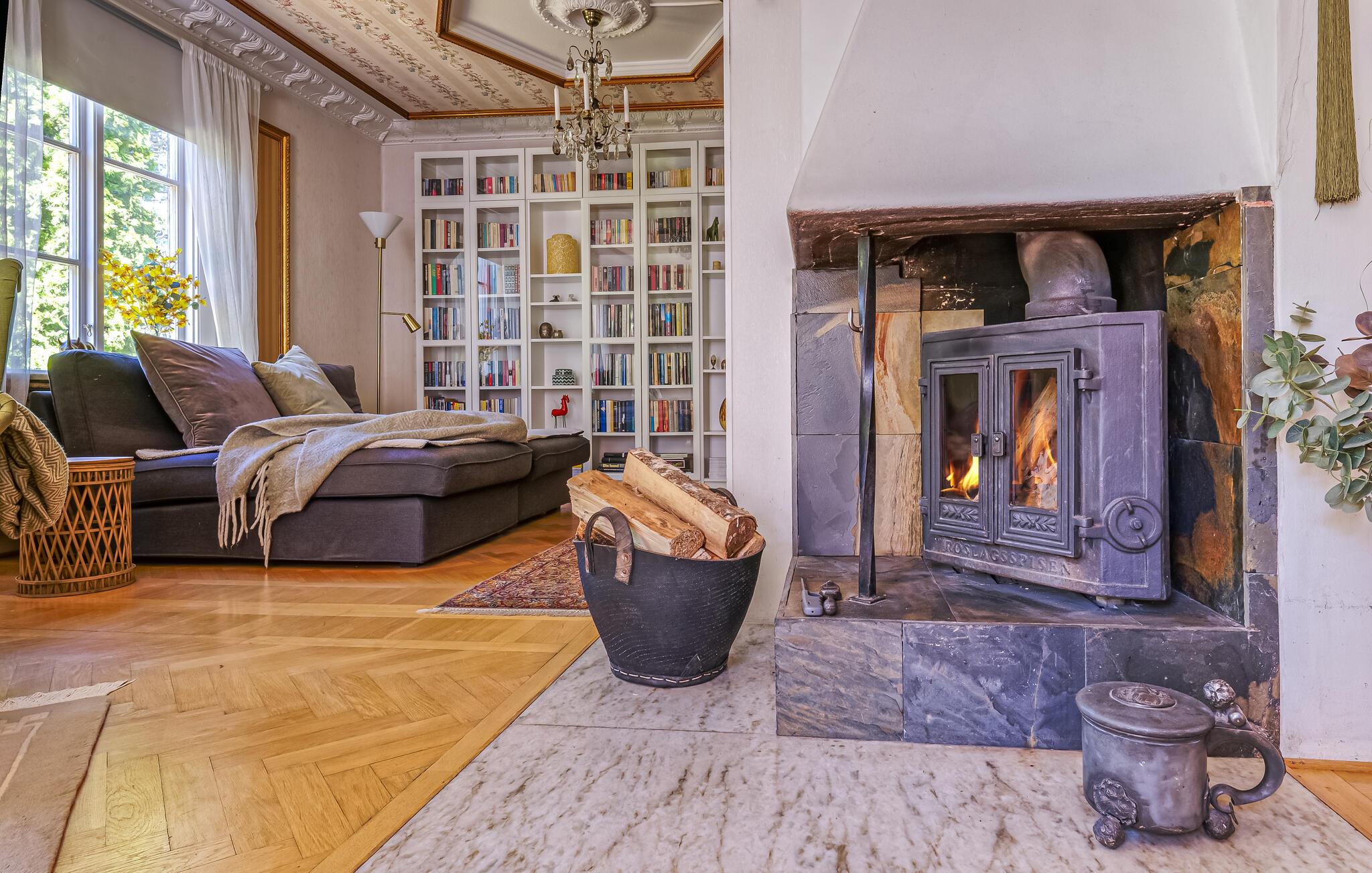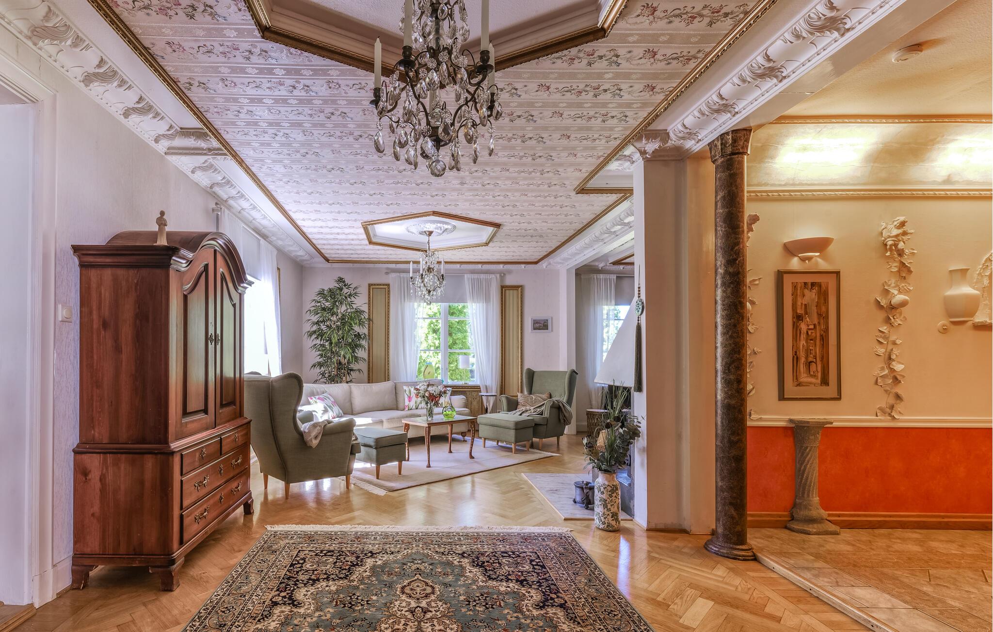 Lassen Sie sich von diesem Haus verzaubern! Stuckverzierte Decken, nostalgisches Mobiliar und gestreifte Tapeten schaffen ein ebenso einladendes wie beruhigendes Ambiente, so dass Sie schnell zur Ruhe kommen und neue Energie tanken können. Für Abwechslung sorgen ein erfrischendes Bad im Innenpool oder wärmende Stunden in der Sauna. Wer mag, zündet im Anschluss den Kamin an und verbringt den Abend bei einem Glas Wein.