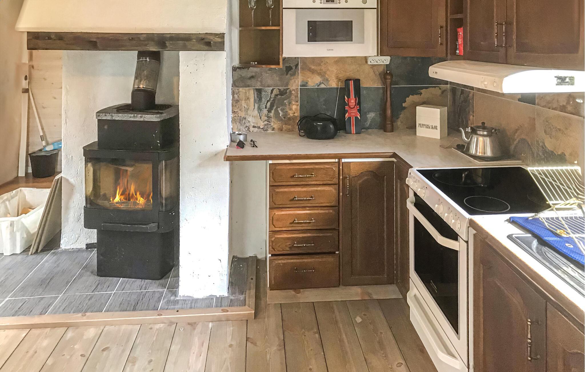Die Wohnfläche des Hauses erstreckt sich über einen Wohnbereich mit offener Küche, zwei Schlafzimmer und ein Badezimmer. An kühlen Tagen verbreitet der Kaminofen Wärme und Gemütlichkeit - machen Sie es sich gemütlich!