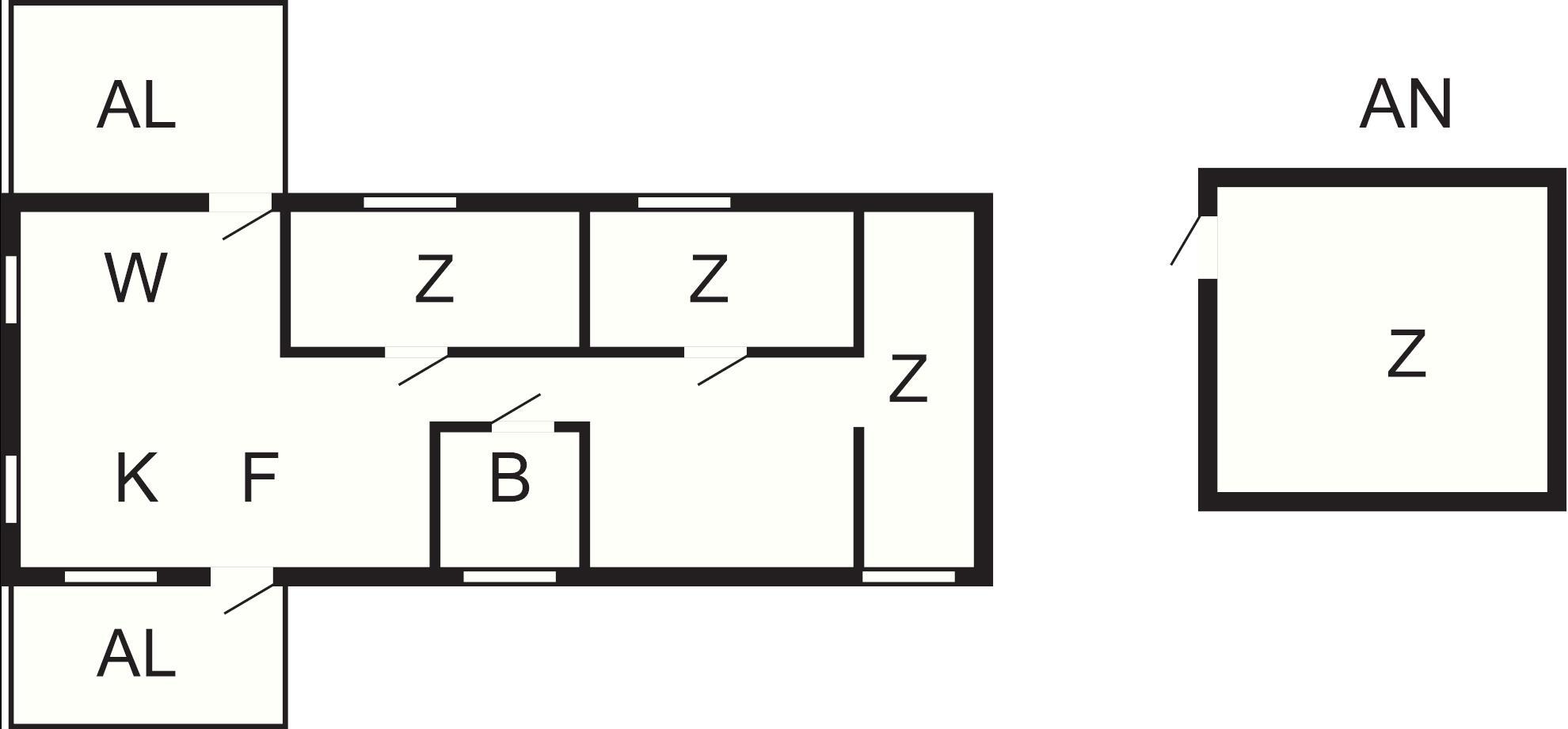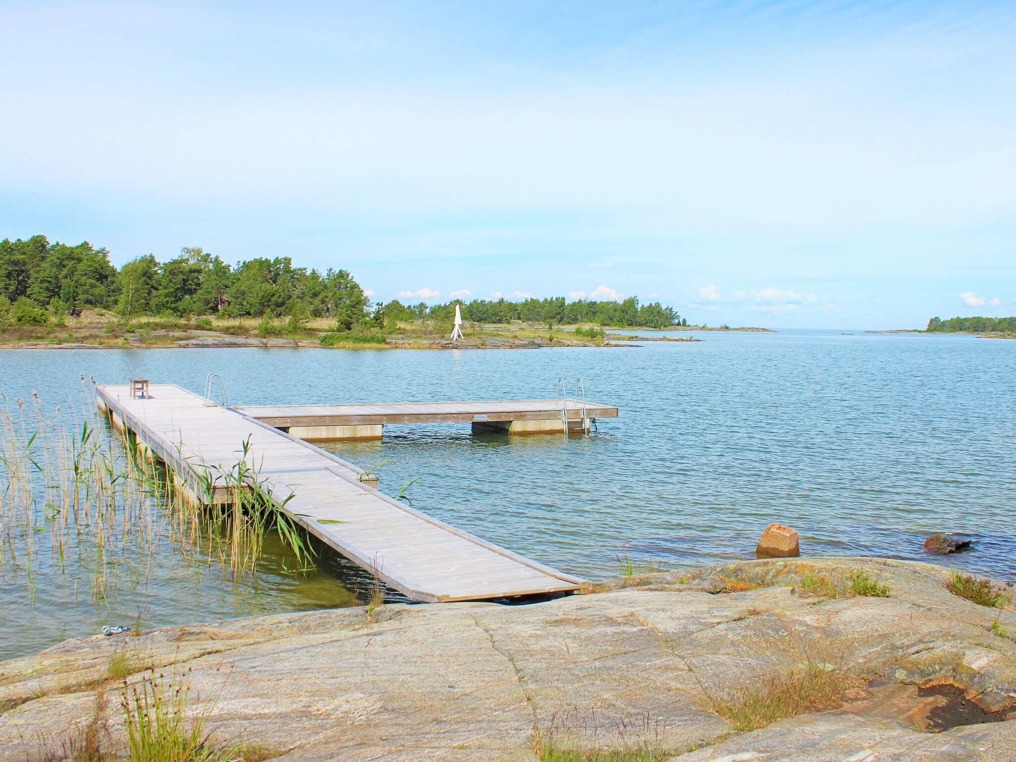 Hinter dem Haus steht ein kleinerer, separater Annex mit zwei weiteren Schlafplätzen innen und eigener, kleiner Veranda davor. Das Ferienhaus steht in einem ruhigen Ferienhausgebiet am Wald. Zwischen der Hauswand und einem gegenüber liegenden, weißen Haus führt ein kleiner Pfad hinunter zum Badeufer des Ferienhausgebietes. Man geht etwa 10 Minuten dorthin und findet dann einen Badesteg, ein kleines Strandufer sowie einige Grillmöglichkeiten vor.