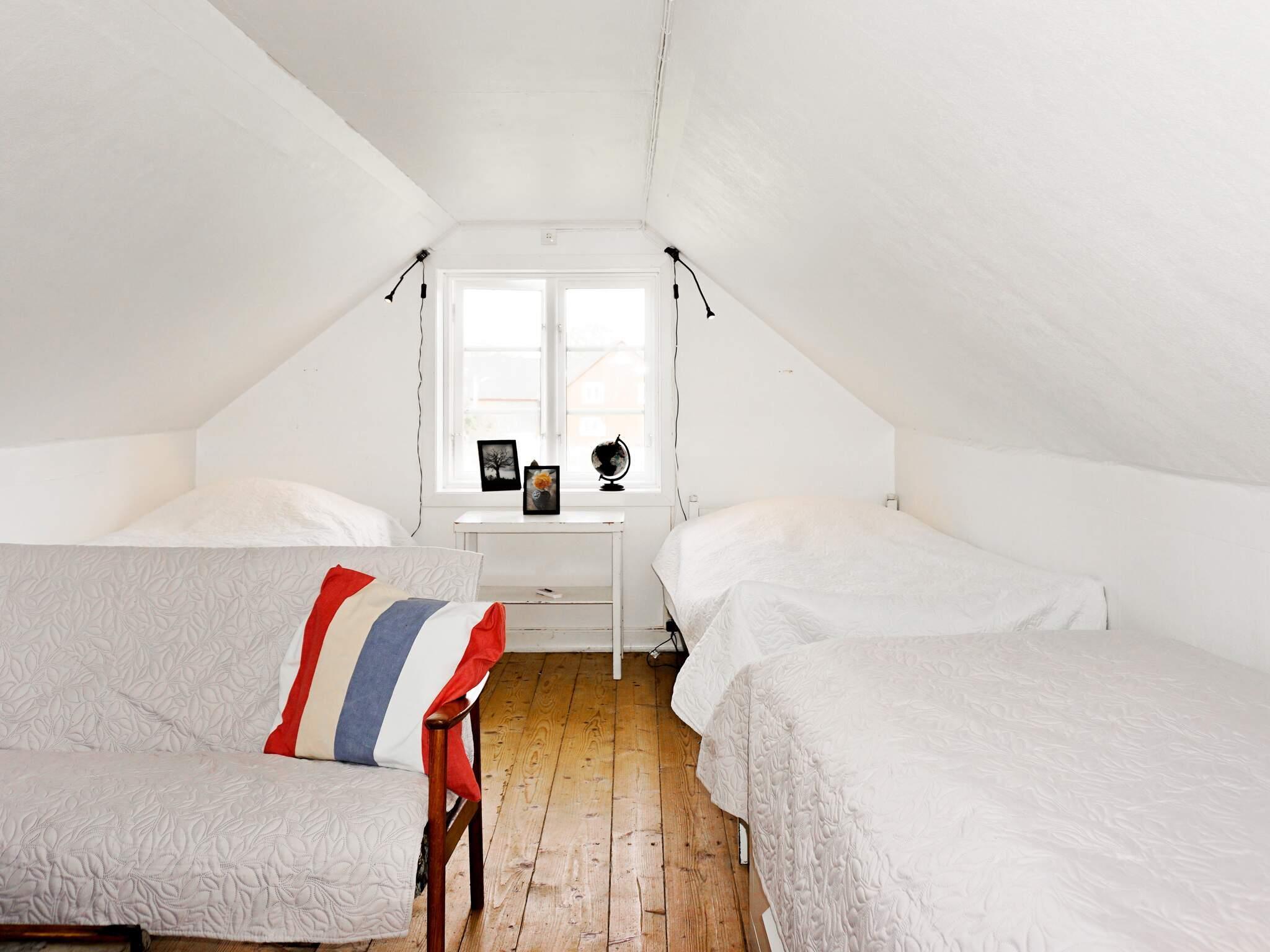 Die obere Etage mit Dachschrägen bietet zwei weitere Schlafzimmer; eines mit zwei Einzelbetten, das zweite mit drei Schlafplätzen, ein davon ausklappbar zu einer breiteren Liegefläche.