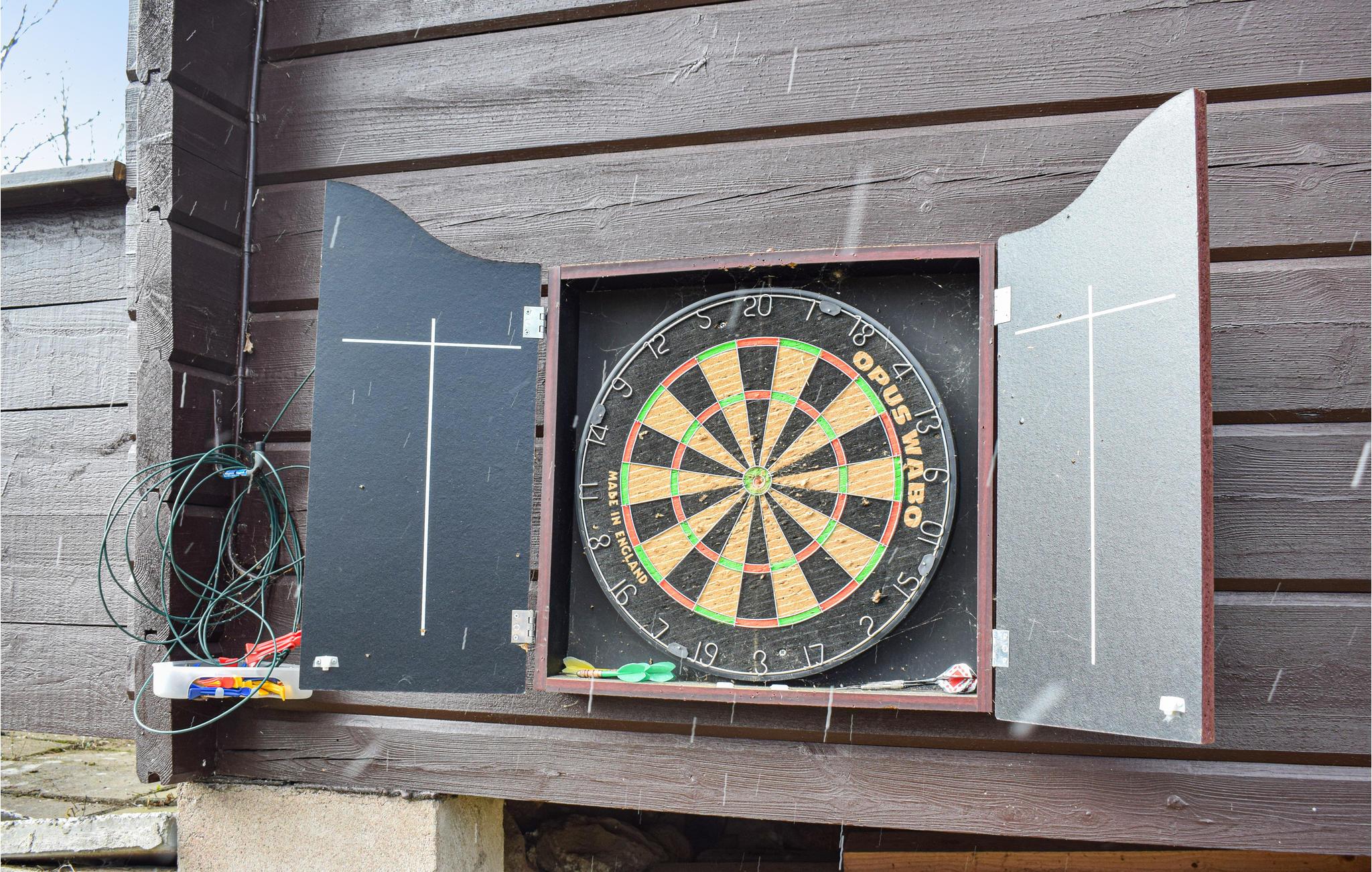 Nutzen Sie den Außenbereich für erholsame Stunden in der Natur. Die überdachte Veranda lädt dazu ein, Ihre Mahlzeiten im Freien zu genießen oder einfach die frische Luft und den Blick ins Grüne zu erleben. Verbringen Sie auch vergnügliche Stunden im Freien und spielen Sie Dart.