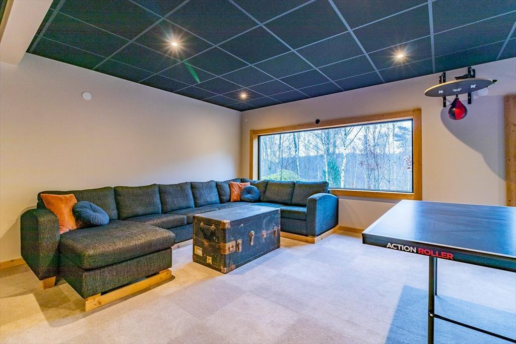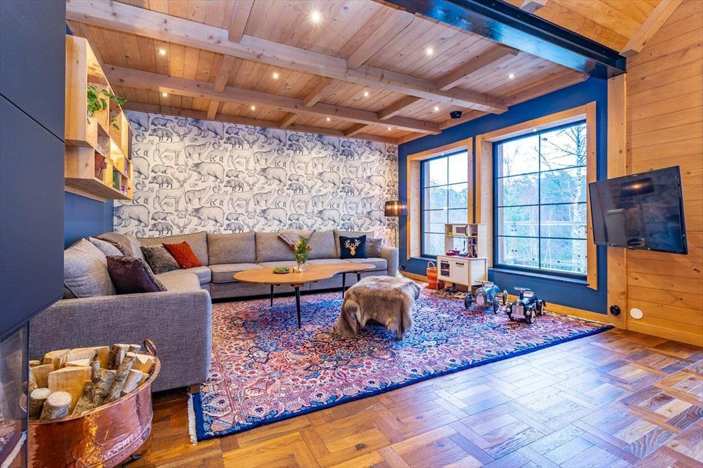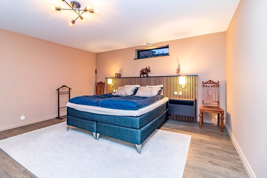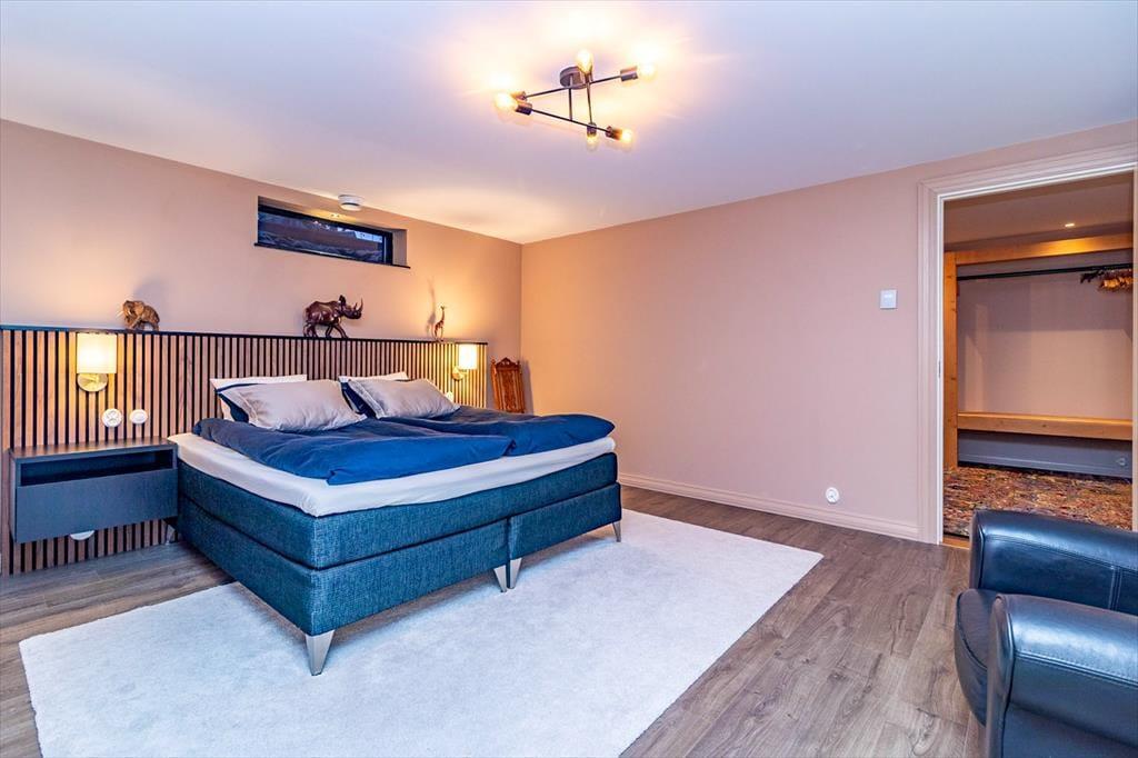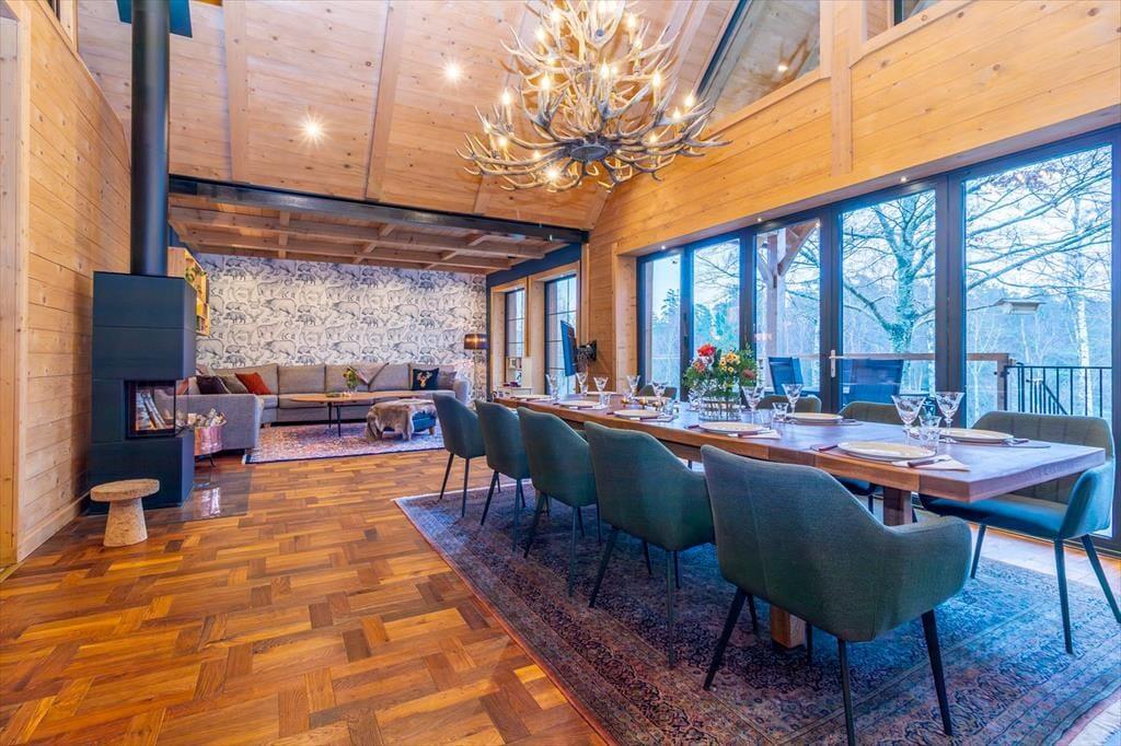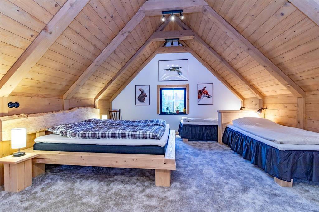 Das Ferienhaus hat eine Wohnfläche von ca. 320 m2 und lässt keine Wünsche offen. Direkt nach dem Betreten des Hauses befindet man sich in einem großen und offenen Flur. Zur linken Seite liegt der Hobby- und Arbeitsraum, zur rechten Seite liegt das erste Badezimmer mit Dusche und WC. Nach vorne aus dem Flur heraus geht es in den großen und hellen Wohn-, Ess- und Küchenbereich. Die große Küche mit Insel ist hervorragend ausgestattet. Der große Esstisch im Essbereich bietet Platz für bis zu 10 Personen. Im Wohnbereich steht ein großes Ecksofa. Dazu gibt es einen TV und einem Kamin. Die große Glasfront mit Schiebetüren führt auf die Terrasse. Seitlich den Essbereiches führt eine Treppe in das Schlafloft mit einem Doppelbett und zwei Einzelbetten. Über den Flur geht es in die untere Etage. Dort befinden sich drei weitere Schlafzimmer mit Doppelbetten, ein Ankleidezimmer und einen Hauswirtschaftsraum mit Waschmaschine und Wäschetrockner. Jedes Schlafzimmer hat ein eigenes Badezimmer mit Dusche und WC. Das Hauptschlafzimmer verfügt zudem über eine Sauna und eine große Doppeldusche.