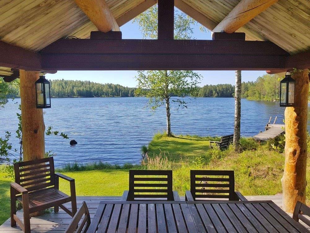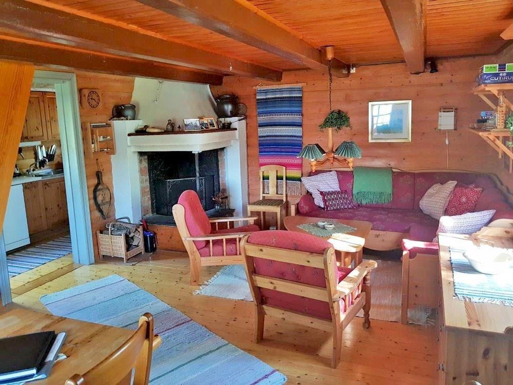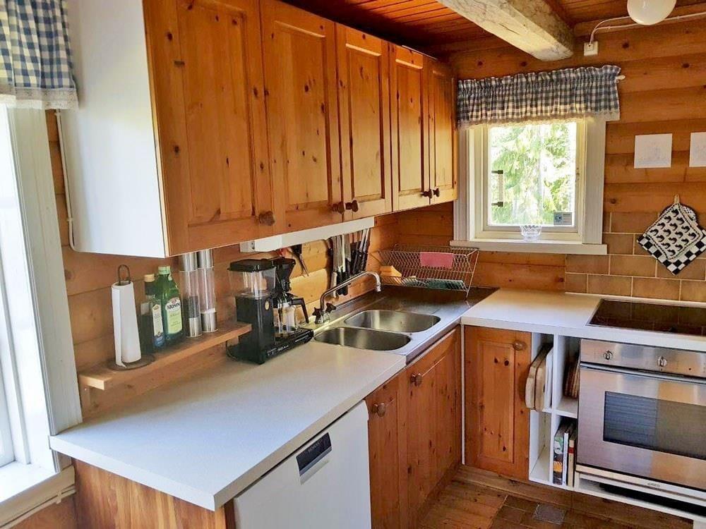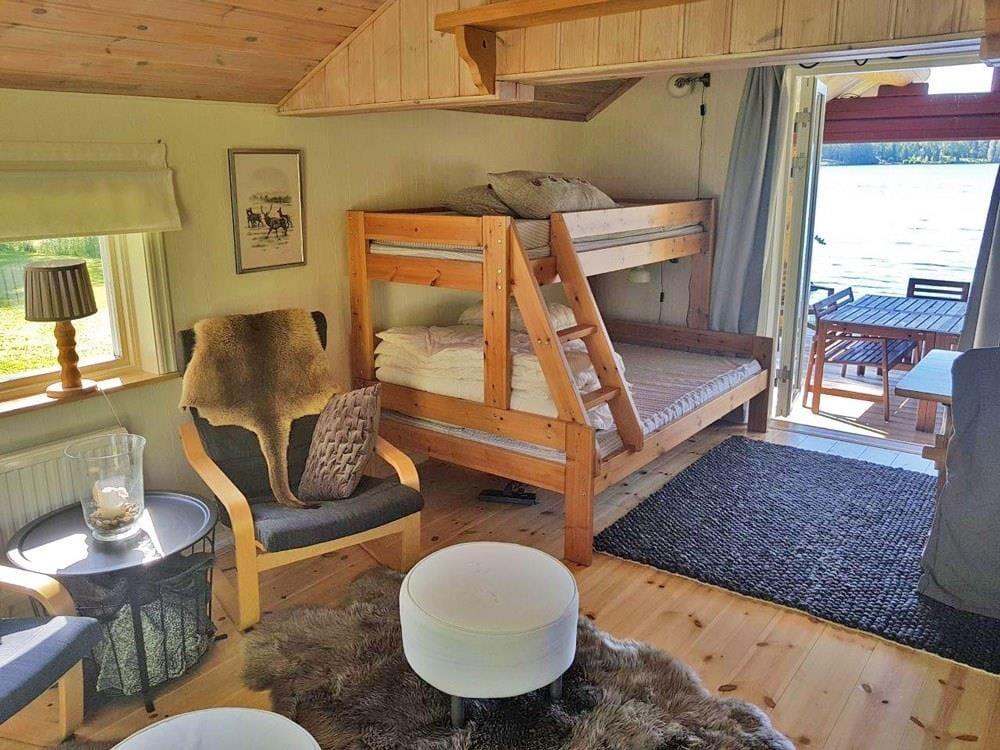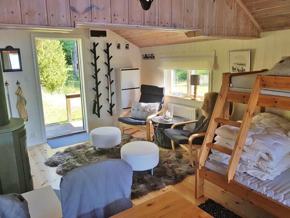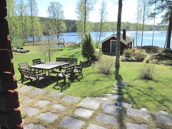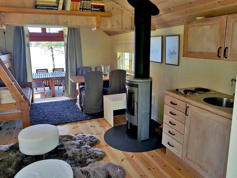 Das Haupthaus verfügt über eine Küche mit Elektroherd, Backofen, Geschirrspüler, Kühl- und Gefrierschrank, Mikrowelle und Kaffeemaschine. Der Wohn- und Essbereich ist mit einem großen Esstisch, einem offenen Kamin und einem Bettsofa für zwei Personen ausgestattet. Auf dem Schlafboden, der teilweise Stehhöhe bietet, befinden sich ein Doppelbett und eine Sitzgelegenheit sowie Matratzen, die nur für Kinder geeignet sind. Das Badezimmer findest du in einem Nebengebäude. Es ist mit WC, Dusche, fließend warmem Wasser und einer Waschmaschine ausgestattet. Das Gästehaus verfügt über eine offen gestaltete Wohnküche mit Elektroherd, Kühlschrank und Kaffeemaschine. Im Wohnbereich des Gästehauses gibt es einen Kaminofen, einen Esstisch und ein Etagenbett mit breitem Unterbett (1,40 m). Zum Außenbereich gehören eine überdachte Veranda mit herrlichem Seeblick, Gartenmöbel, ein Grillplatz sowie ein eigener Parkplatz am Ferienhaus. Zudem stehen dir ein eigenes Ruderboot und ein eigenes Kanu zur Verfügung, sodass du den See ausgiebig erkunden kannst.