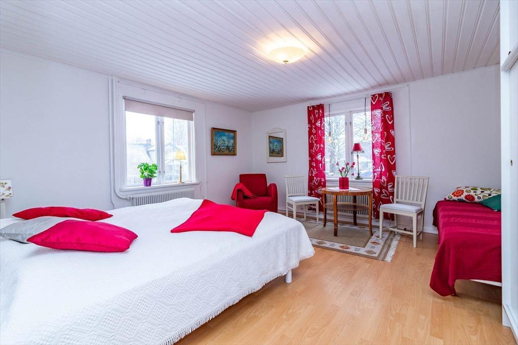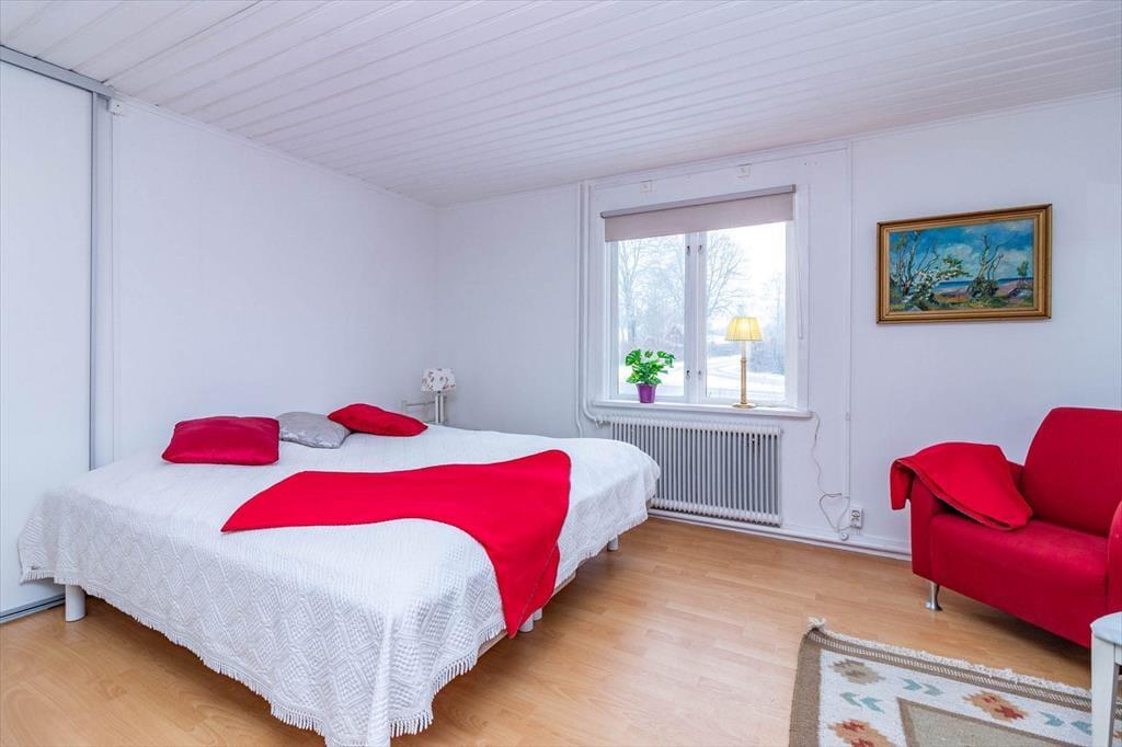 Die Schlafräume sind wie folgt ausgestattet: Im ersten Schlafzimmer stehen ein Einzelbett (80 cm breit) sowie ein Doppelbett (zwei zum Doppelbett zusammengestellte Einzelbetten à 90 cm). Das zweite Schlafzimmer bietet zwei Einzelbetten, ebenso das dritte. Zur weiteren Ausstattung gehören TV (deutsch), Internet, eine Terrasse mit Grill, ein Parkplatz sowie ein Ruderboot, das im Preis inbegriffen ist. Außerdem stehen dir eine Luftwärmepumpe und eine Waschmaschine zur Verfügung.