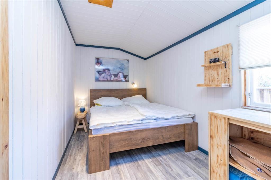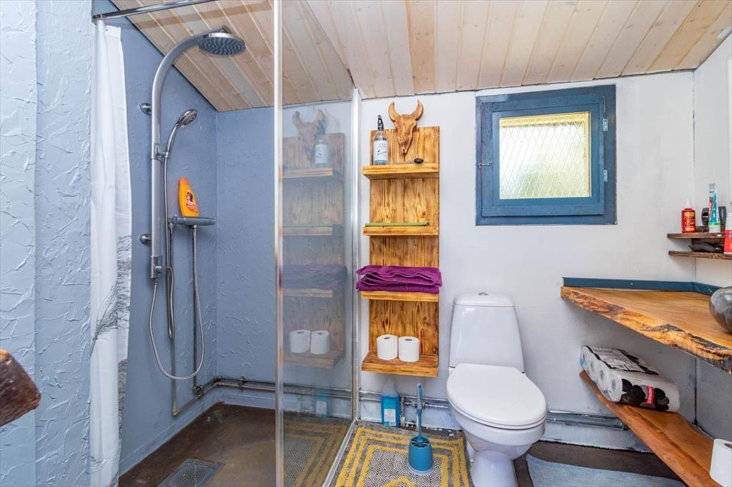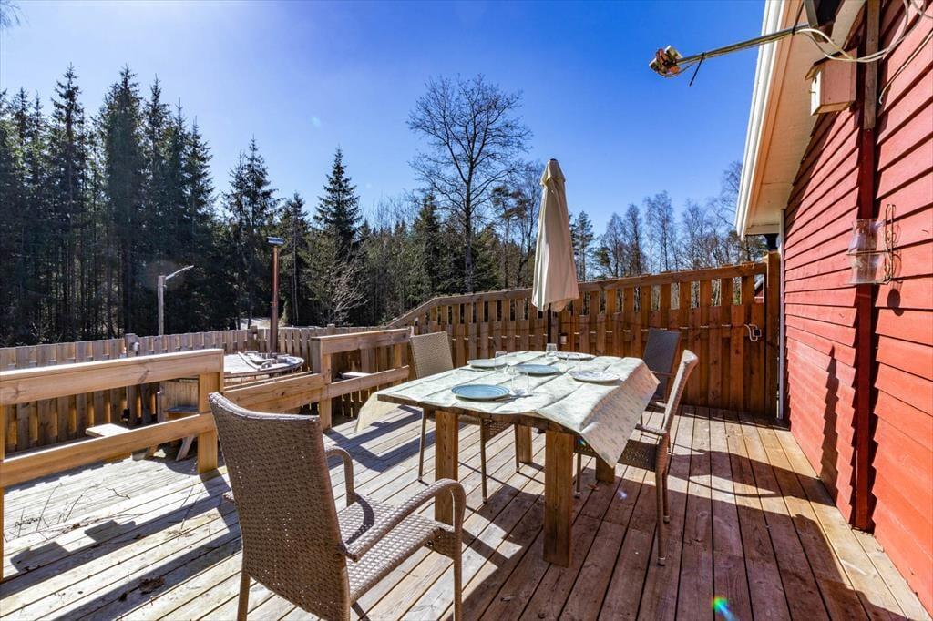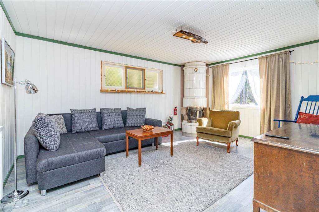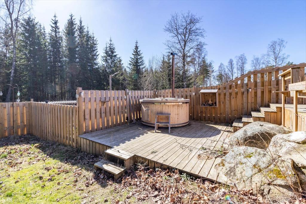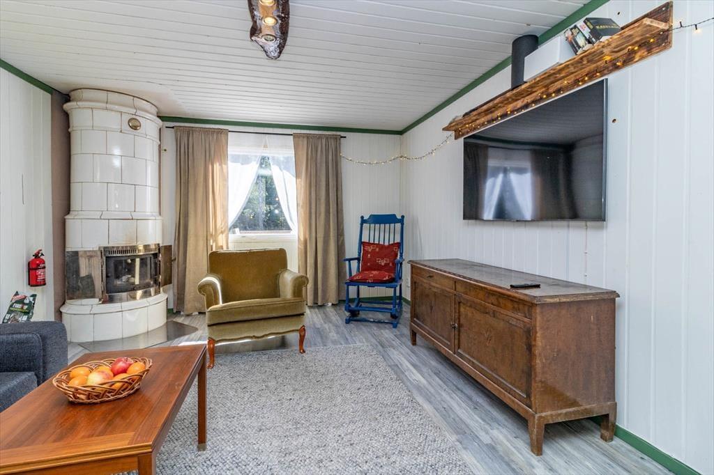 Auf 50 m² bietet das Haus genug Platz für 2 Erwachsene und 2 Kinder. Über fünf Treppenstufen erreichen Sie die große Holzterrasse, von der aus Sie in den Hausflur mit Garderobe treten. An dessen Ende liegt das Badezimmer mit WC und Dusche. Rechter Hand liegen die Küche und das Wohnzimmer in offener Verbindung zueinander. Neben einem 4-Platten-E-Herd, Ofen, Kühl- und Gefrierschrank, Mikrowelle und Kaffeemaschine verfügt die Küche über alles, was Sie zum Zubereiten und Servieren gängiger Gerichte für 4 Personen benötigen. Ihre Mahlzeiten nehmen Sie am größeren der beiden Esstische ein. Hinter dem großen Tresen liegt das Wohnzimmer mit einem gemütlichen Sofa, einem Sessel, einem nachträglich modernisierten historischen Kaminofen und einem Flachbild-Fernseher mit deutschen Programmen. Die Schlafplätze verteilen sich einerseits auf das seitlich vom Wohnzimmer befindliche Schlafzimmer mit Doppelbett sowie auf das Sofa im Wohnzimmer, das für zwei Kindern zum Schlafsofa ausgeklappt werden kann. Für saubere Kleidung sorgt die Waschmaschine befindet sich im Keller. Von der Küche führt eine Tür in den Garten und zur kleineren Terrasse hinter dem Haus, auf der Sie bei warmem Wetter den Grill anzünden und Ihre Mahlzeiten oder ein Getränk am großen Gartentisch genießen können. Dort lädt sogar eine holzbeheizte Badetonne mit Whirlpool-Funktion zu authentisch-skandinavischen Wellness-Stunden ein.
