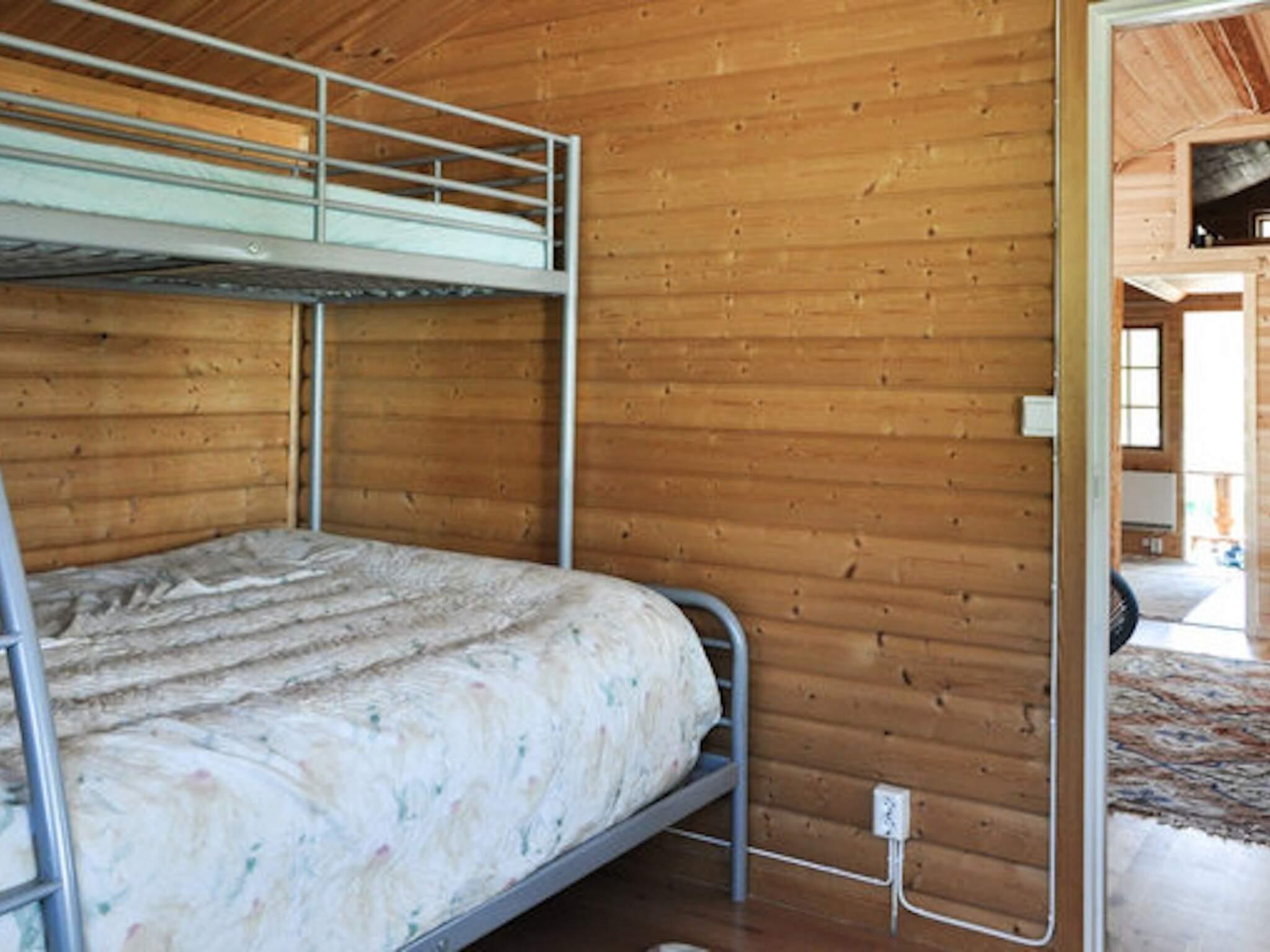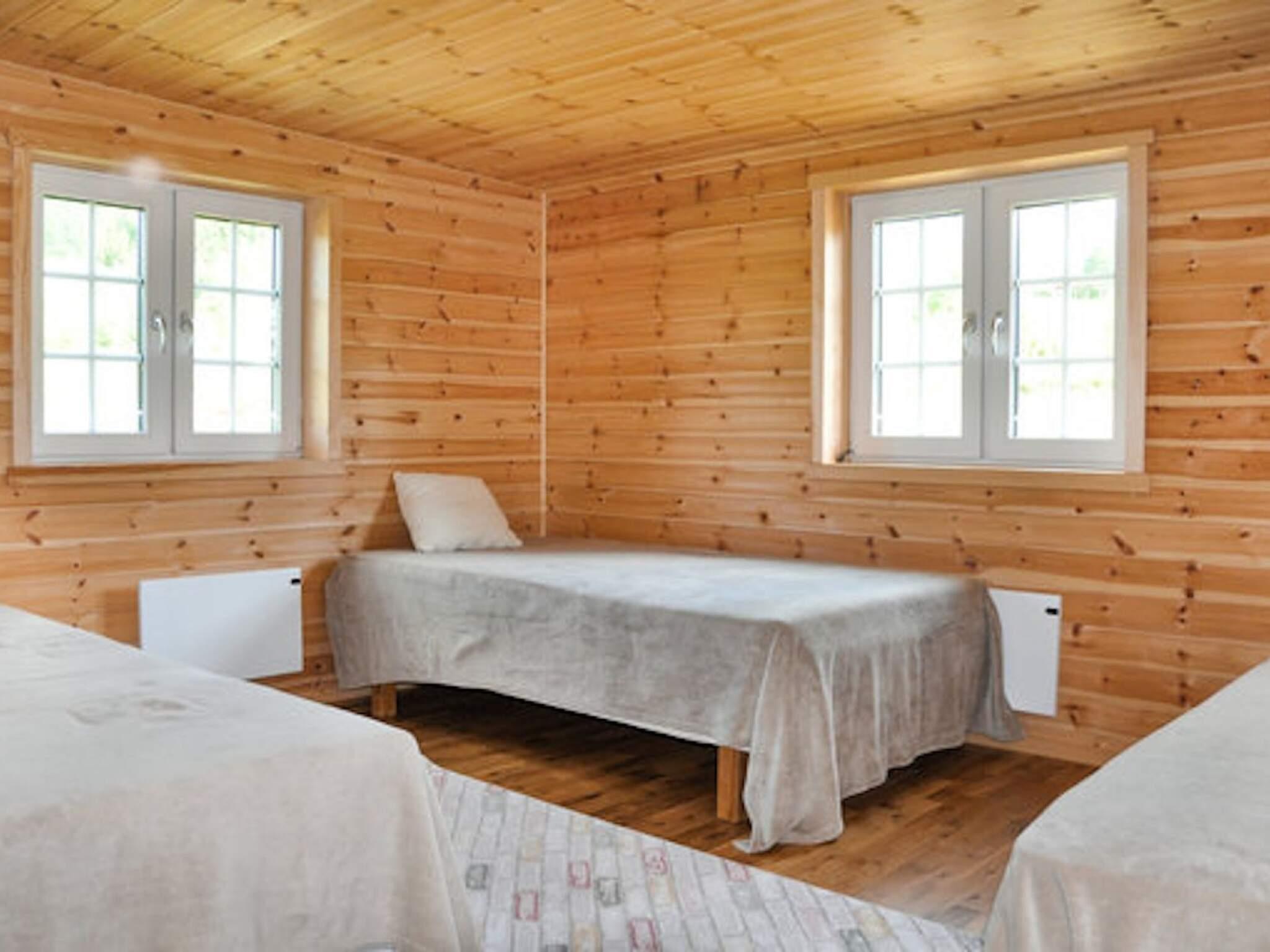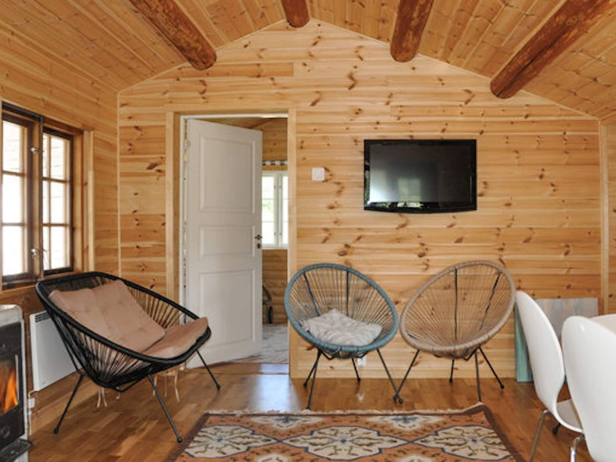 Im Inneren finden Sie eine gut ausgestattete Küche, die an ein Wohnzimmer mit Essbereich, ein paar Sesseln und einem Fernseher angrenzt. Es gibt zwei separate Schlafzimmer – eines mit drei Einzelbetten und das andere mit einem 140 cm breiten Doppelbett und einem darüberliegenden Einzelbett. Das Badezimmer ist mit Dusche, WC und Waschbecken ausgestattet.