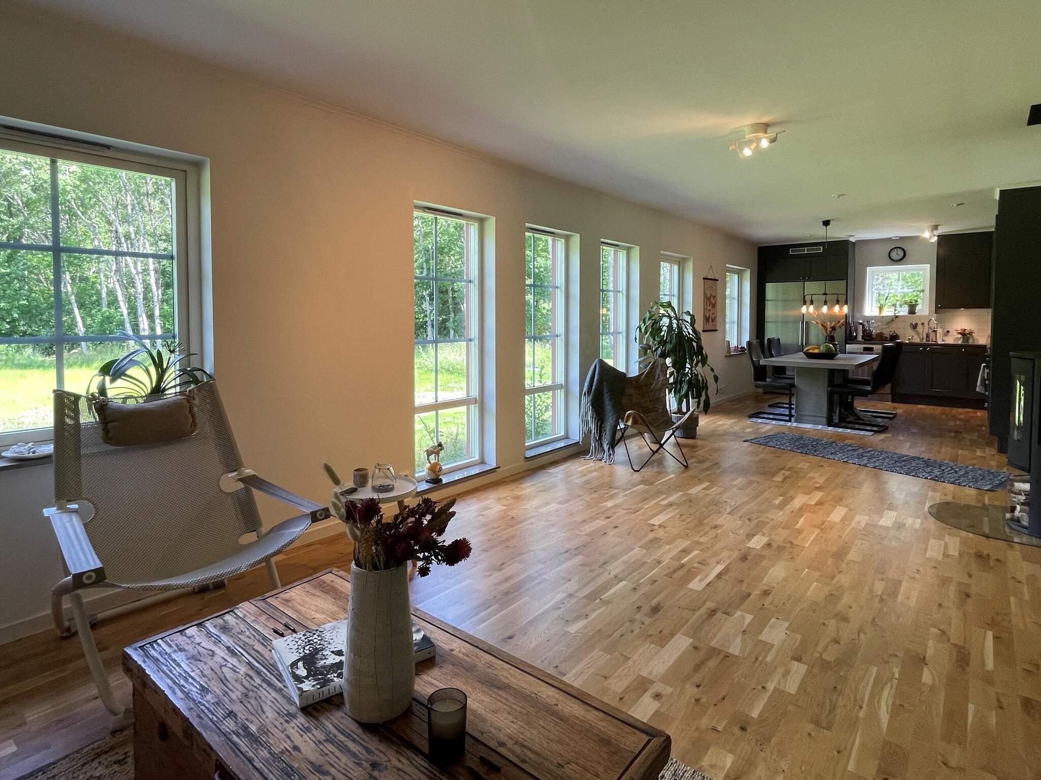 Der Eingang befindet sich an der Vorderseite und führt in eine geräumige Diele mit viel Stauraum. Es gibt zwei Schlafzimmer; eines mit einem 140 cm breiten Bett, das zweite mit einem Etagenbett (unten 120 cm, oben 80 cm breite Liegefläche). In diesem Zimmer befindet sich auch eine schöne Infrarotsauna für zwei Personen sowie ein kleiner Fitnessraum für alle, die auch im Urlaub trainieren möchten. Es gibt eine offene Küche mit Essbereich und Blick sowohl zur kurzen Seite als auch zur Rückseite des Hauses. Geräumiges Wohnzimmer mit großem 65-Zoll-Fernseher, Sofa und Sessel sowie großen, schönen Fenstern nach hinten.