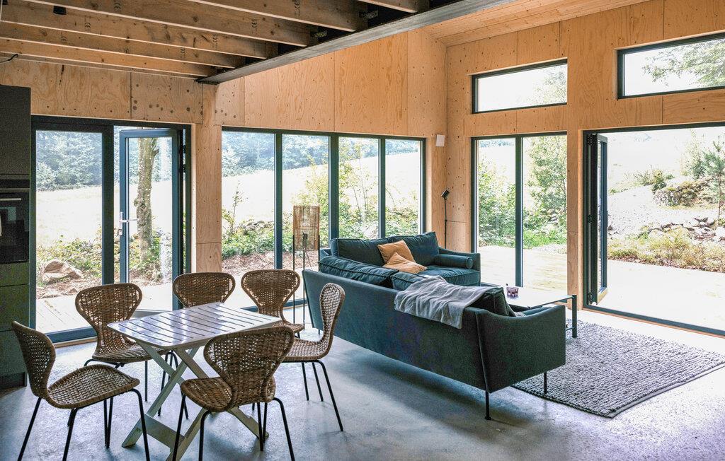 Das komfortable und moderne Haus empfängt Sie in fantastischer Lage und fügt sich harmonisch in die Natur ein. Dank bodentiefer Fenster genießen Sie bei Ihren Aktivitäten im Wohnbereich einen herrlichen Blick ins Freie. Versammeln Sie sich zu einem guten Abendessen um den Esstisch und genießen Sie den Blick auf den Wald, während Sie in der Sauna oder auf dem Sofa entspannen.
